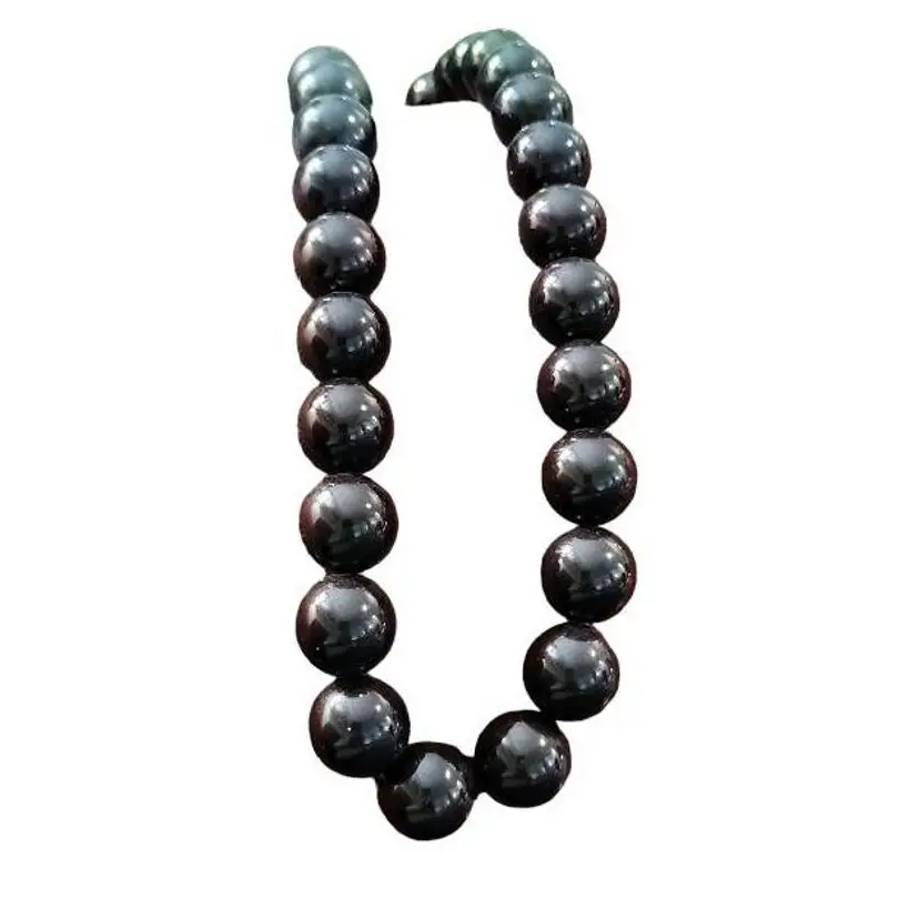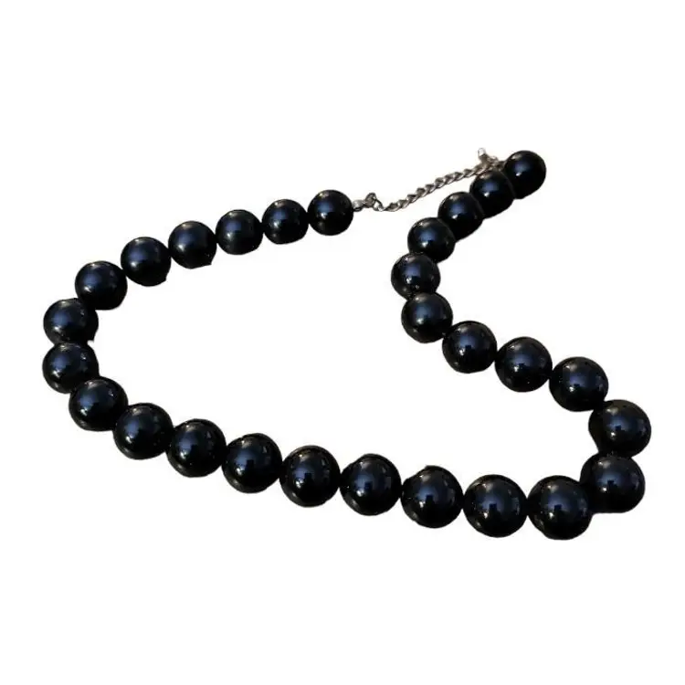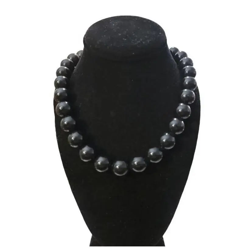 This 17-19" Black Choker Necklace has a touch of green across each of the beads. This is subtle but striking when seen when the light hits it right. It has an older looking lobster clasp and simple chain at the back. I believe that the beads are acrylic. Goes with so many other necklaces for a layered look.