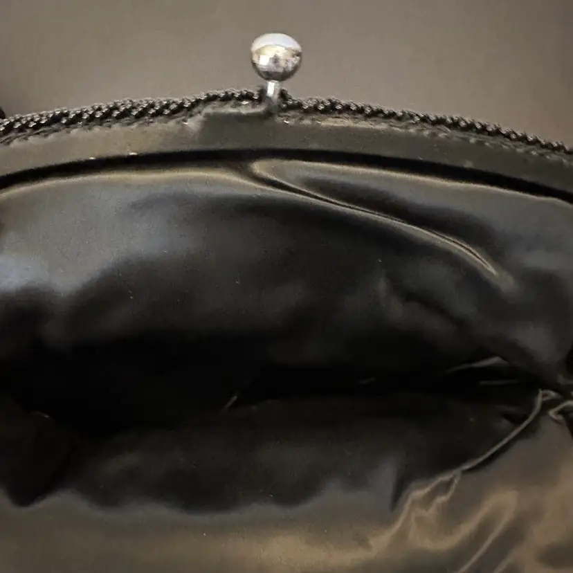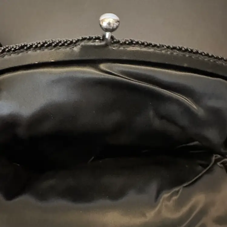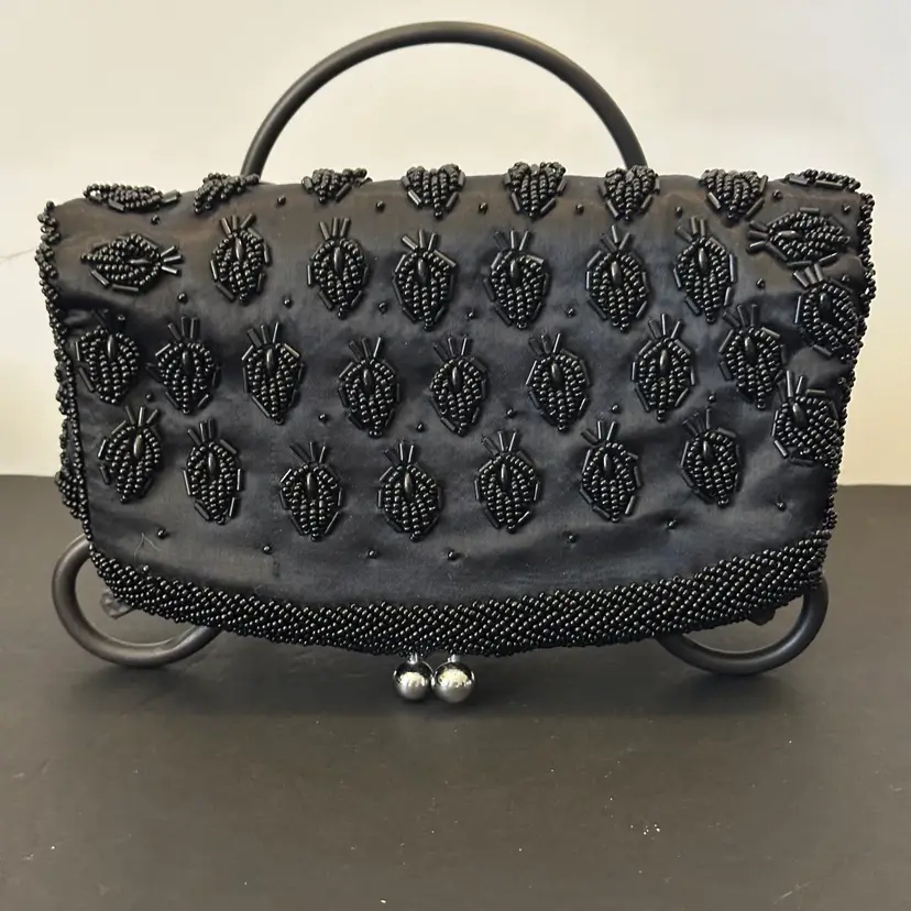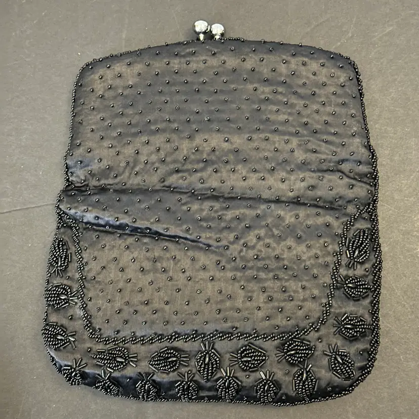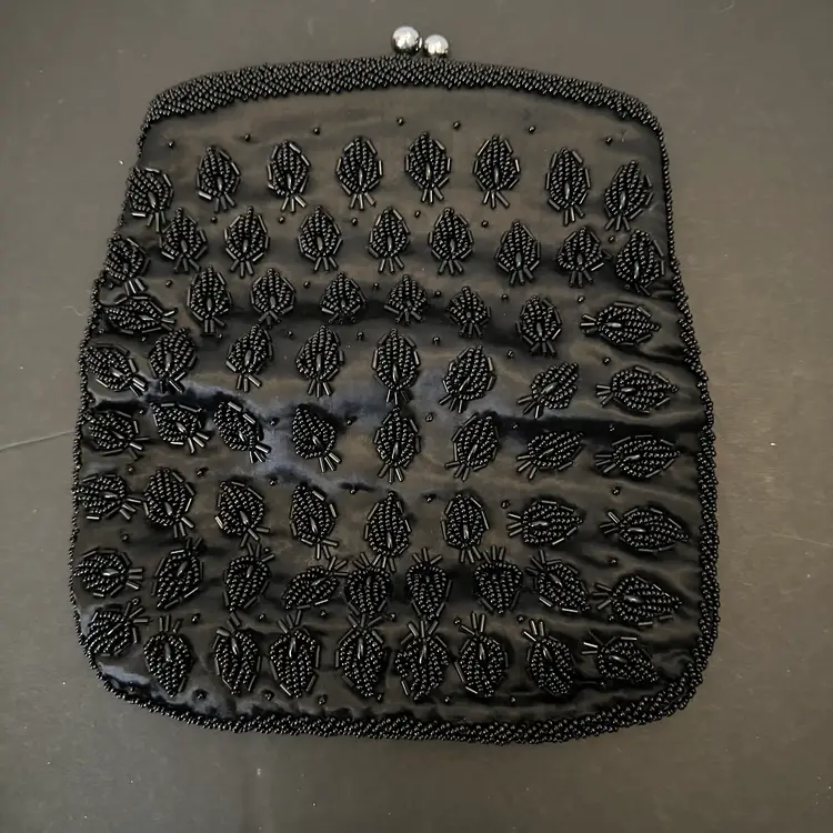 This black beaded evening handbag is similar to vintage-inspired handcrafted beaded clutches often used for formal events or weddingsh