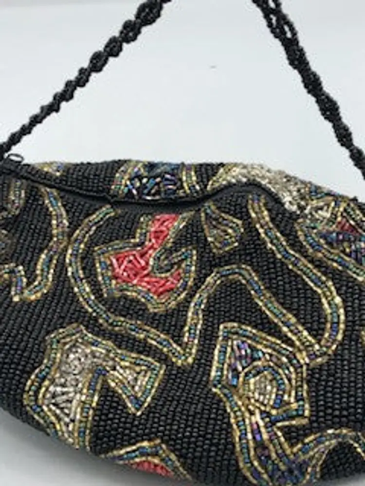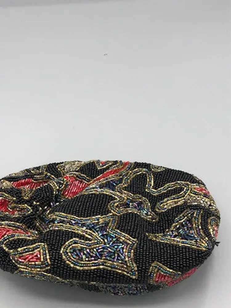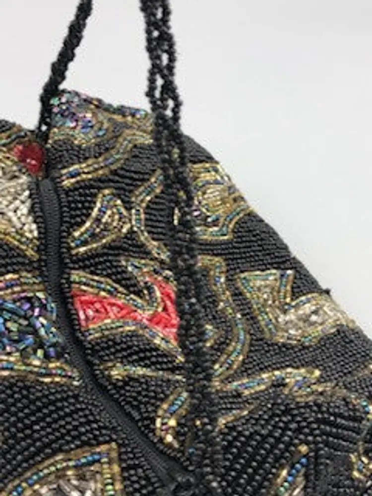 Black beaded purse that has black, red and gold beads. This is a statement bag that would look amazing at any occasion.
