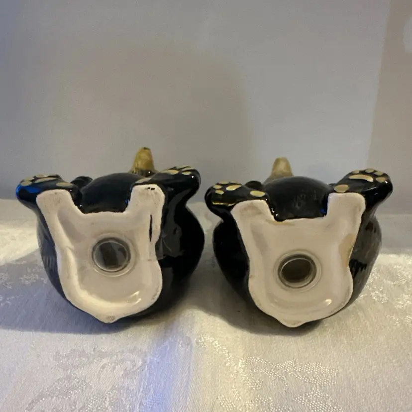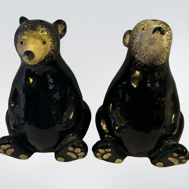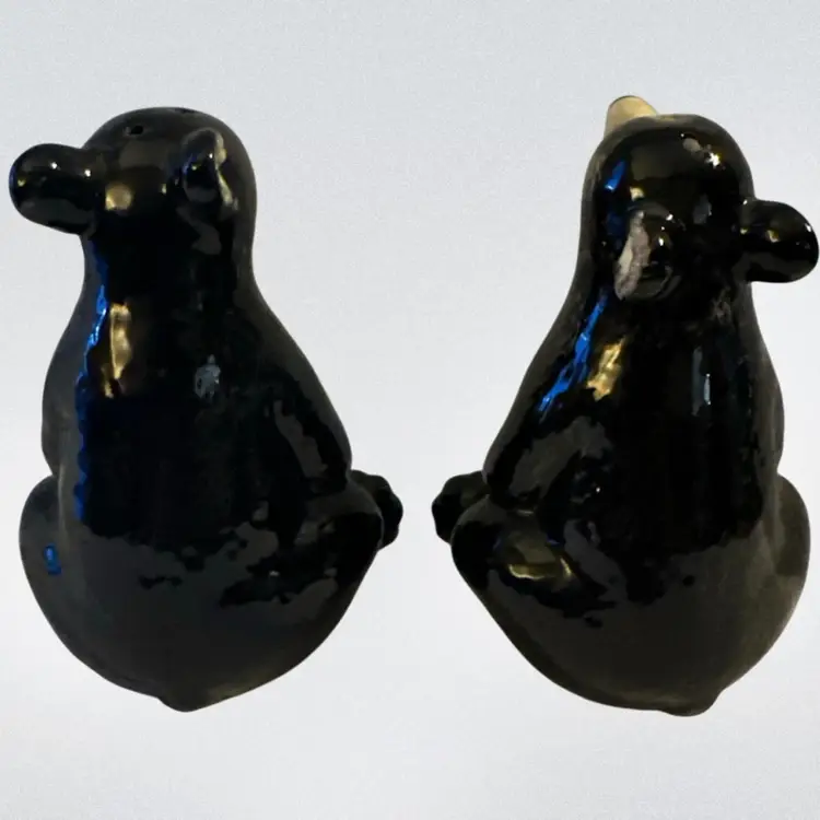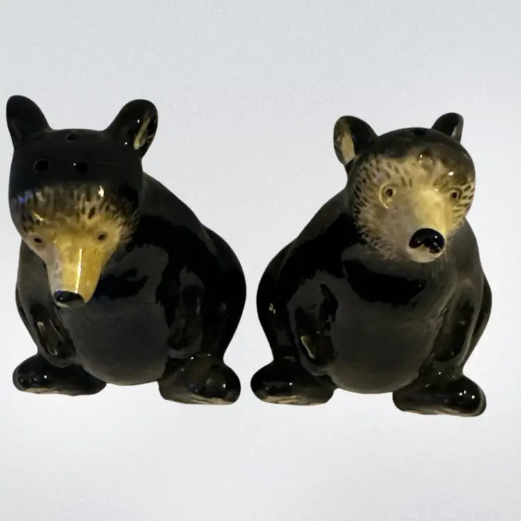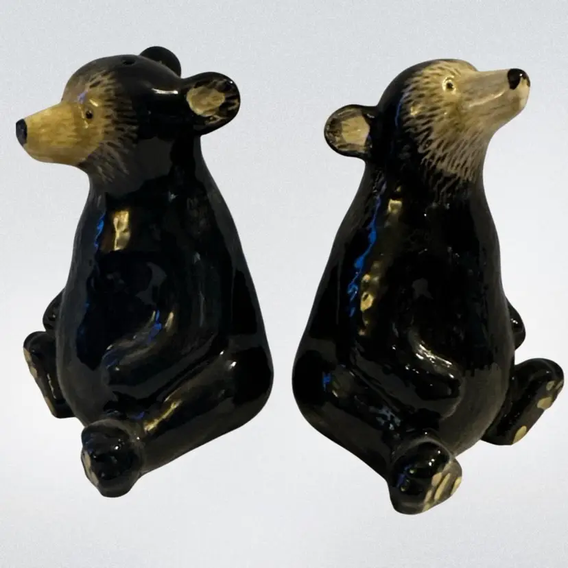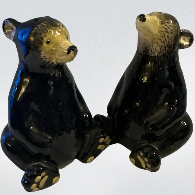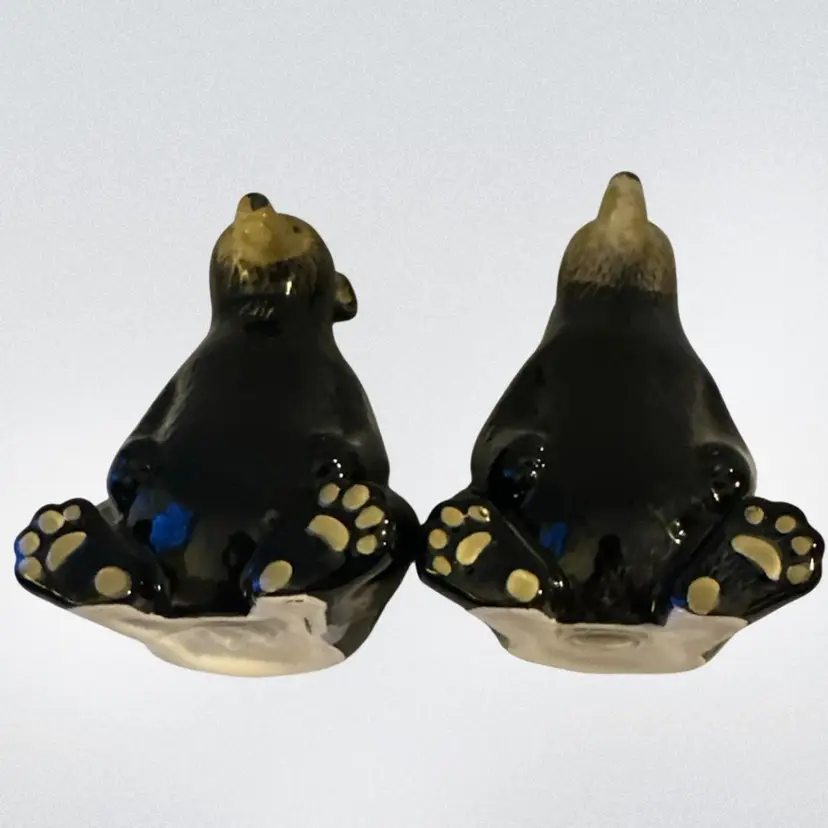 This product is a set of black bear salt and pepper shakers with a tan face and paws, made of ceramic and featuring a rubber stopper. The shakers are designed in a bear style with a lodge style, perfect for any occasion. The set includes a pepper shaker and a salt shaker, both medium in size and easy to clean. Manufactured in China between 2000-2009, this original animal-themed collectible from Salt Shaker Collection adds a fun and unique touch to your kitchen, cabin or camper. Excellent unused condition.