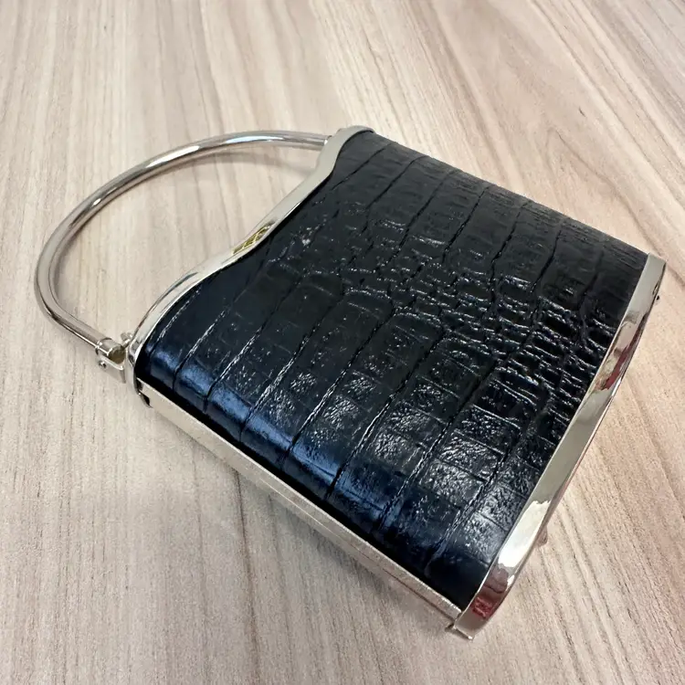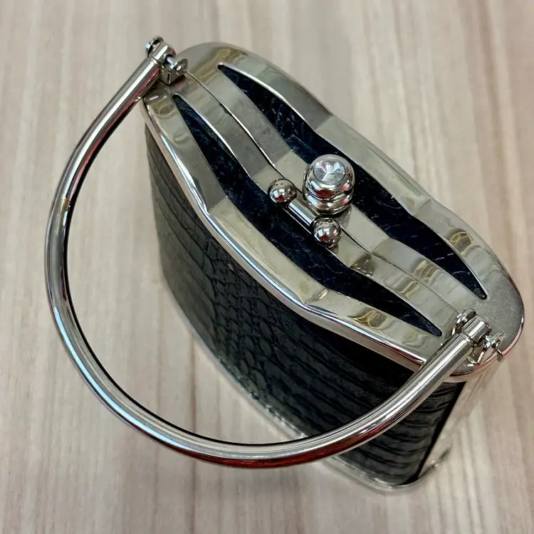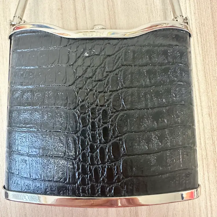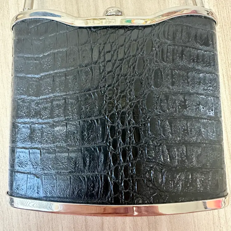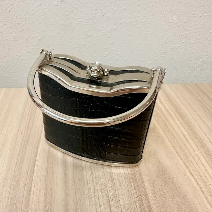 This listing is for this gorgeous Black Bijoux Terner Hardshell Mini purse. It has silver tone hardware and a snap closure. This vintage piece from the 1980s features a faux crocodile design in black, adding a touch of sophistication to any eveningwear outfit.