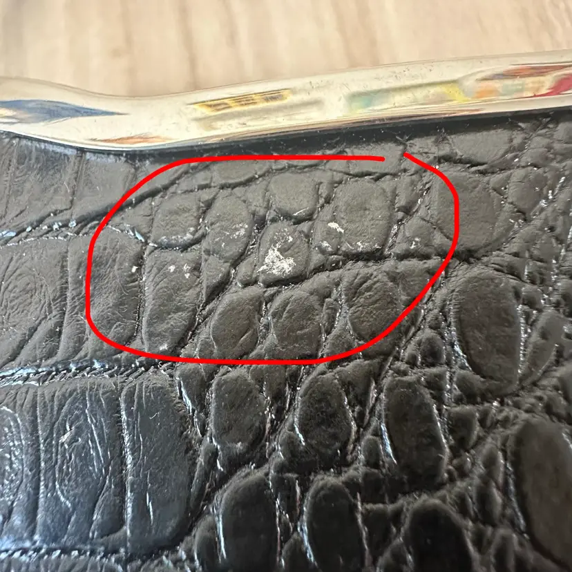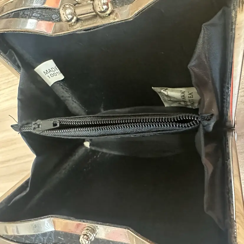 It is in excellent vintage condition, no major scratches or tears. There is some very light wear on one of the sides, (see photo) consistent with age, but barely noticeable. the inside has 3 compartments. The inside lining has a little bubbling but it’s not peeling off at all. However, one of the inside corners is bent.