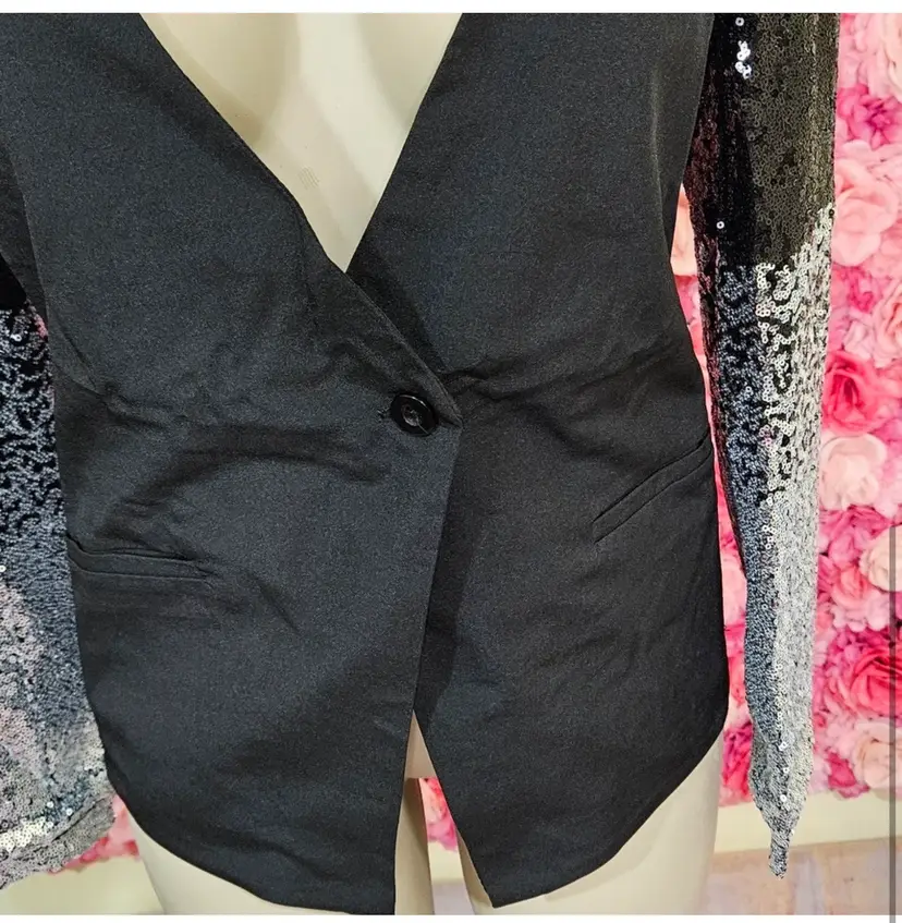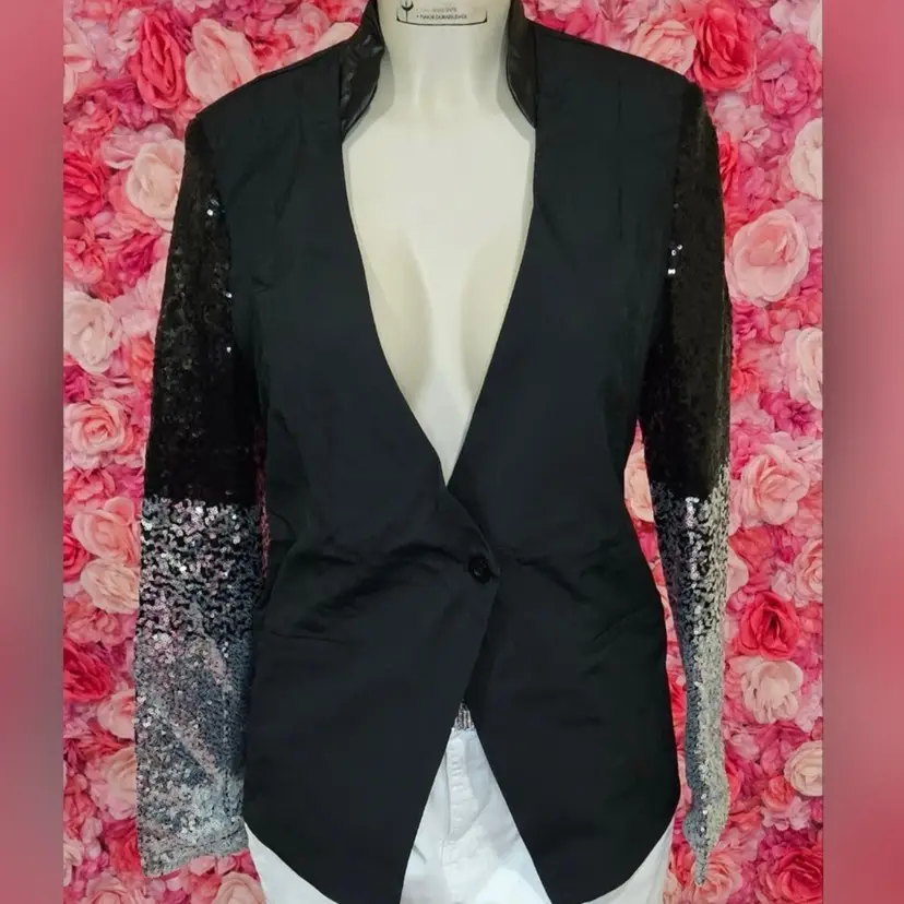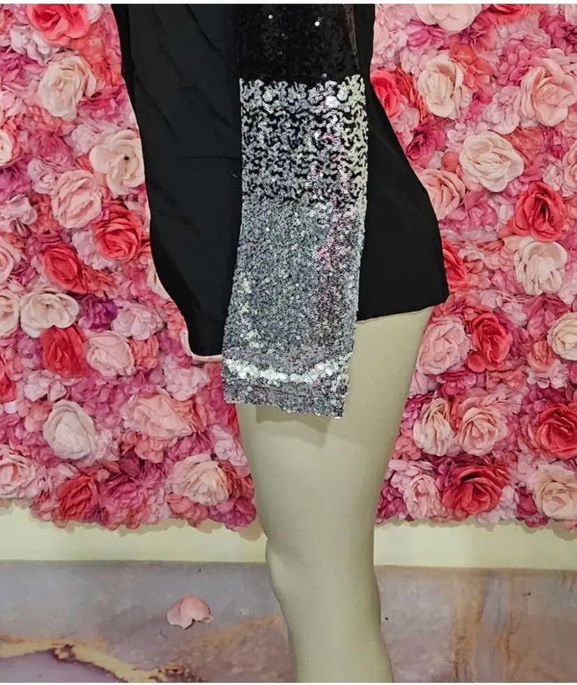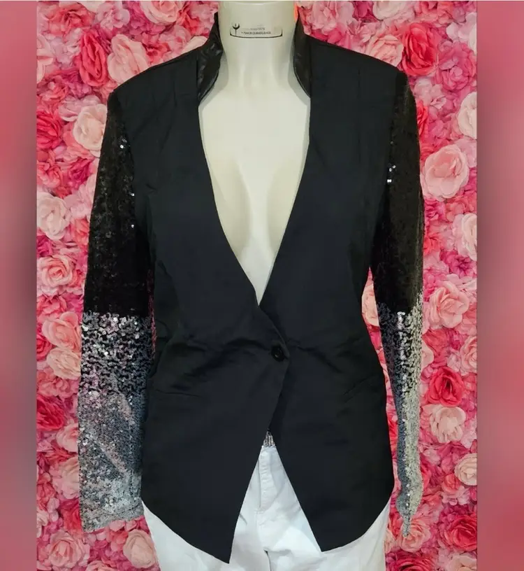Elevate your evening wardrobe with this sleek black blazer featuring a unique twist—sleeves covered in shimmering sequins that graduate from black to silver. The single-button closure and tailored fit create a flattering silhouette that's both bold and sophisticated.