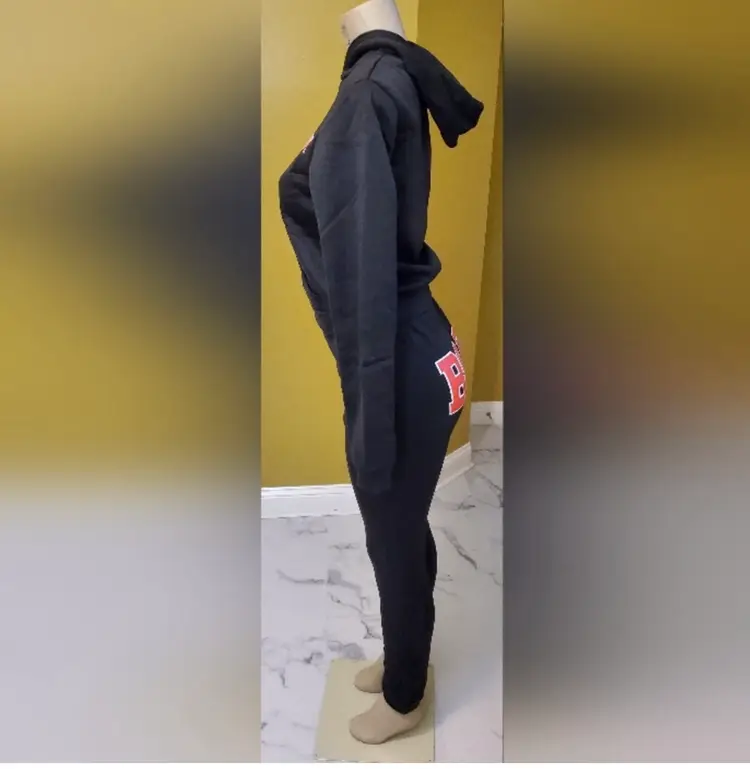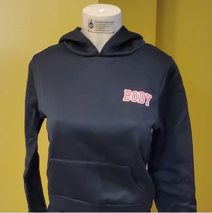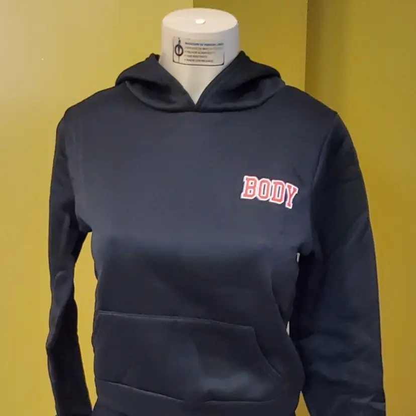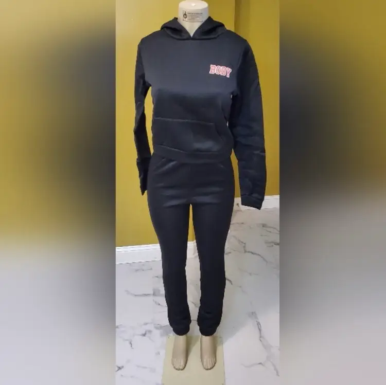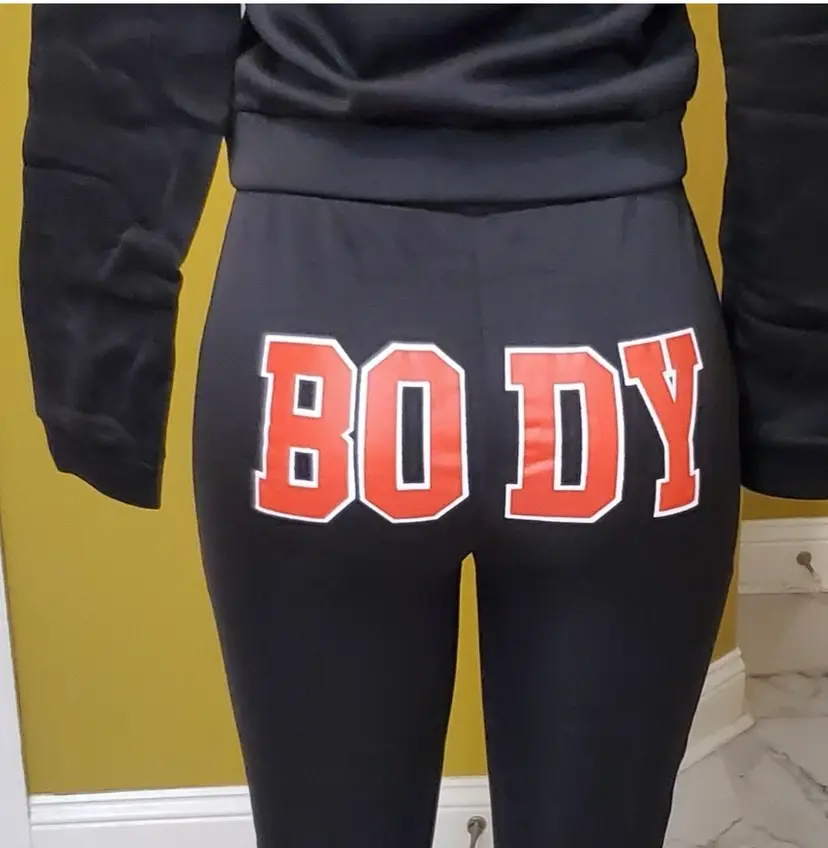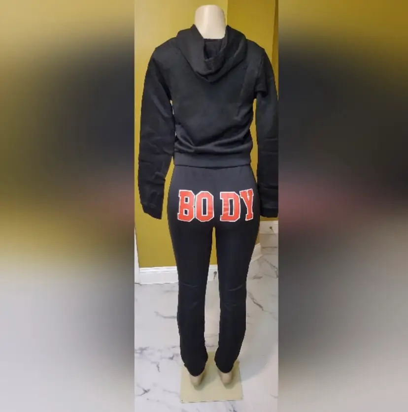 Slip into effortless comfort with this sleek black two-piece set, featuring a cozy hooded sweatshirt and matching fitted pants. The standout "BODY" lettering adds a fun, sporty vibe to both the front chest and back hip areas, giving you a casual yet eye-catching look for lounging or casual outings.(NOTE:(size do run smaller than actual size)
