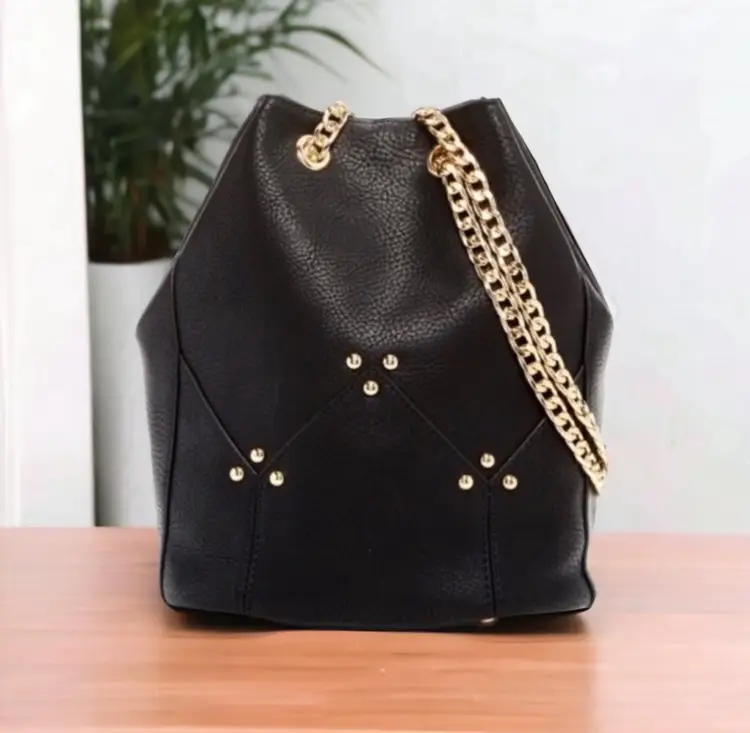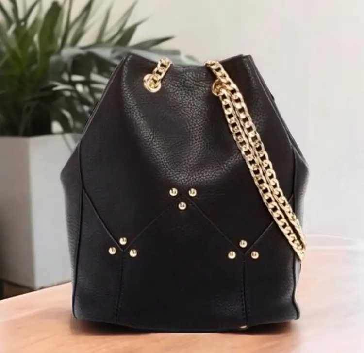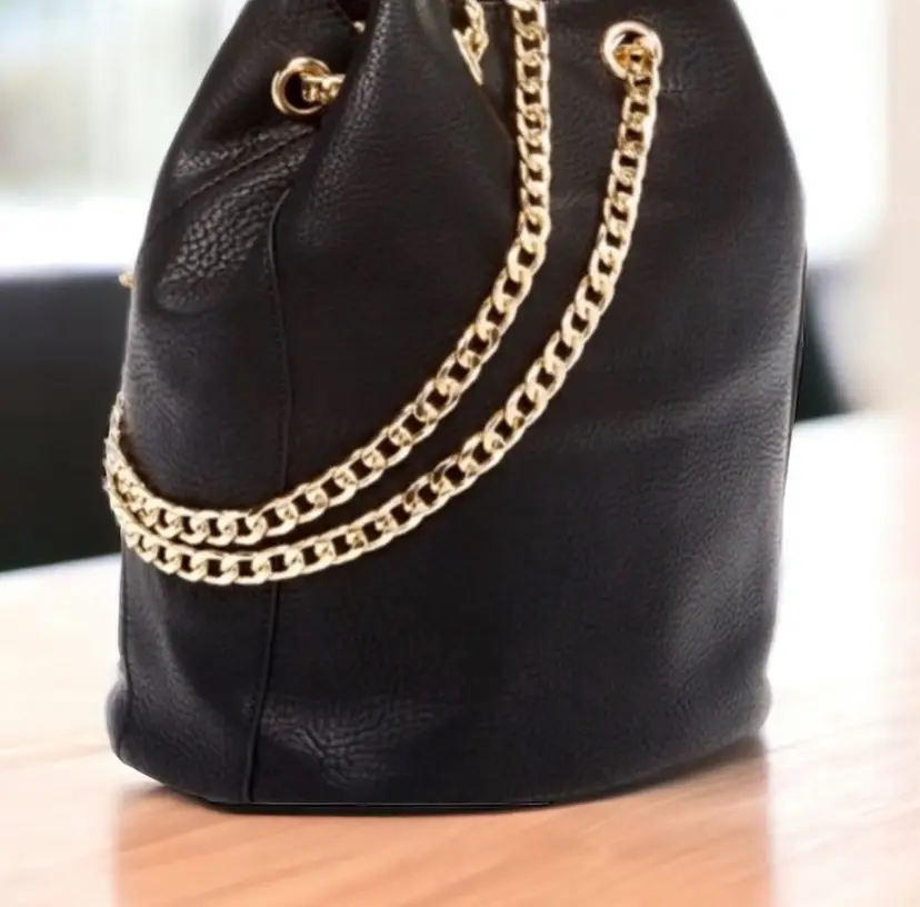 Bucket Style bag with lux design all hardware is gold tone. Bold and also understated. Can go from casual , to office , or a night out. Vegan leather black interior