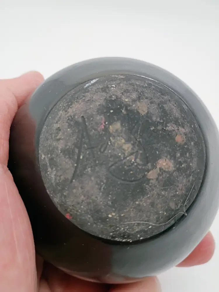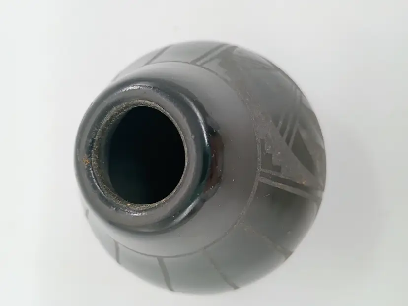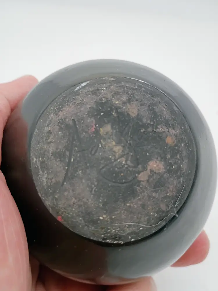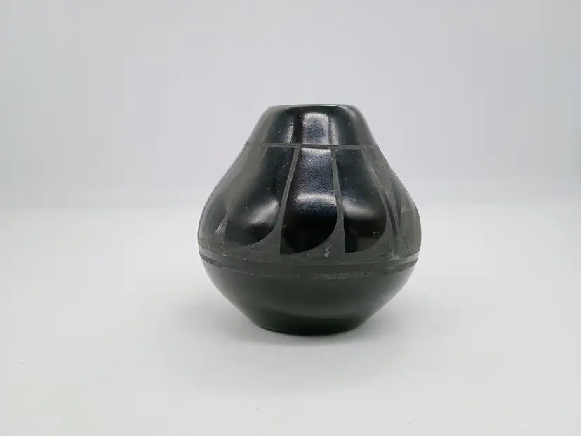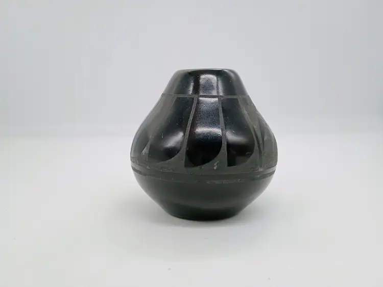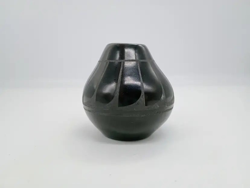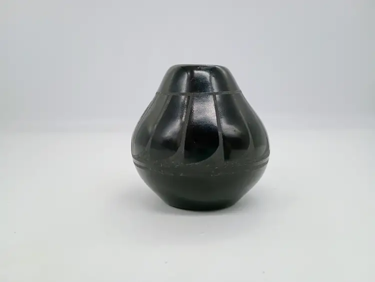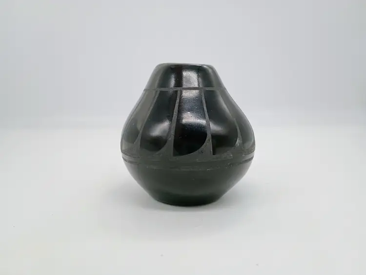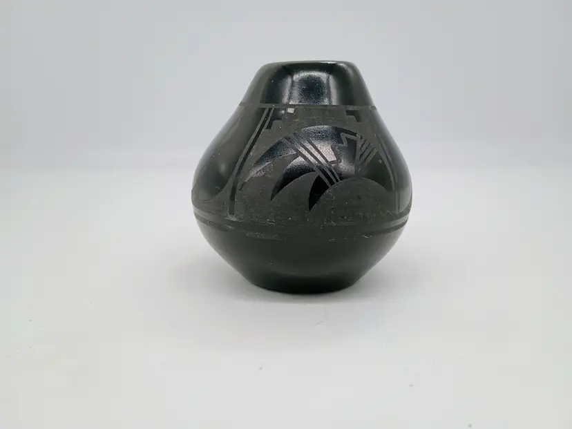 Black Clay Barro Negro Pottery Etched Bud Vase Signed Oaxaca Mexico Vintage. This is 3 inches tall and at widest diameter. It's signed I can make out Ad F????? might be Flores. This is preowned no chips cracks or fleabite. Geometric etched designed. Artist signed on bottom. Excellent condition. Ships USPS domestically and UPS/ USPS International Shipping globally