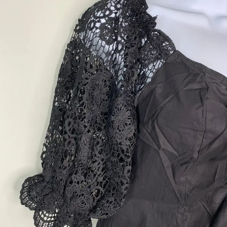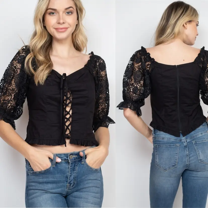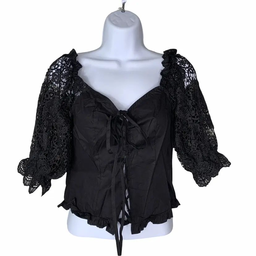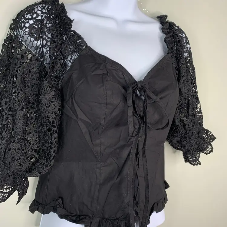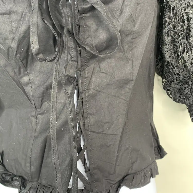 Black Corset Top With Long Lace Sleeves Bow in front, zips up back, witchy, y2k New with tags Trendy, witchy, goth, cute Boutique Brand: Available Cotton, hand wash hang dry Women's Medium - has some give, slightly stretchy otherwise form-fitting