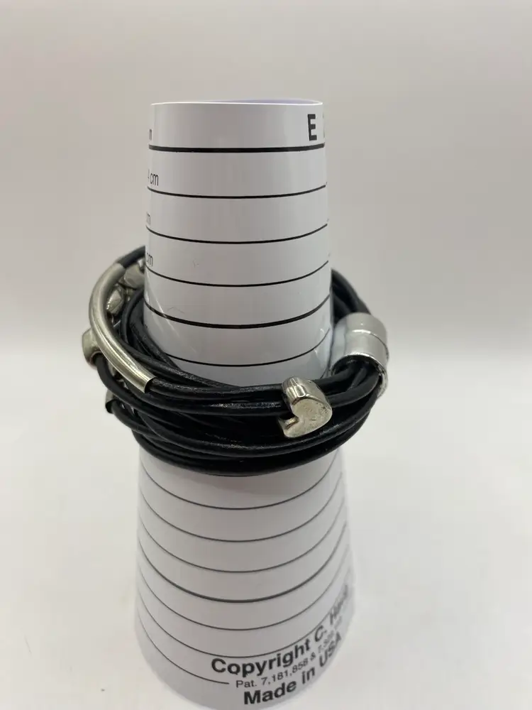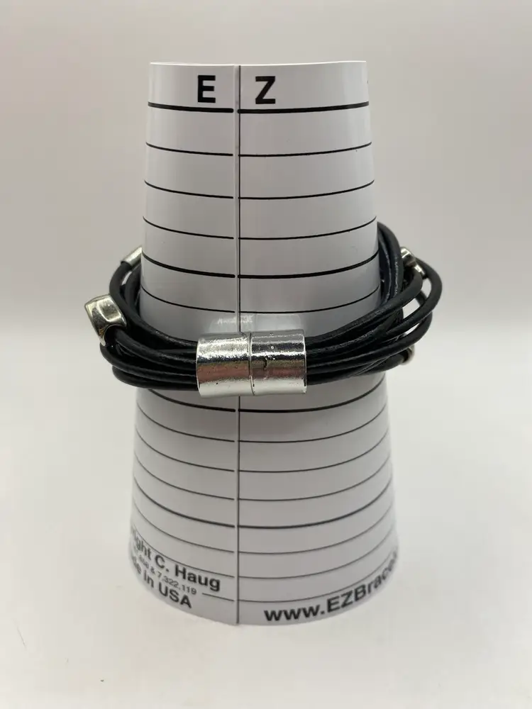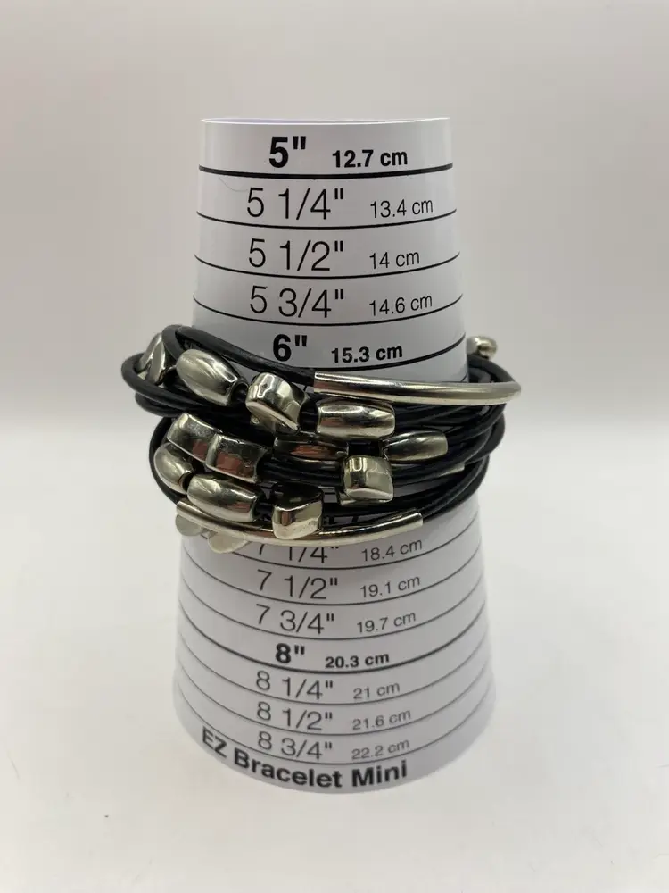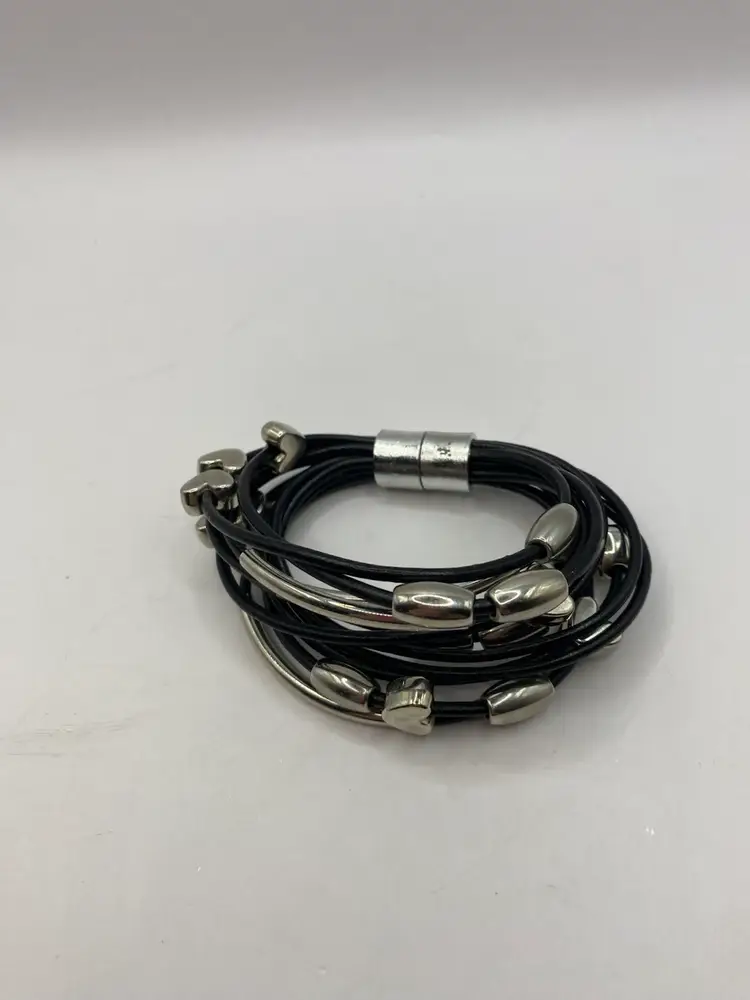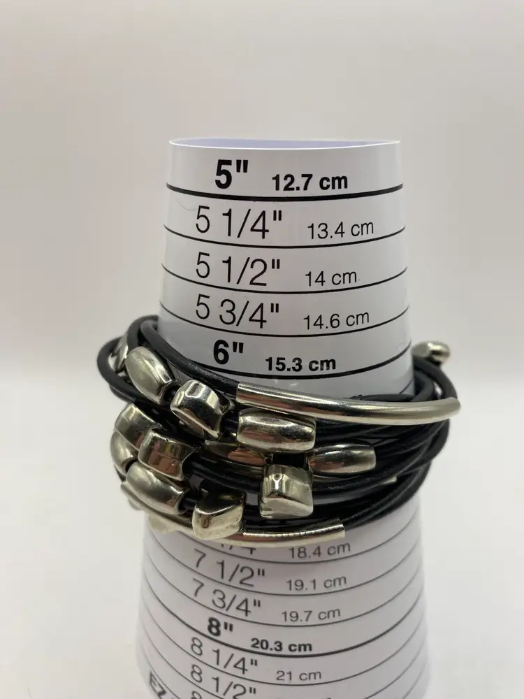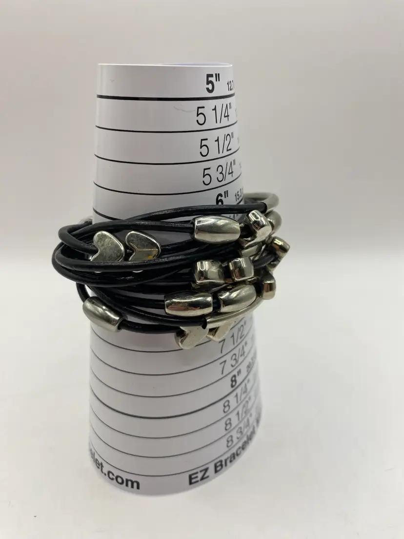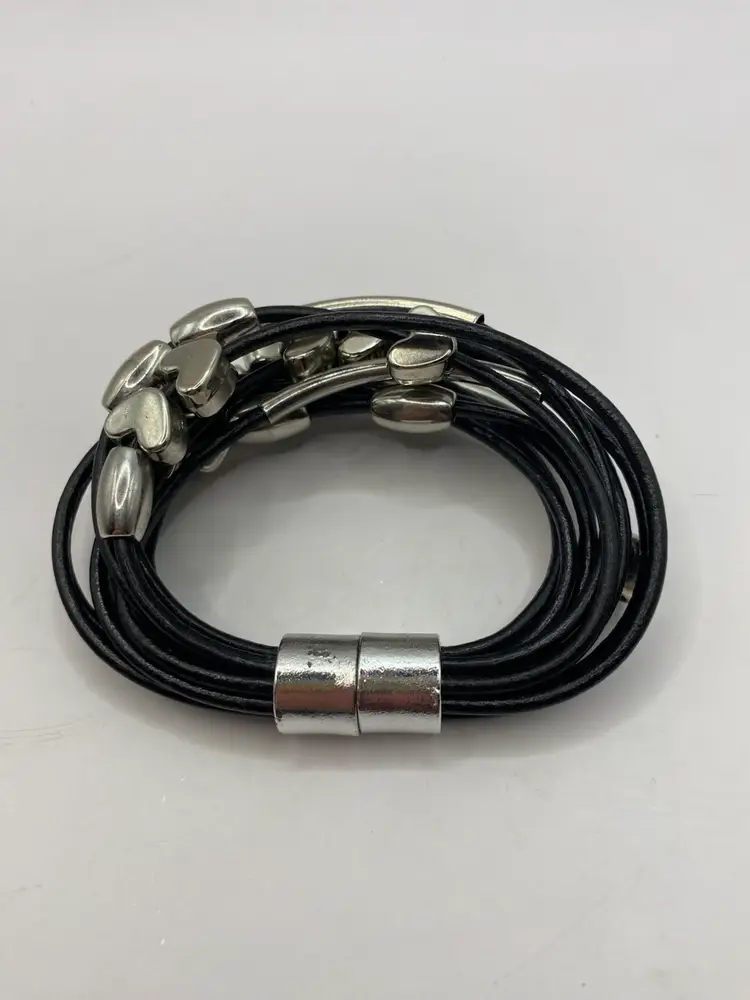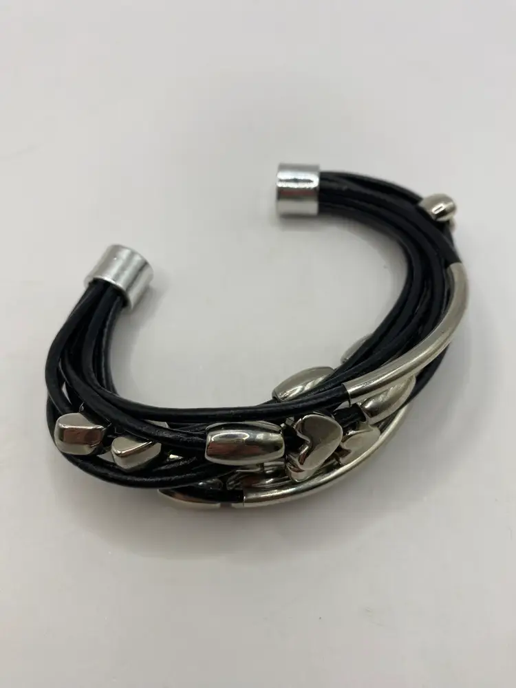 This black faux leather cuff bracelet features a magnetic closure and silver tone heart shaped and oblong beads for a punk-inspired look. The bracelet is designed in a cuff style and adorned with bead charms. It is 7 inches in length and made of faux leather, adding a touch of edginess to any outfit.