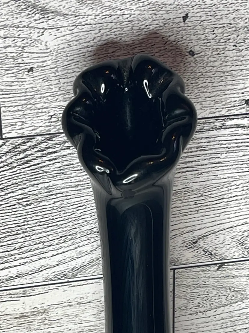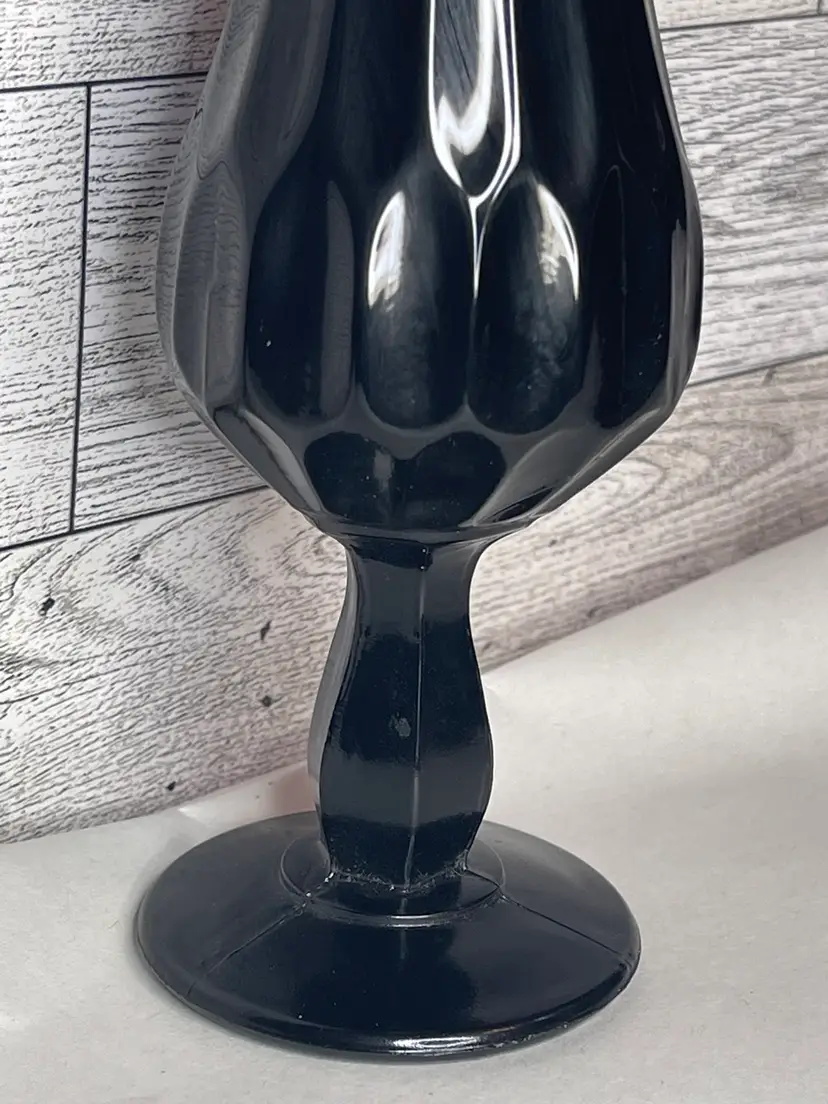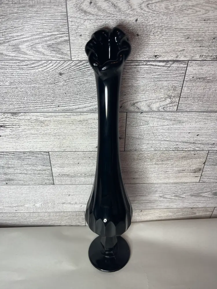 12 inch, black, Fenton Swung vase. Beautiful and sleek,sure to match any style, would look good in any collection or pair it with a bittersweet for spooky season decorating! Judging by the logo, I’m guessing this vase dates to the 1970’s. No chips or cracks, measures 12 inches tall and approximately 3 inches at its widest point.