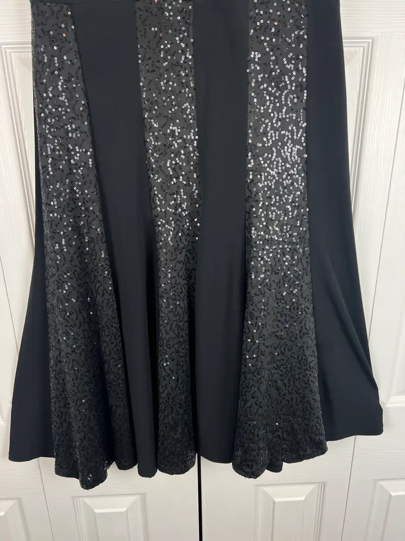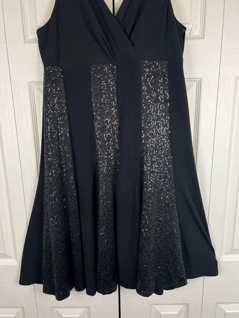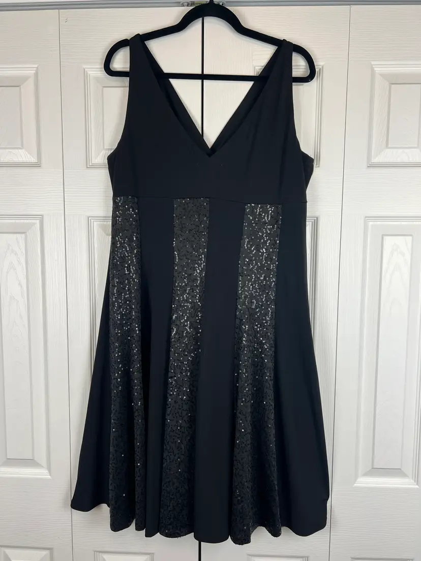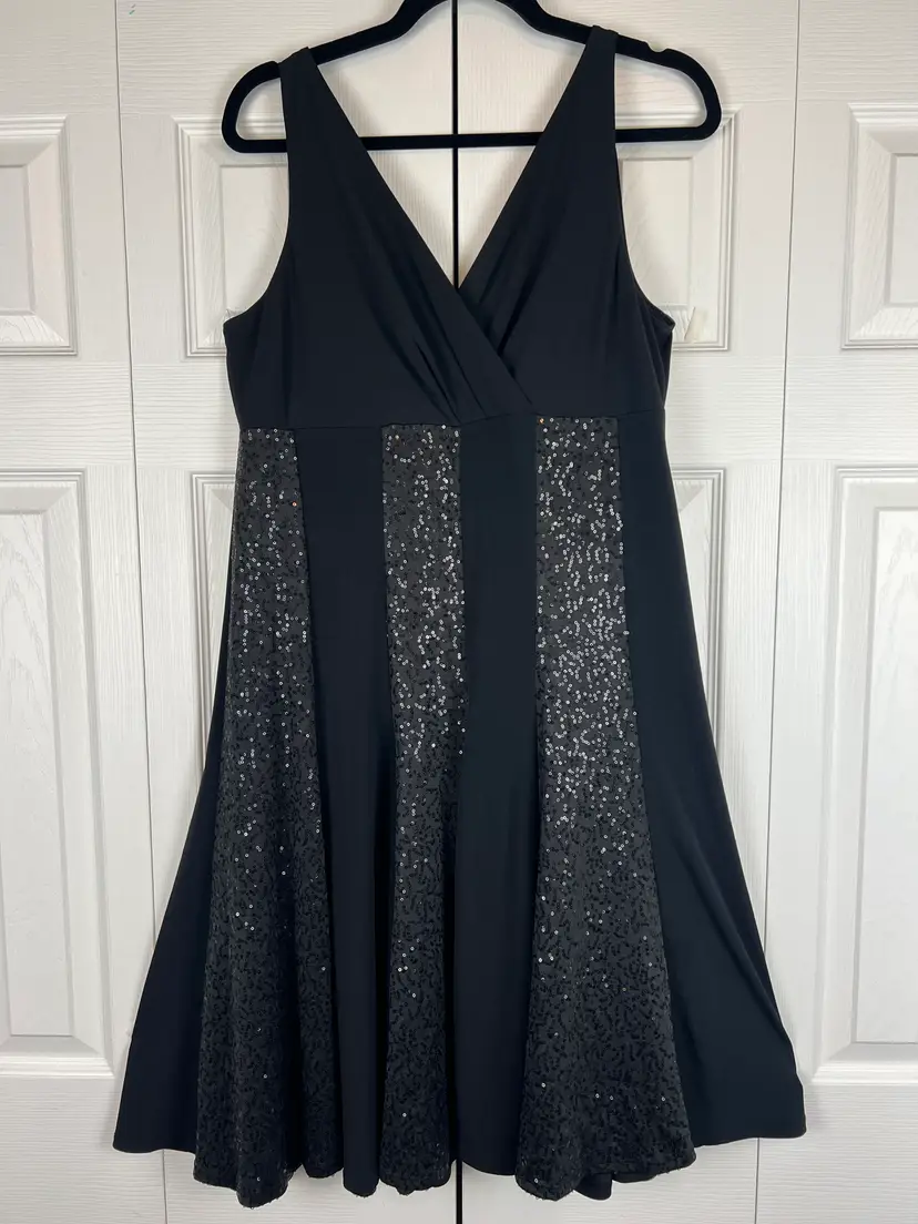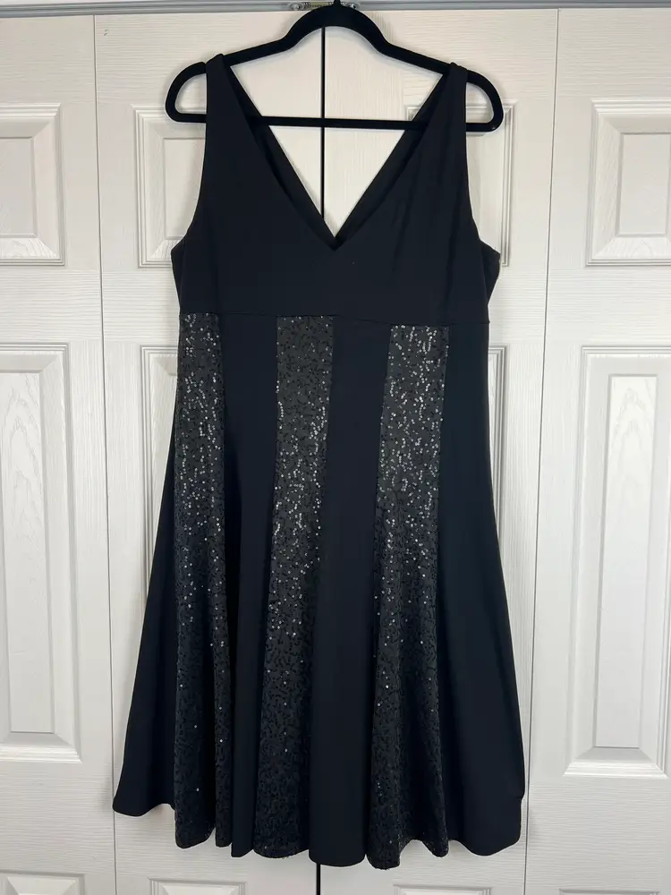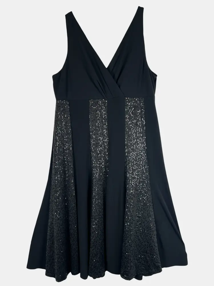 Black fit & flare dress with flattering V-neckline and vertical sequin panel detailing for subtle shimmer. Stretch fabric provides a comfortable, curve-skimming fit.