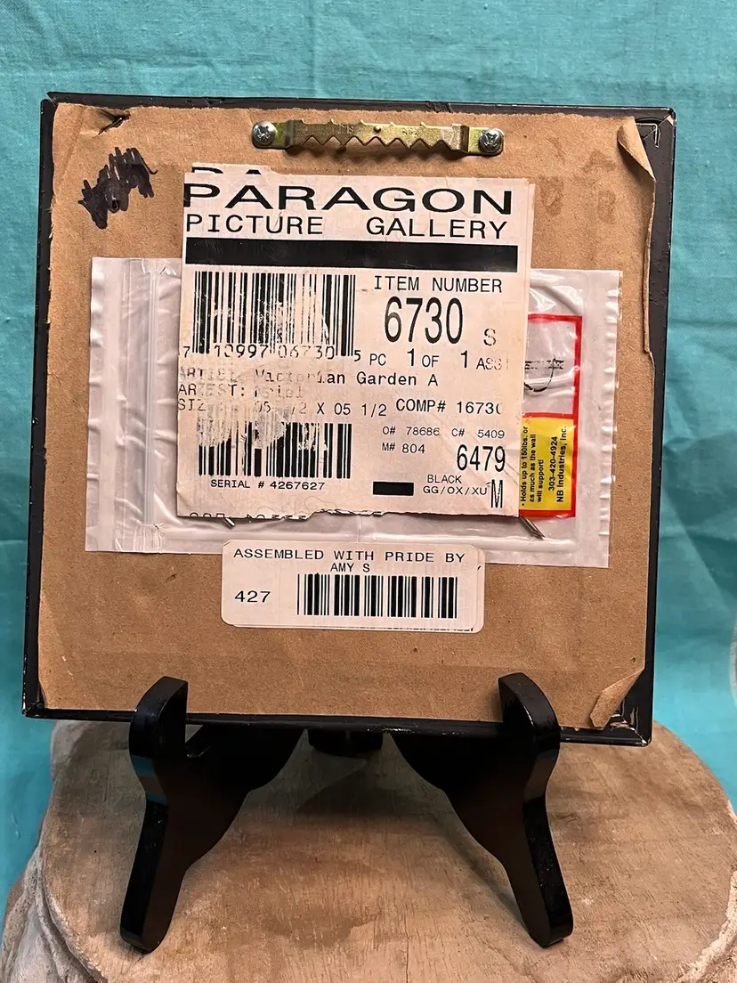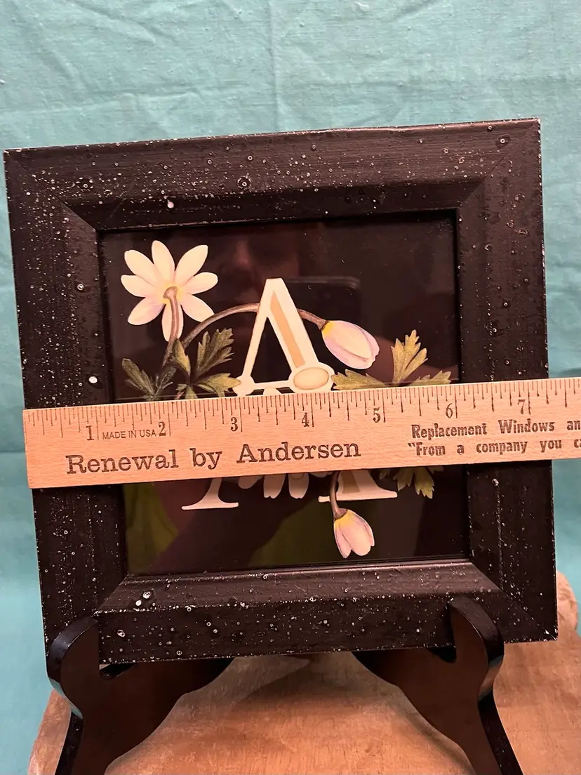#49. Black Framed Victorian Garden initial “A” With Black Picture Stand. Art measures 5.5”x 5.5”Measurements with frame is 7.25” x 7.25”