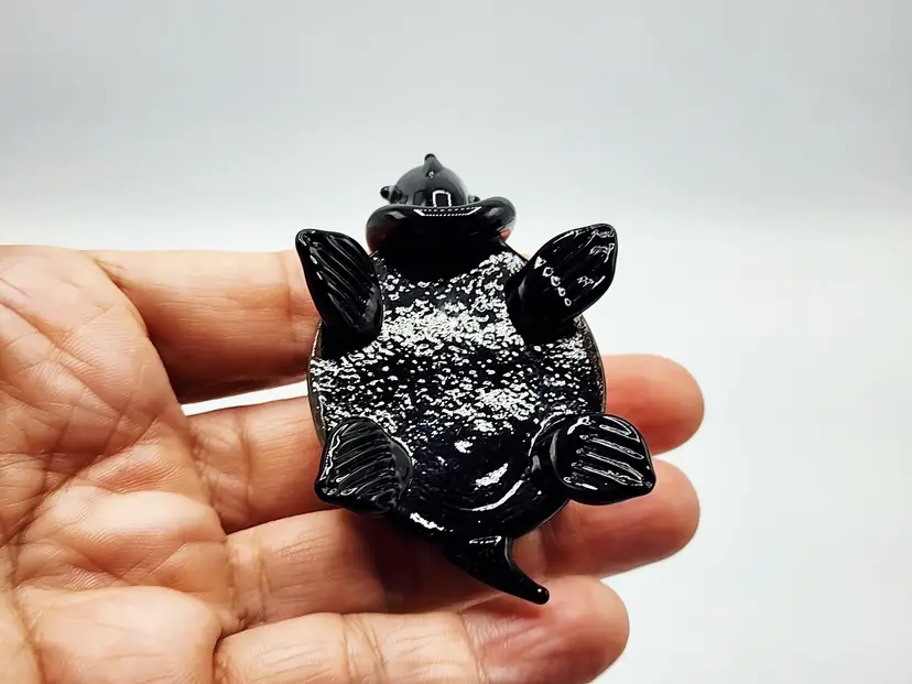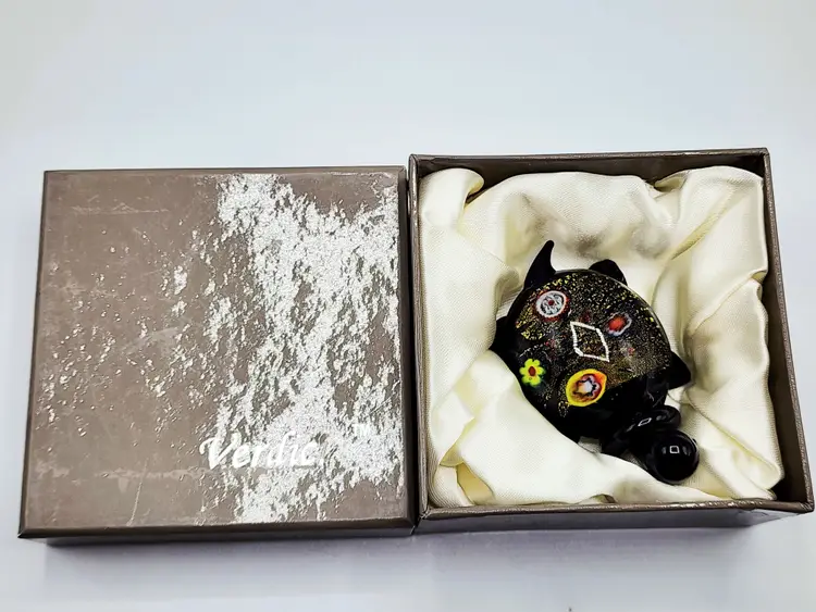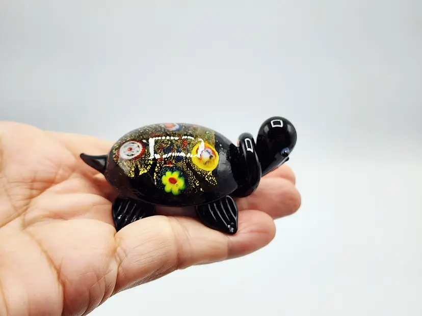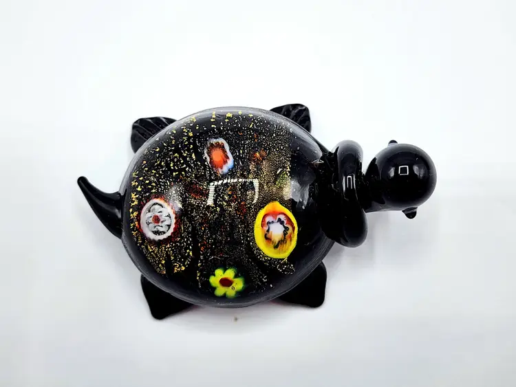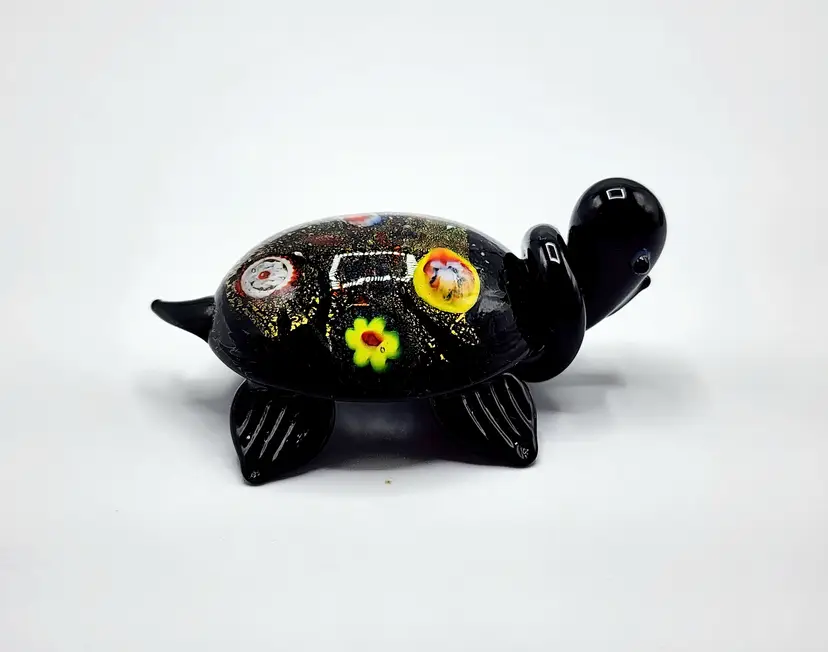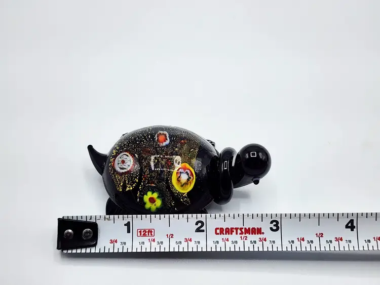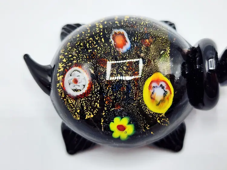 Black Glass Millefiori Art Glass Turtle Figurine by Verdici Design, with original box. Very good condition, 2 1/2" long.