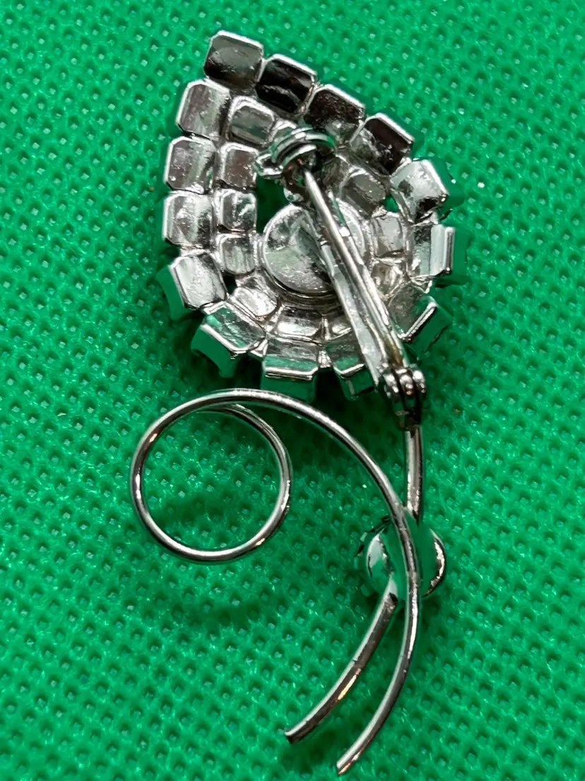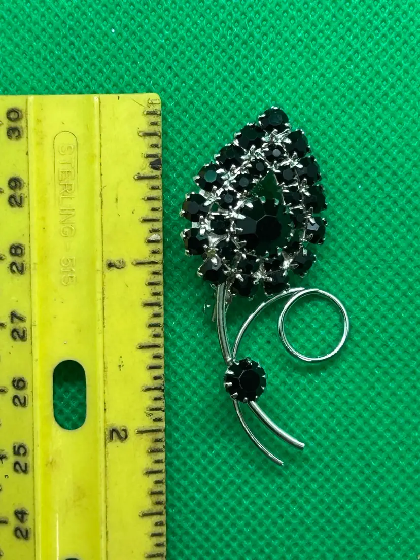 Add a touch of vintage glamour to your outfit with this stunning black rhinestone flower brooch pin. The delicate floral design is accentuated by the round, black glass stones that shimmer in the light. The brooch is made of high-quality materials and has a prong setting style that ensures it stays securely in place. In excellent vintage condition. Please see photos as they are part of the description . Thank you for looking!