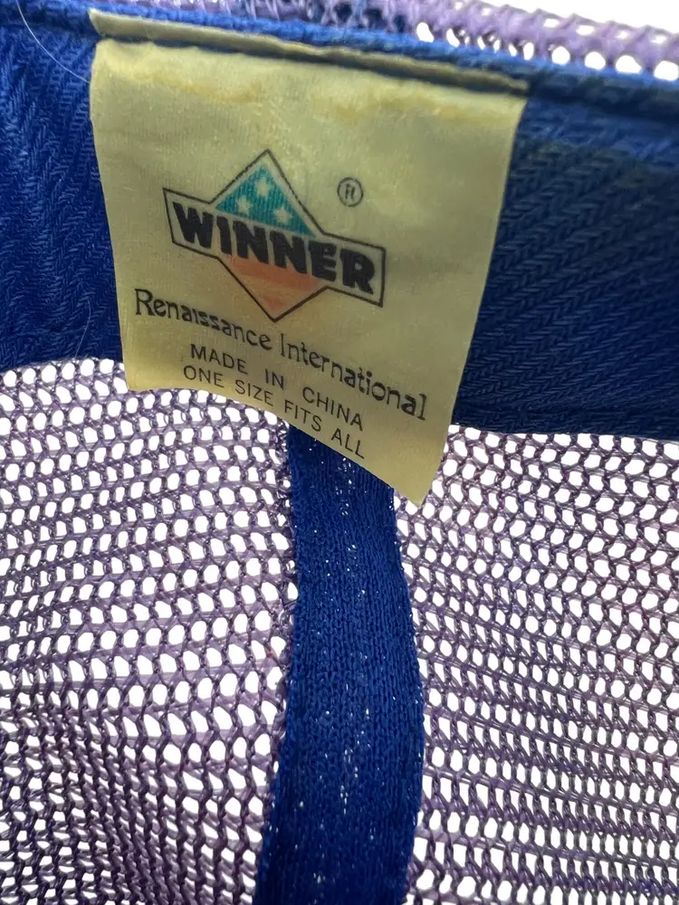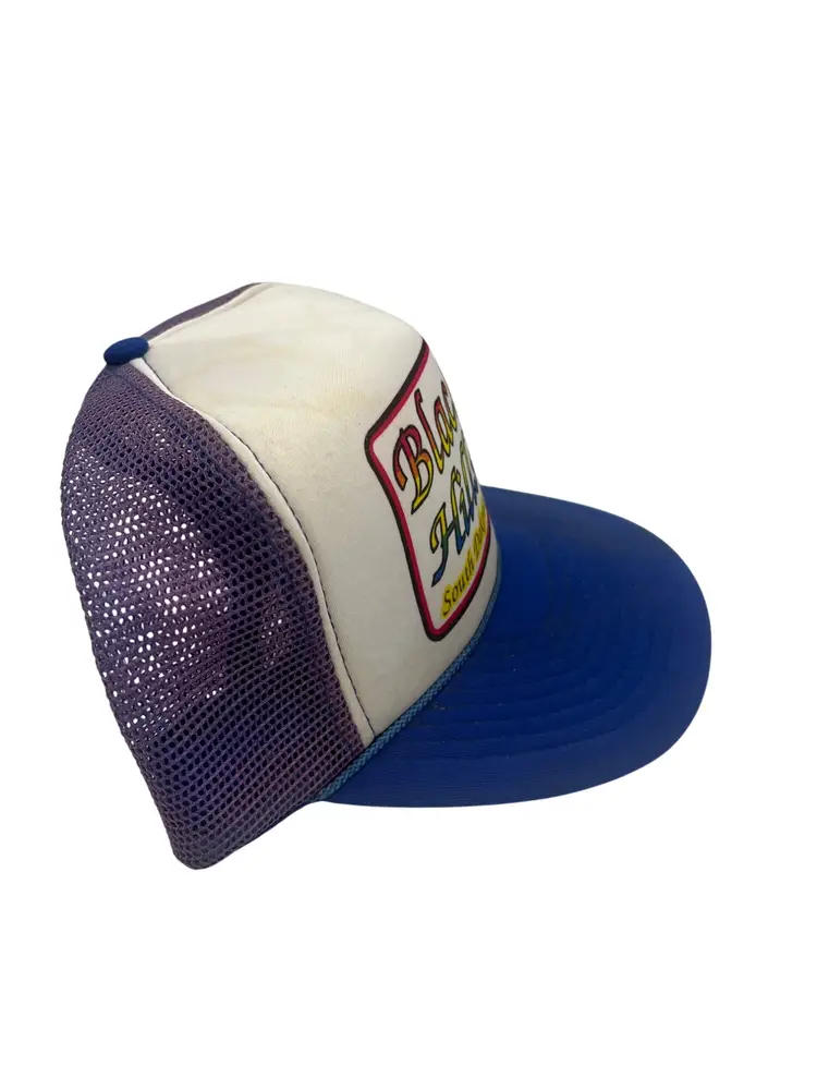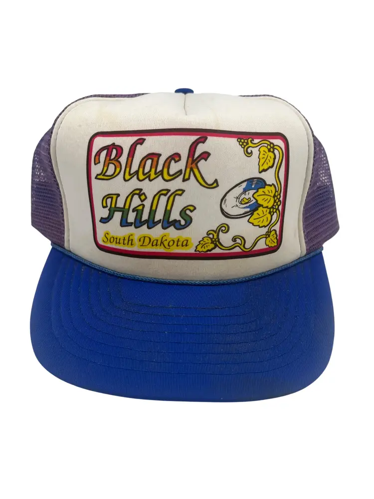 Vintage Black Hills, South Dakota foam-front mesh trucker hat by Winner/Renaissance International. White front with colorful “Black Hills” graphic, purple mesh back, blue brim and snap. Likely late 1980s–1990s production. One size adjustable.