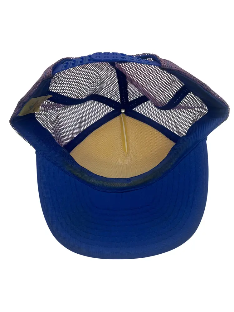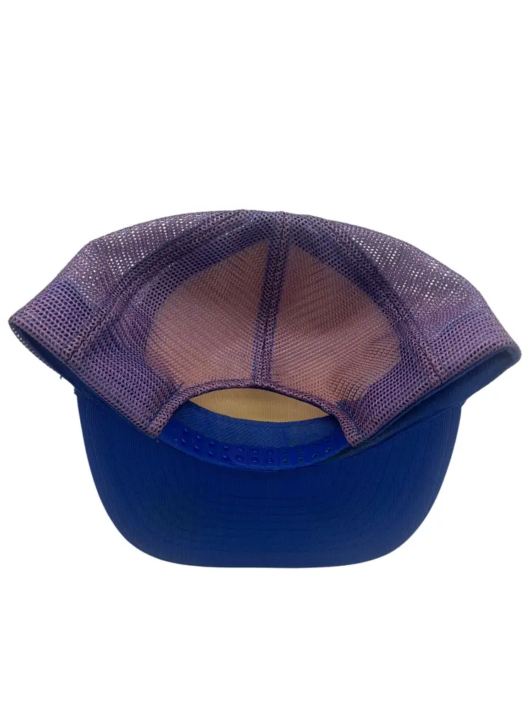 Preowned with light yellowing on the crown, minor wear on bill, and sweatband discoloration from use. Structure intact; snaps function. See pictures for further details on condition.