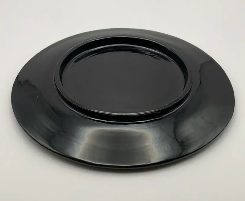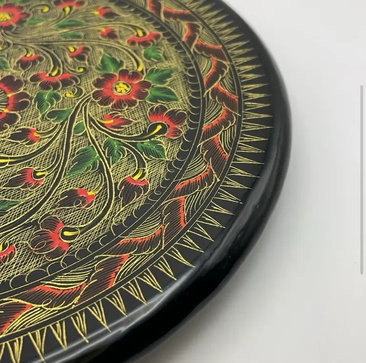 Black lacquer, 8” wooden plate, hand painted in gold/green/red florals and decorations. Excellent Condition!