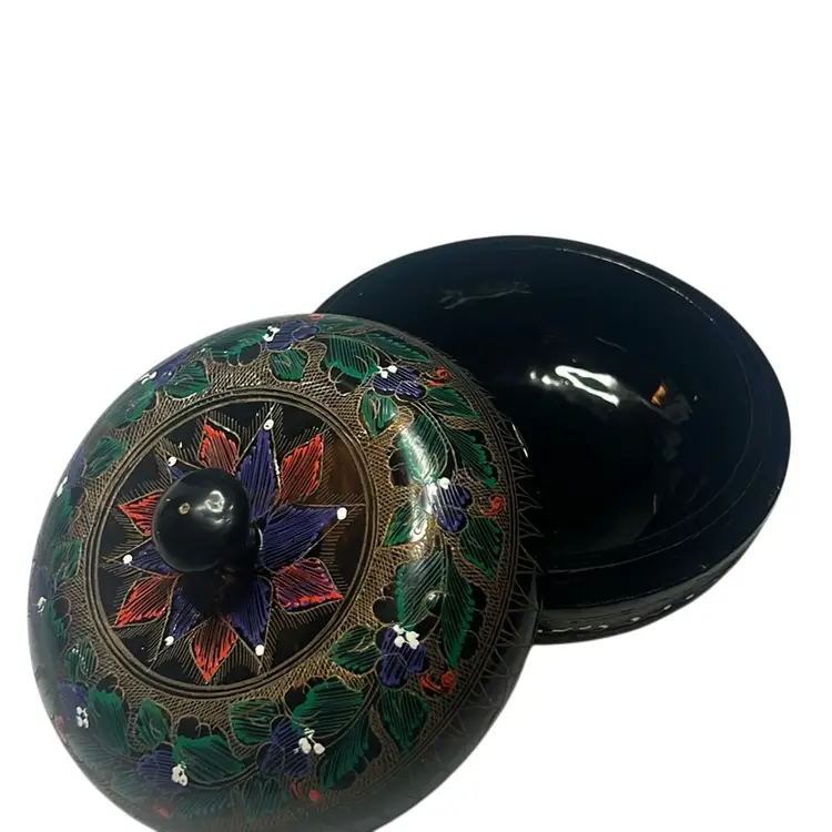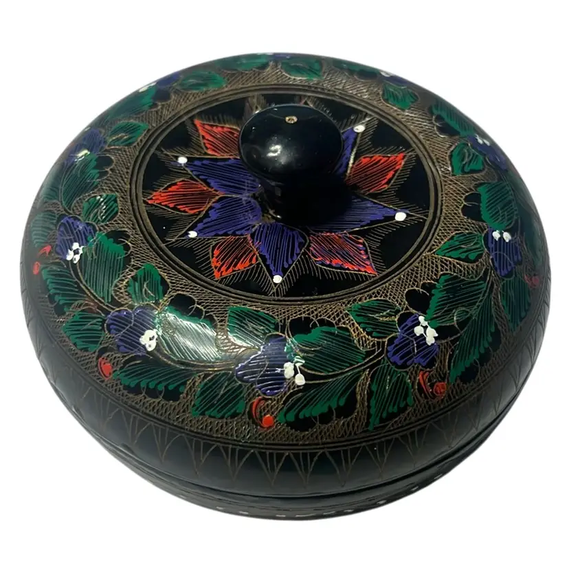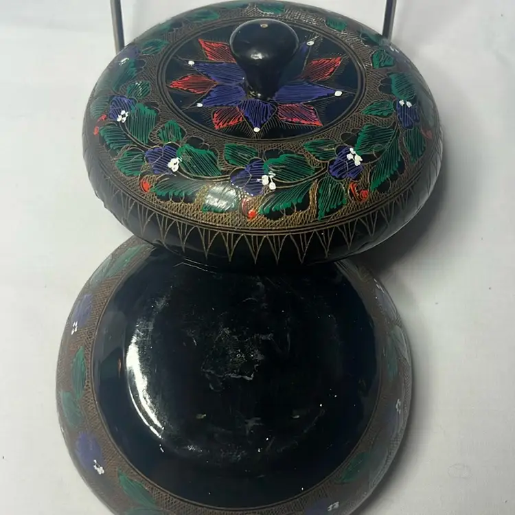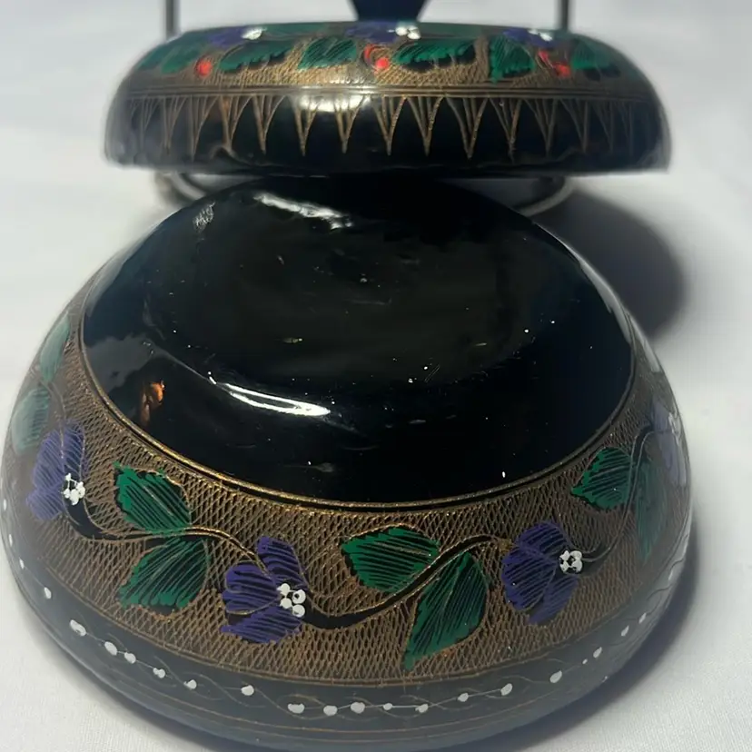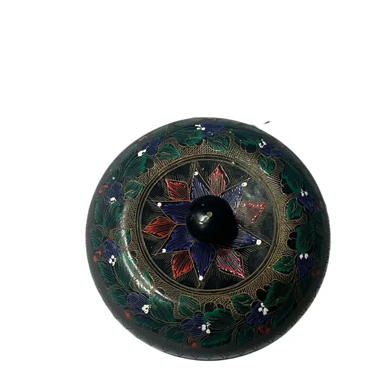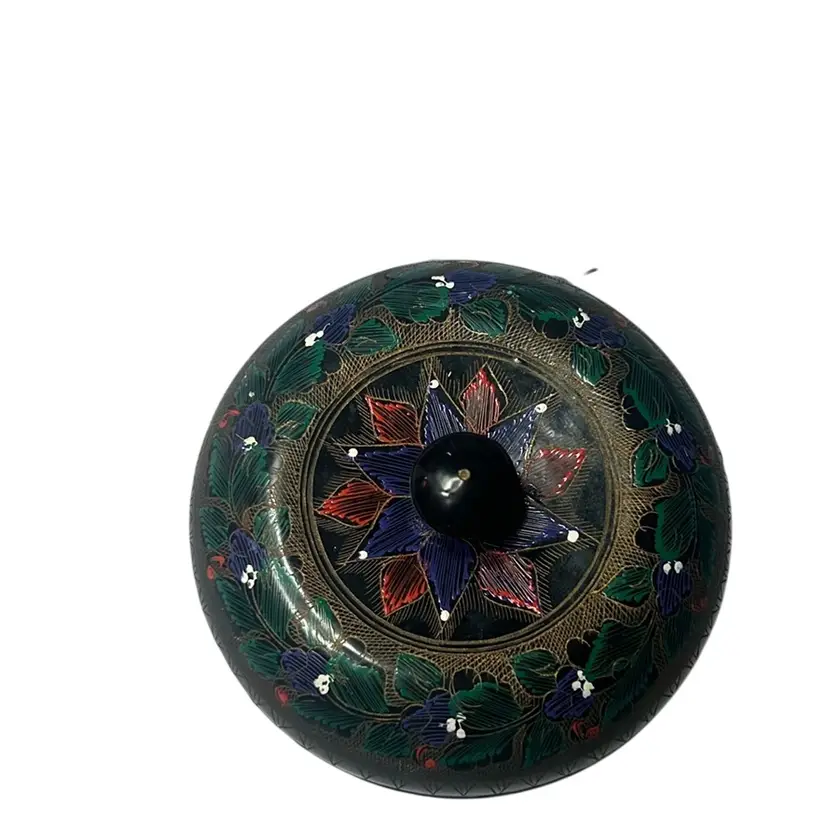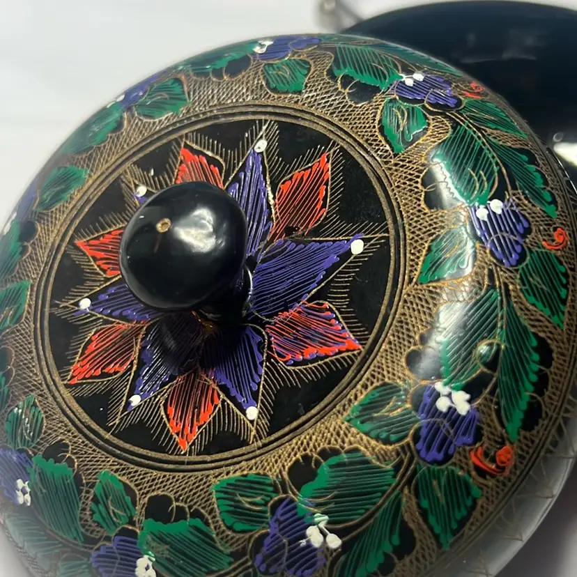 Hand painted with purples, greens & reds. Enamel paint. No makers mark and no damage