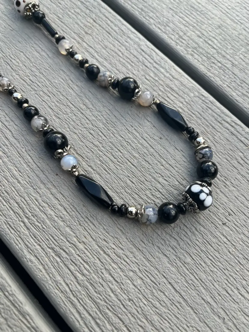 A Hand crafted 30 inch necklace in black, gray and white. Lampwork beads, gray Dragon Vein Agate beads and vintage black plastic beads with a wee bit of silver tossed in.