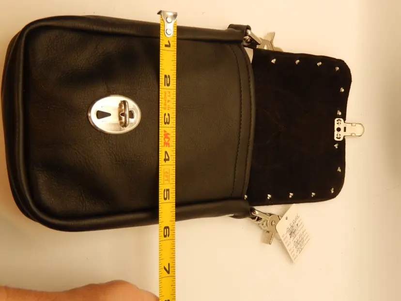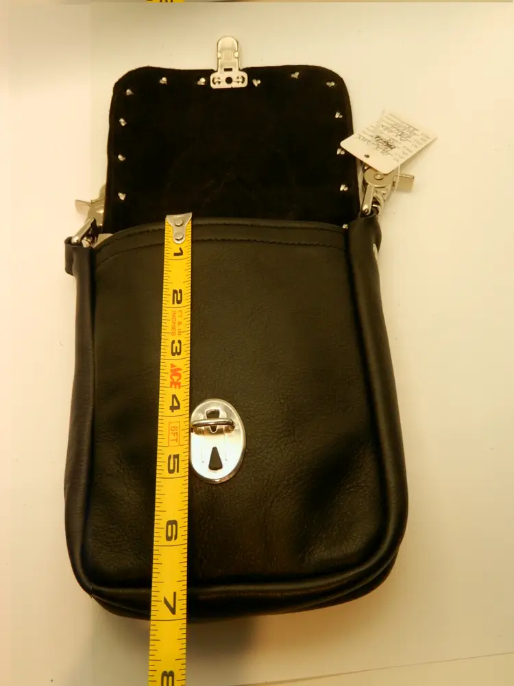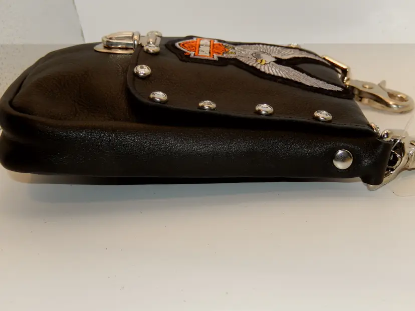 This bag: Black Leather Dimentions: Approximatly 7" H x 5." W (I only measured the front pannel width) Embelishments: Eagle (with Harley Davidson) Patch & Rinestones (Patches were all purchased from Harley Davidson and sewn onto the purse / bag. This bag was NOT made by or for Harley Davidson, only the patch was) Closure: Flap w/ push button closure Direction: Verticle
