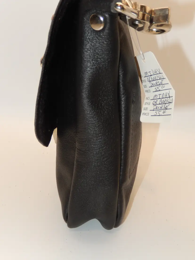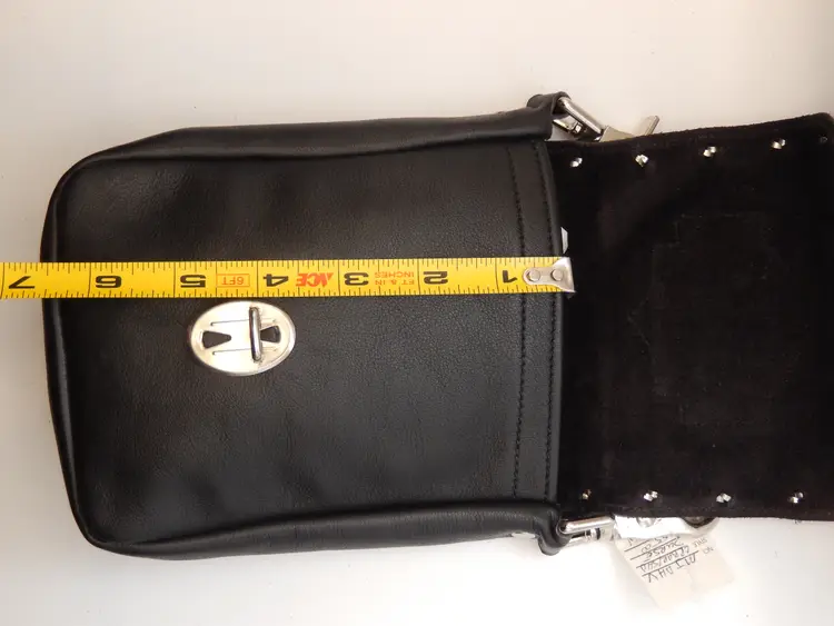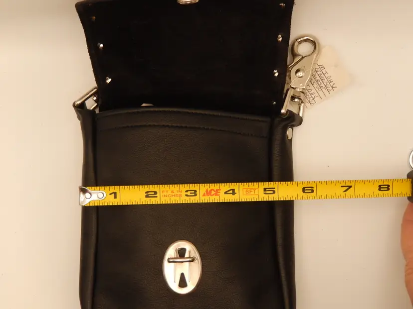 This bag: Black Leather Dimentions: Approximatly 7" H x 5." W (I only measured the front pannel width) Embelishments: Bar & Shield(Orange) Harley Davidson with Orange Rinestones (Patches were all purchased from Harley Davidson and sewn onto the purse / bag. This bag was NOT made by or for Harley Davidson, only the patch was) Closure: Flap w/ push button closure Direction: Verticle