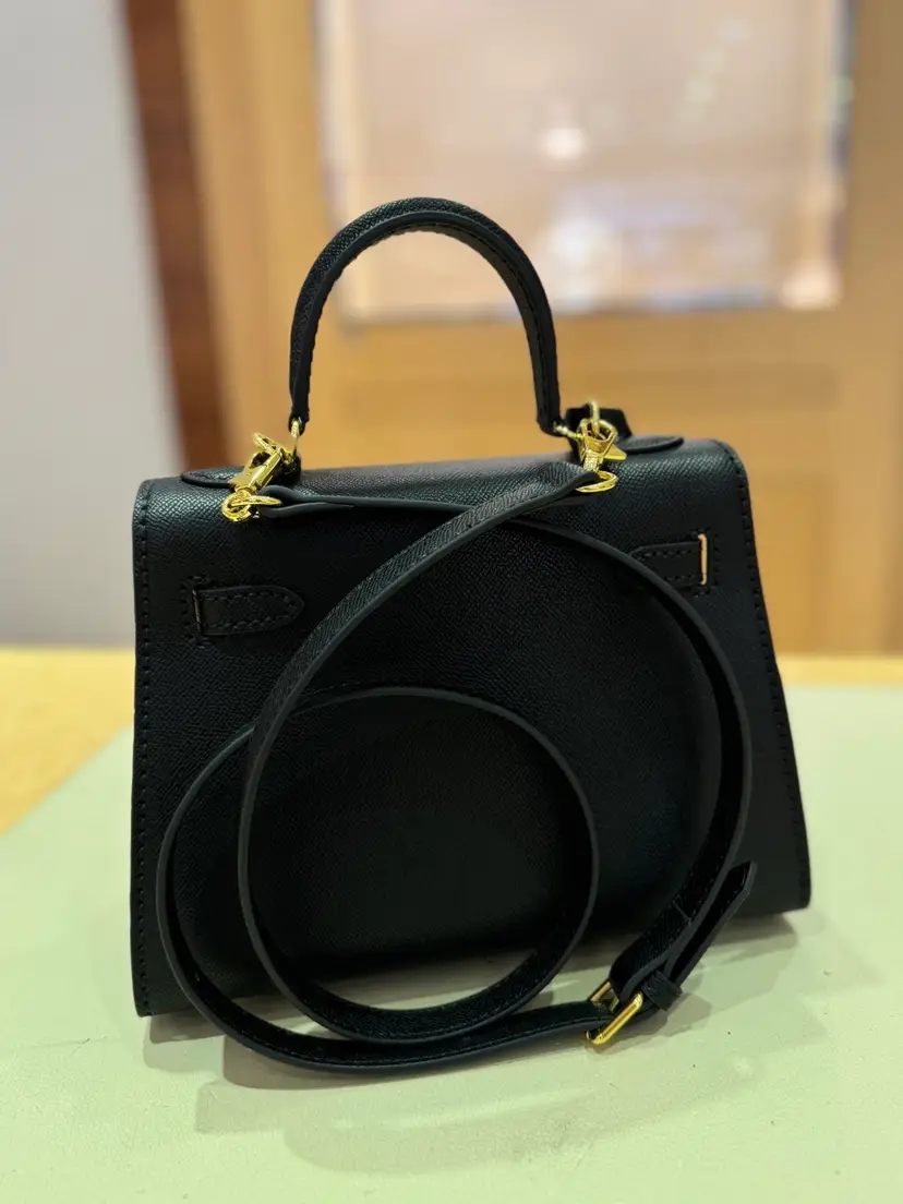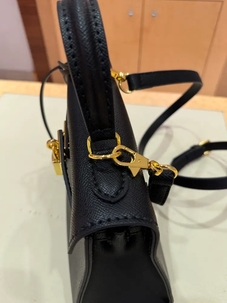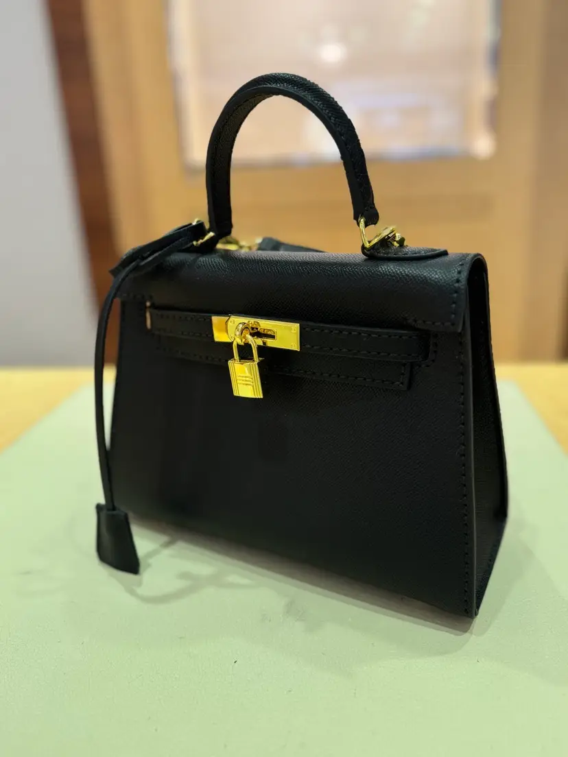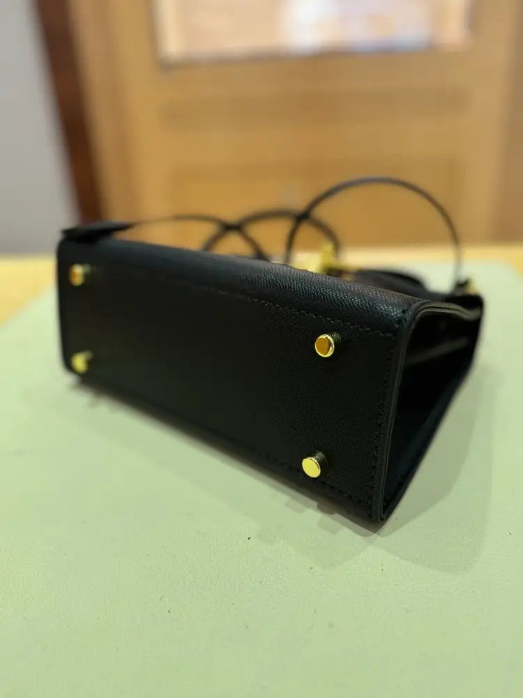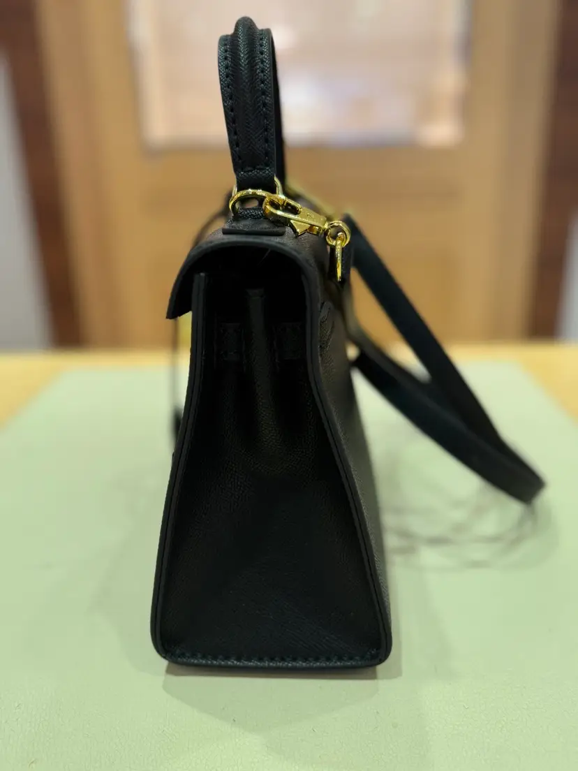 100% hand crafted black Napa leather bag with gold hardware and removable shoulder strap