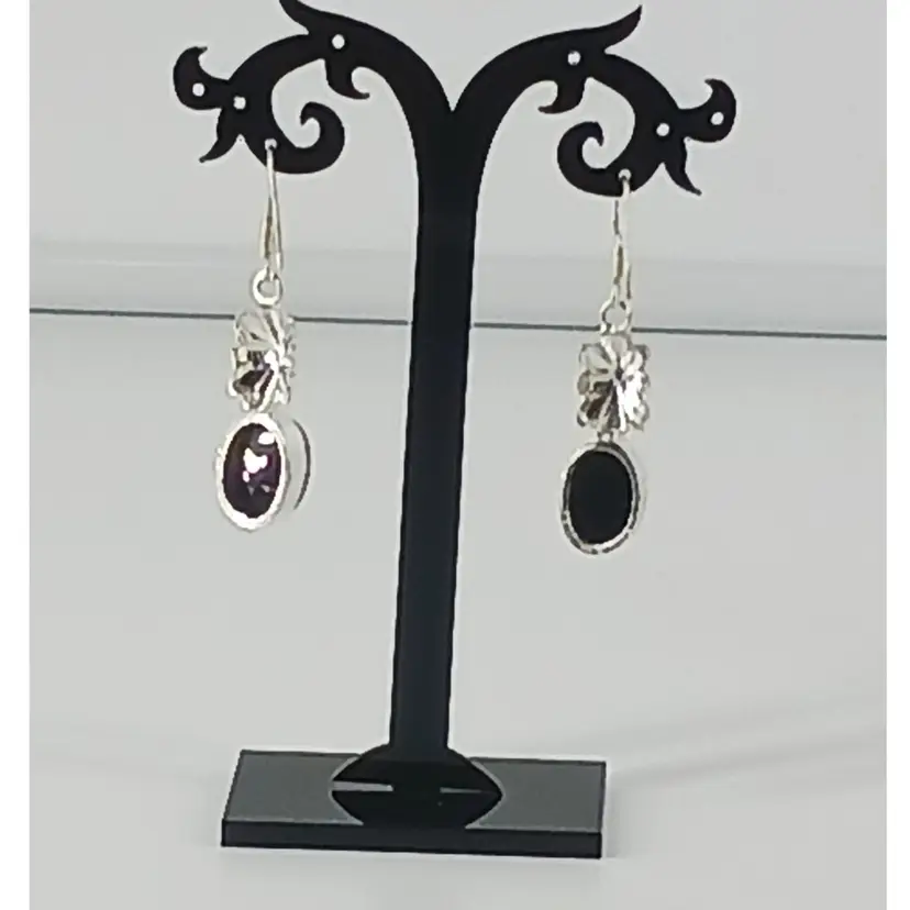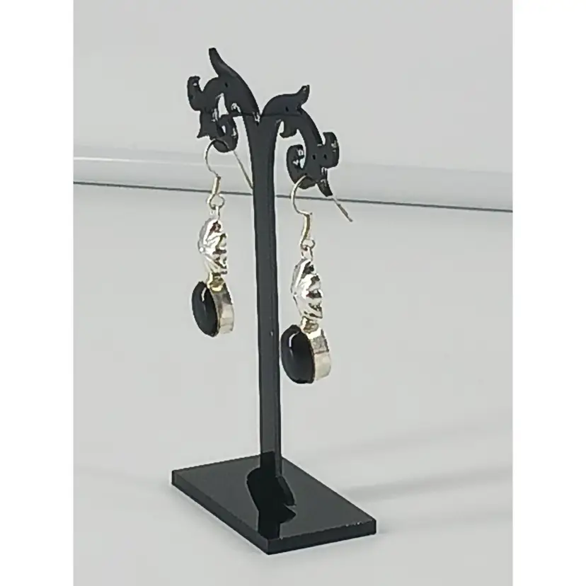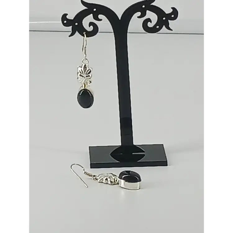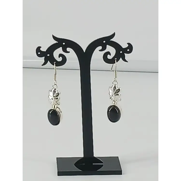 EM2795 – Black Onyx gem stone that measures 9/16 x 3/8 x1/4 inches has been mounted in a Sterling Silver setting that measures 1 3/8 x 7/16 x1/4 inches and hangs from a Sterling Silver earring wire.