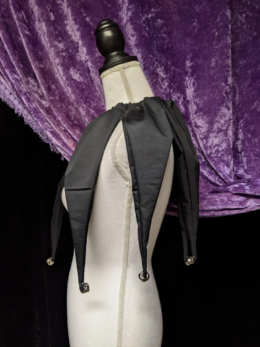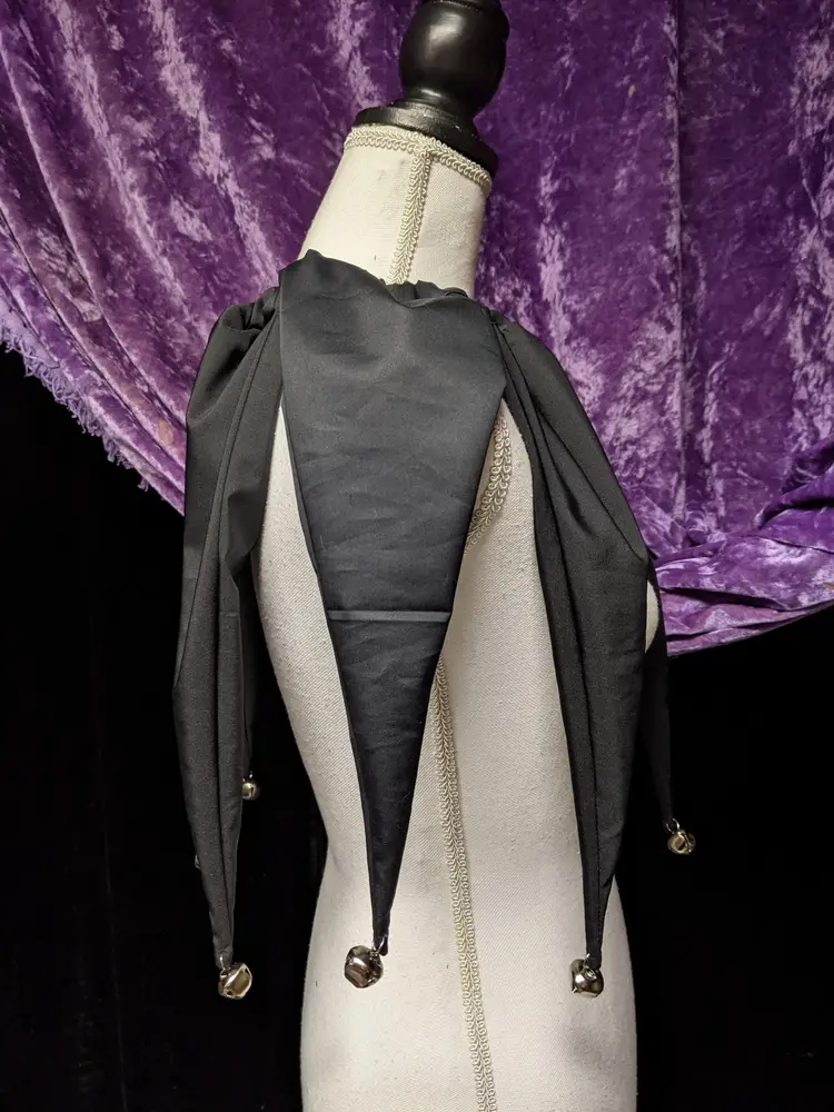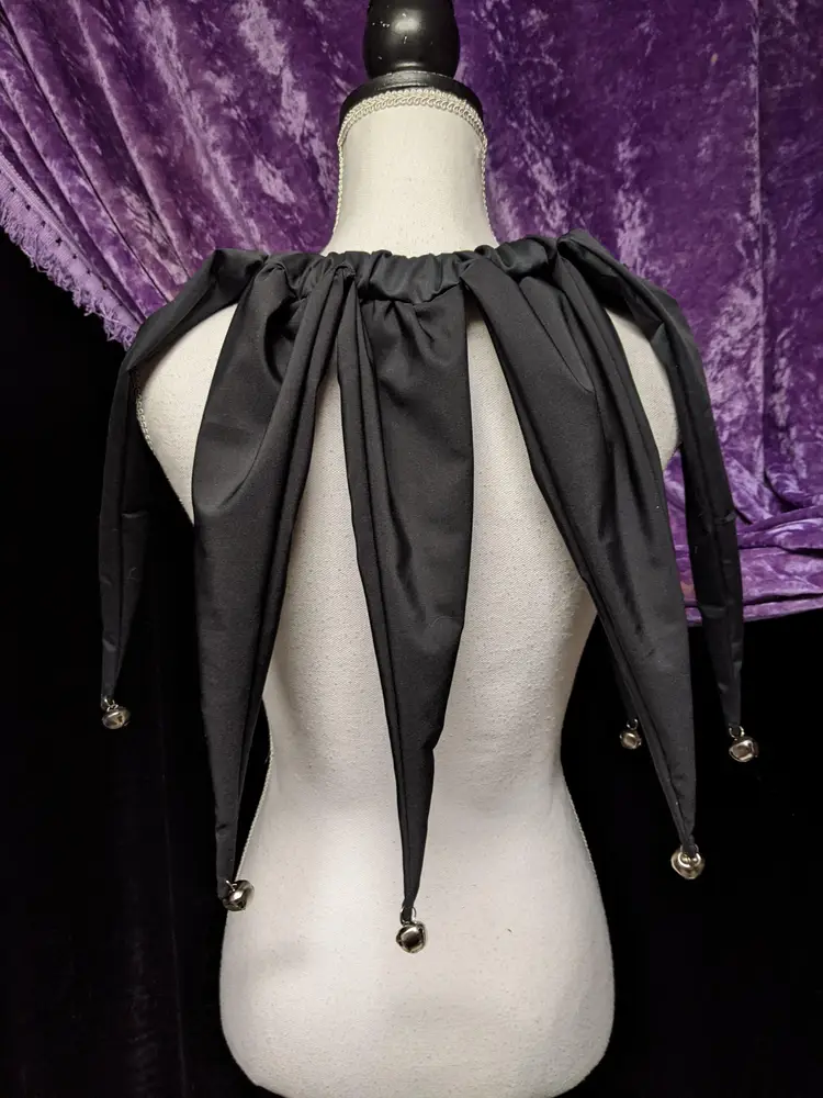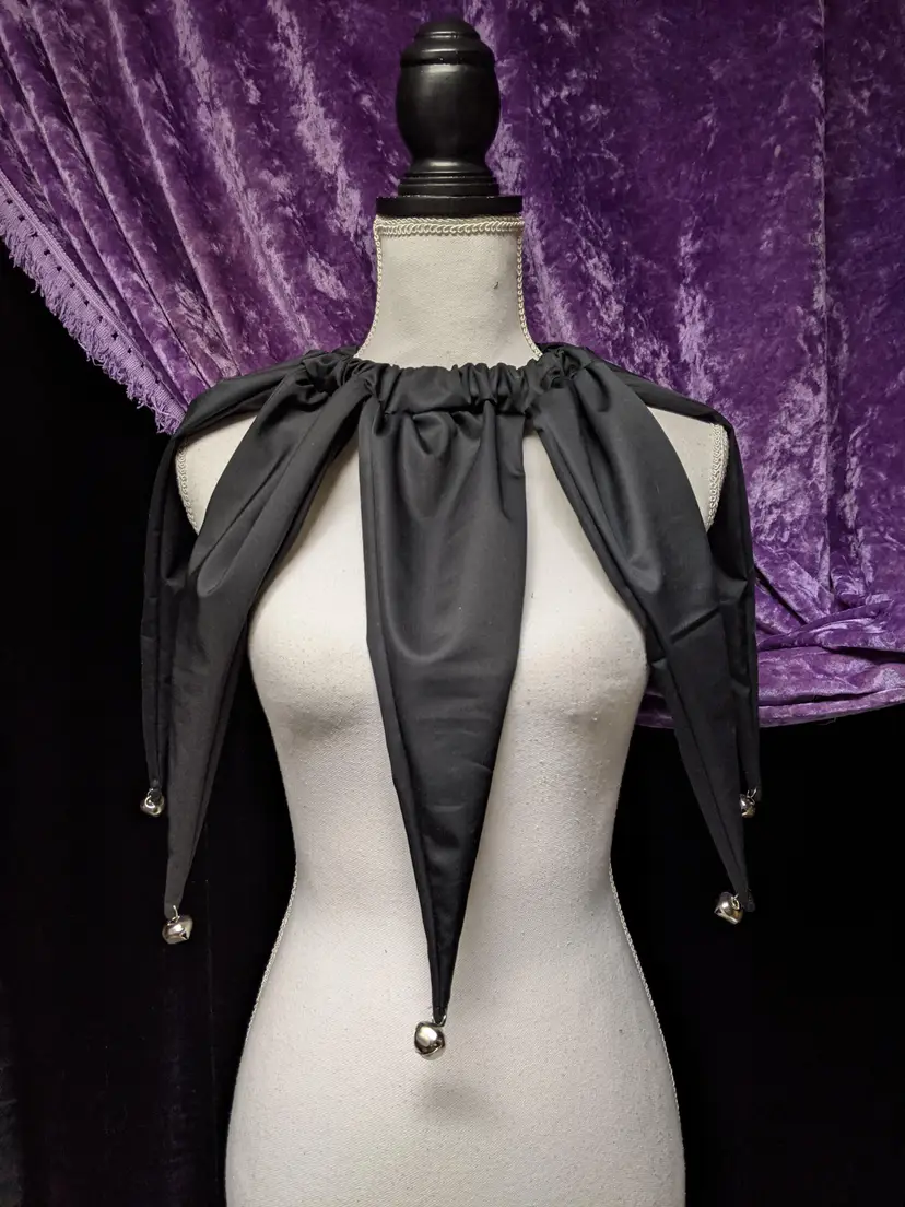 Black point jingle bells clown collar - The perfect accessory for a creepy carnival, haunt costume, photoshoot, cosplay, con costume or Halloween event! This collar is handmade from black poly cotton fabric cut and sewn into points. Fabric is tightly machine gathered, then sewn to the elastic fabric covered band. Silver bells are added to the bottom of each point. There are 8 points on each collar.