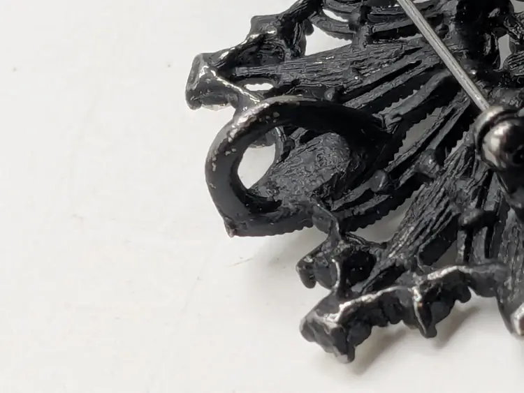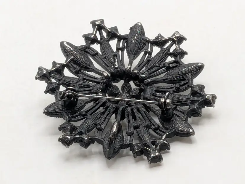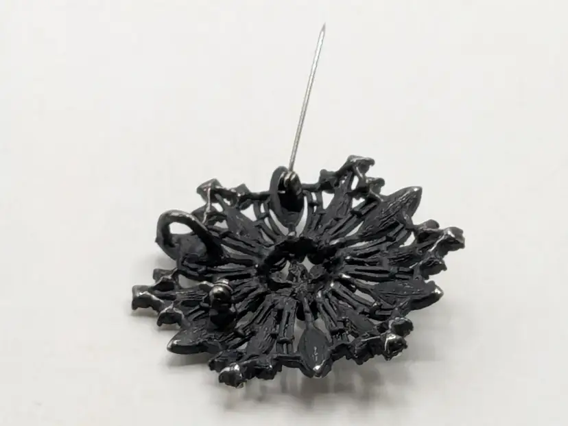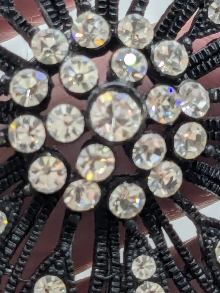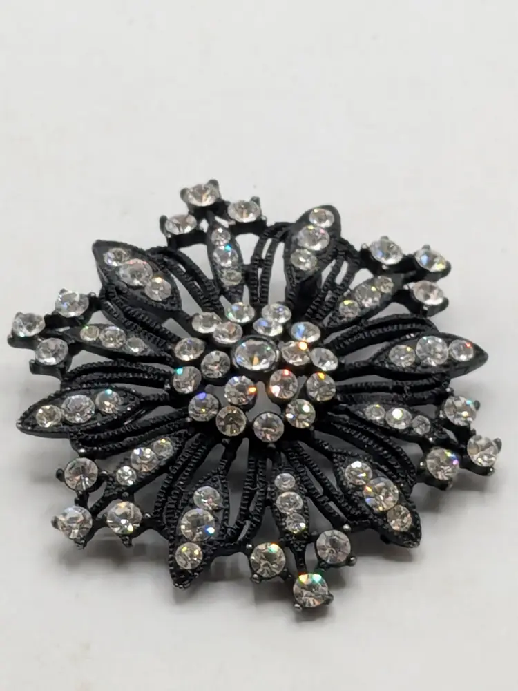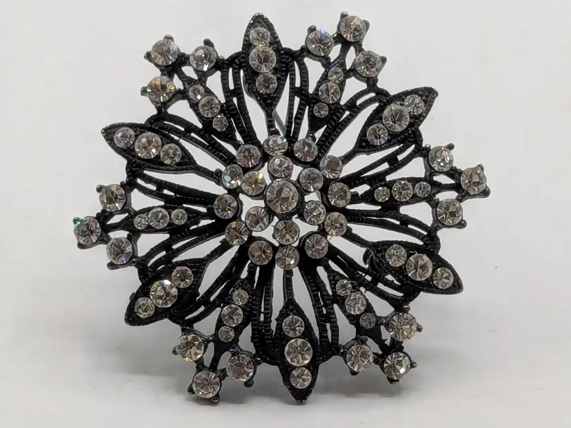 Good condition. Features a striking black metal design adorned with sparkling rhinestones. Measures 2 inches in diameter. wen