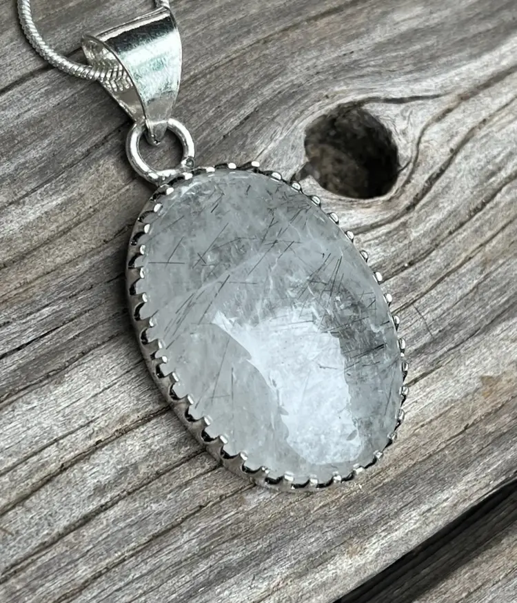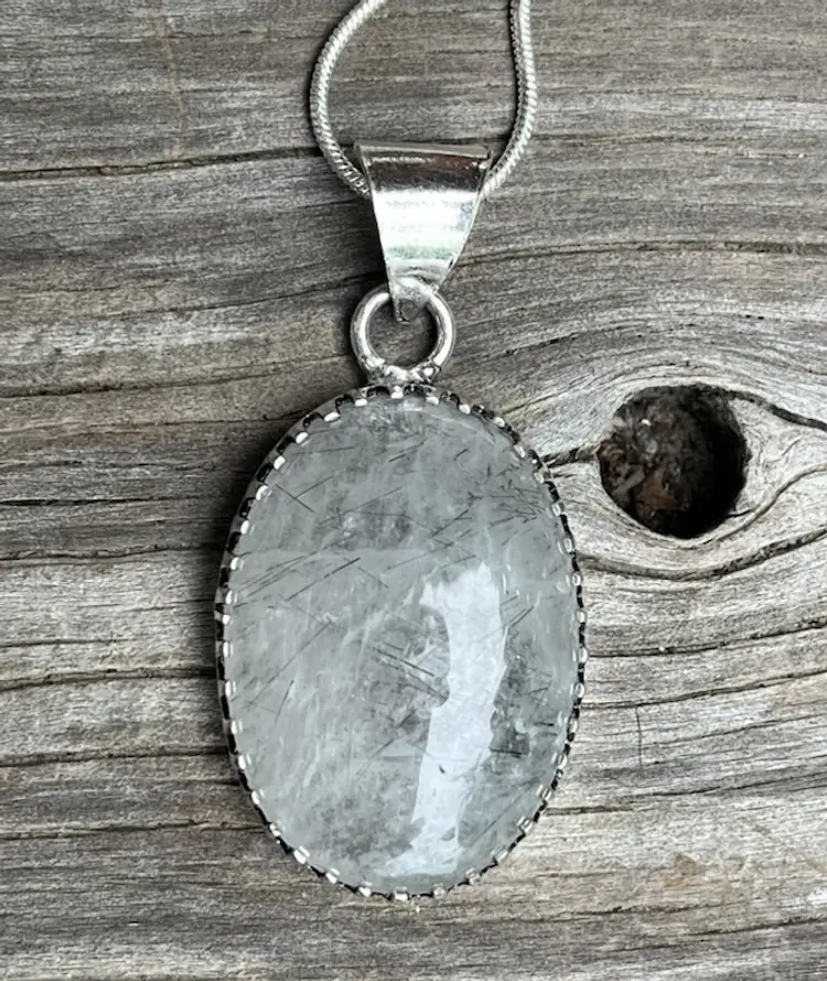 Black Rutile in Clear quartz on a 925 Sterling Silver base. Pendant measures approximately 1 3/4 inches long and 3/4 inch wide. On a 19 inch sterling silver snake chain.