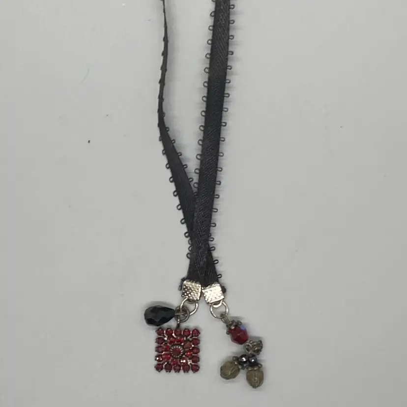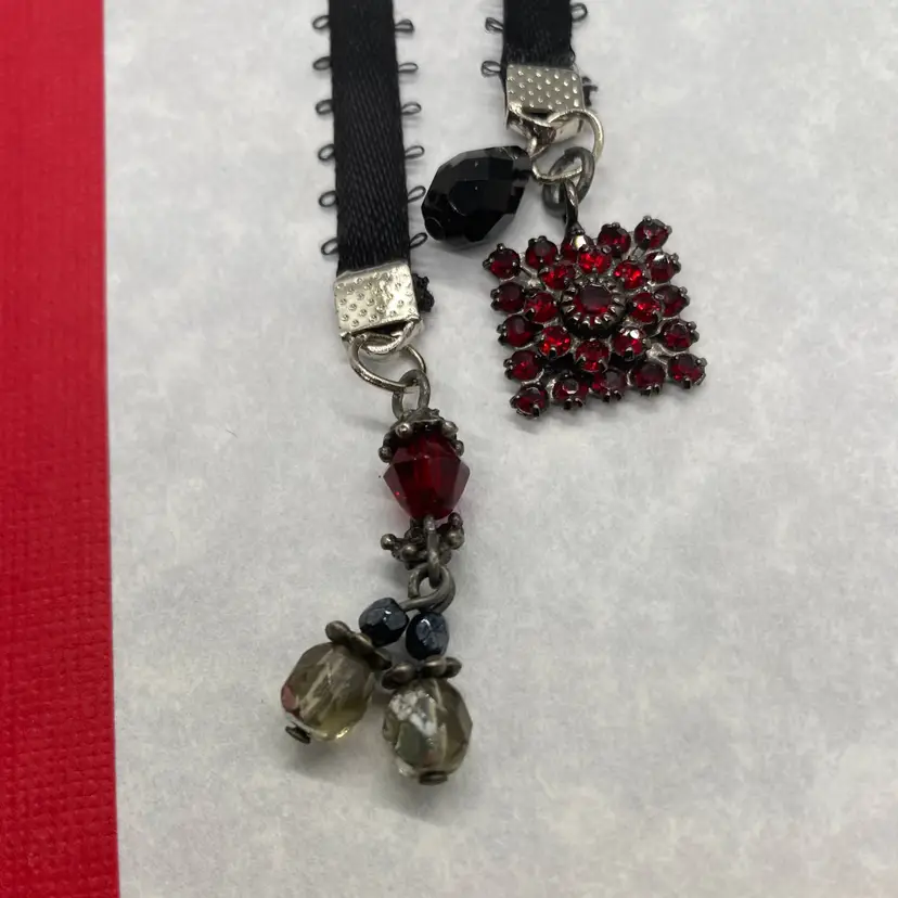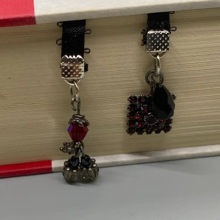 Keep your place in style with this handmade Black Satin picot ribbon bookmark. Adorned with beautiful Garnet red & smoke gray beads and square Garnet rhinestone dangle charm, it's a perfect blend of functionality and charm. Great for any book lover! Ribbon measures 10.5" long. Made from repurposed orphan earrings