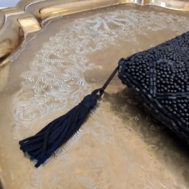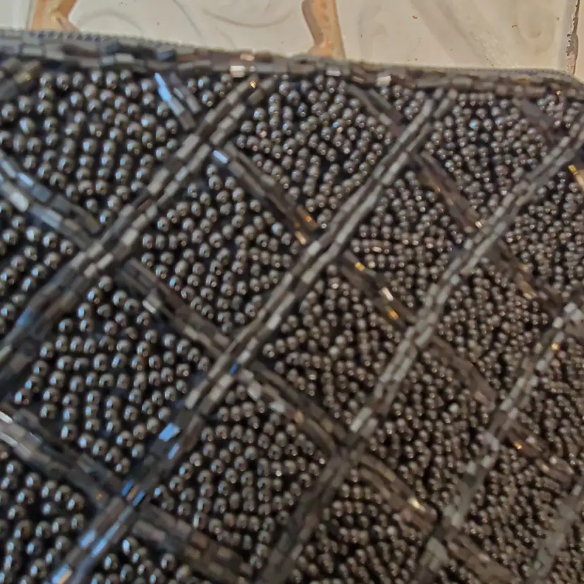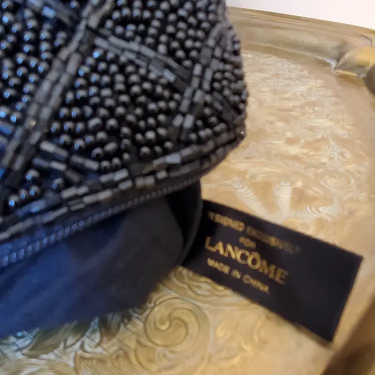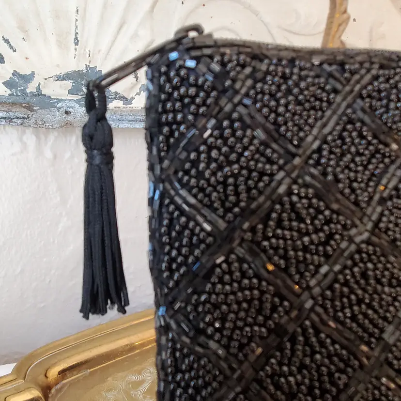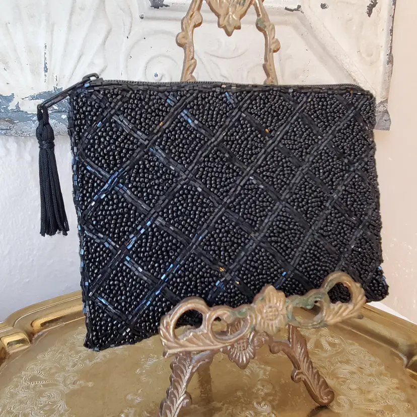 This lovely little black beaded coin purse was included in an early '90s holiday collection by Lancome. Excellent condition. 6" x 4 3/8"