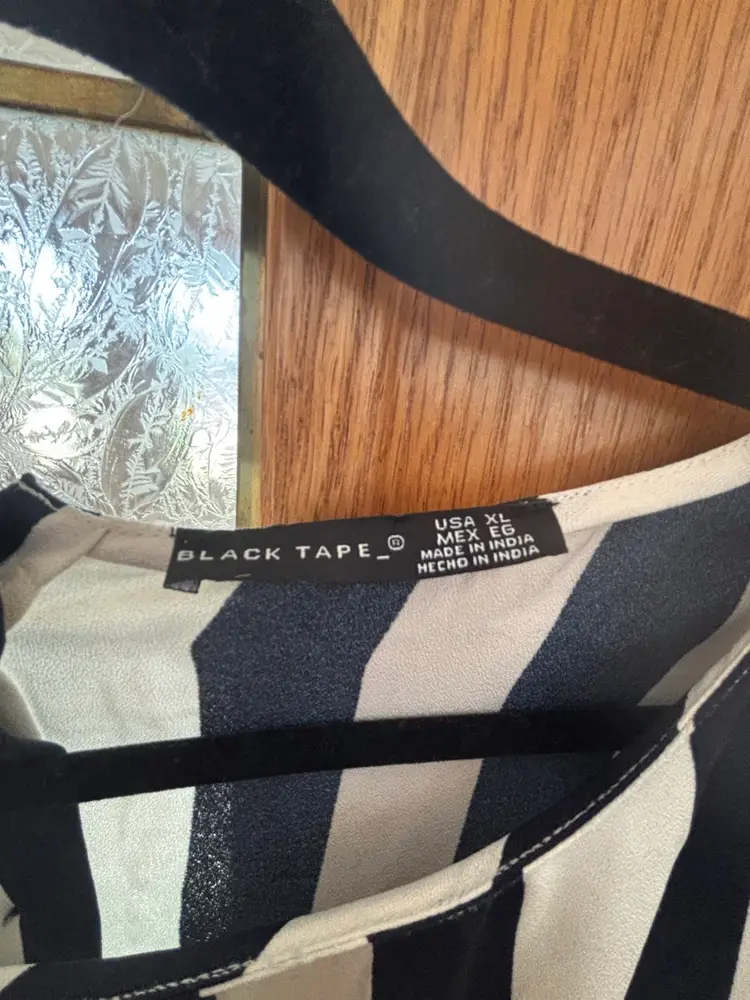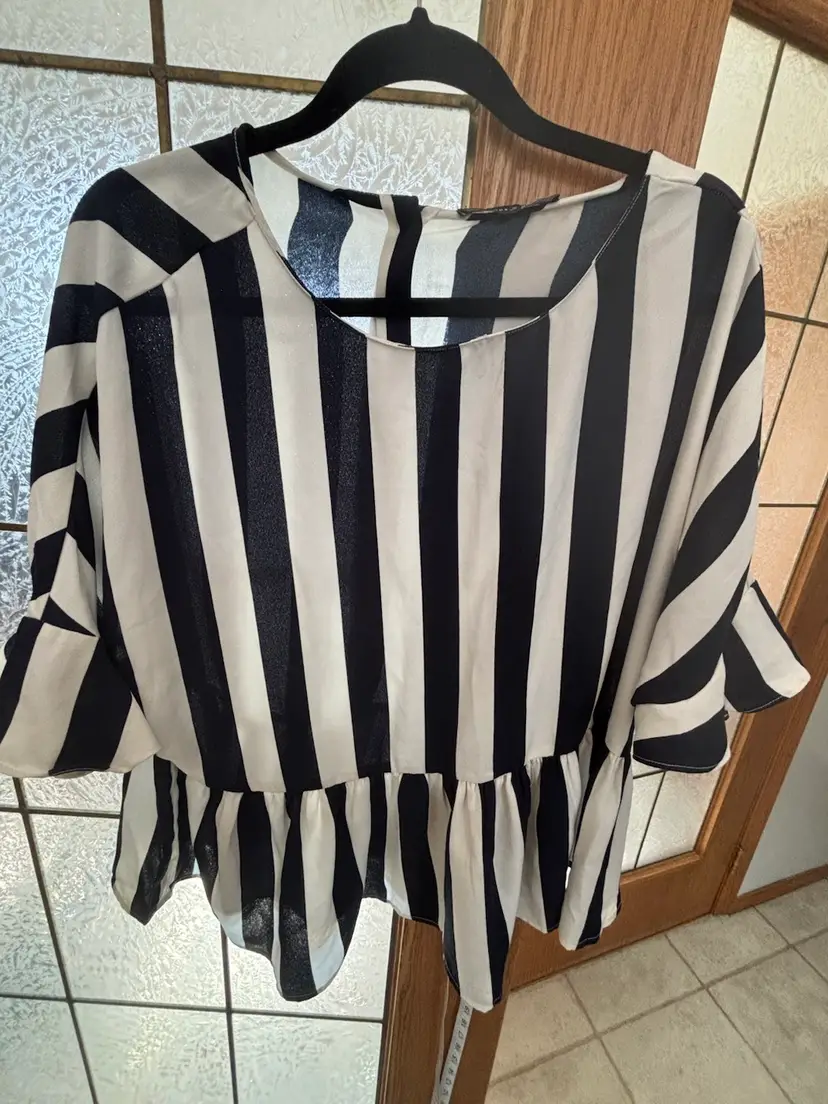 Chic blouse with bold navy and white stripes. Features a flowy silhouette and ruffled sleeves. 25” pit to pit.