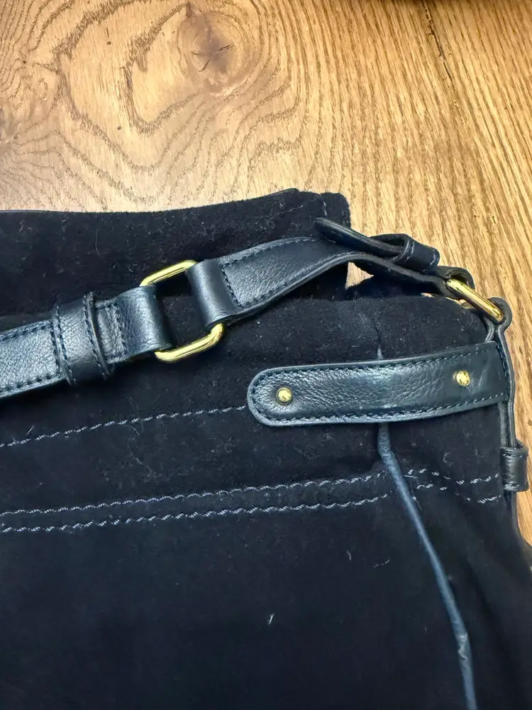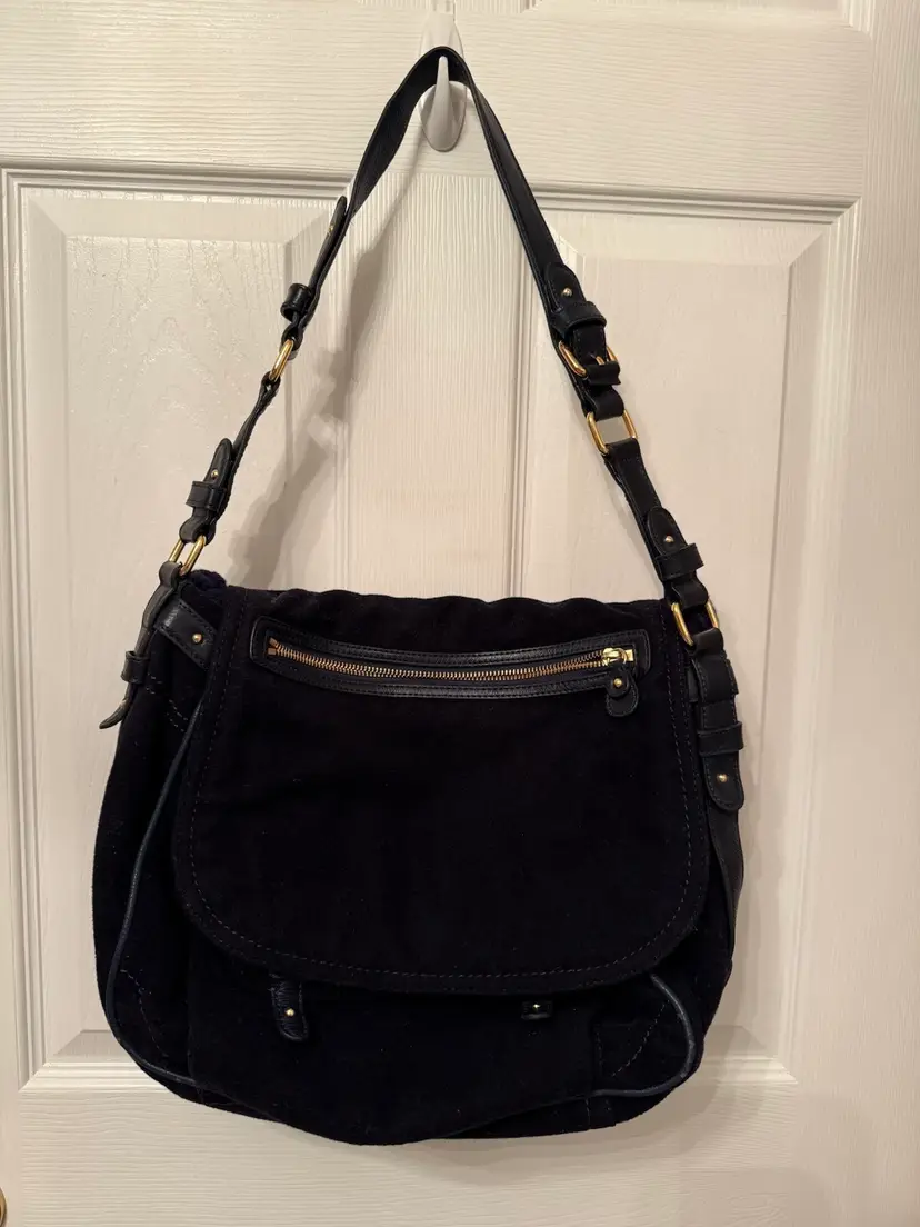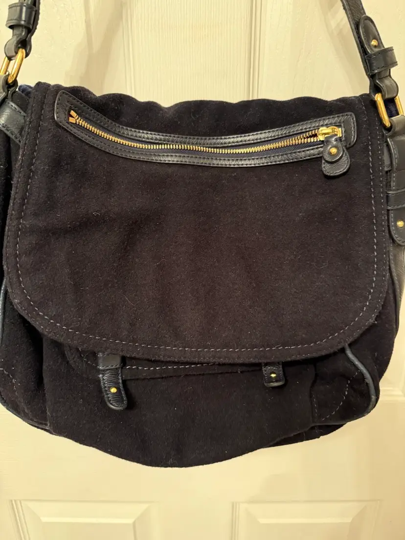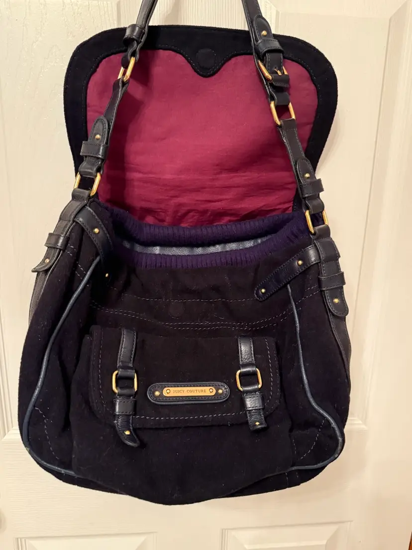 Elegant black shoulder bag with gold accents, perfect for any occasion. Black Sued Juicy Couture I handbag, great condition other than little bit worn on the edging cord. Great looking handbag. There are pictures to show the wear on cord trim. The front has a flap has a zipper and juicy couture on a gold magnet. Interior trim with rib corduroy, inside burgundy color, with one pouch, one side zipper. The other side has an open pouch and a key hook for your key hook. Strap is adjustable. measurements: purse is 11 1/2 inches tall 12 inches wide. The bottom is 12 inches wide by 3 1/2 inches tall. Strap leather on both sides and continues under the pocketbook. A great looking effect on this purse very well-made, suede and leather.