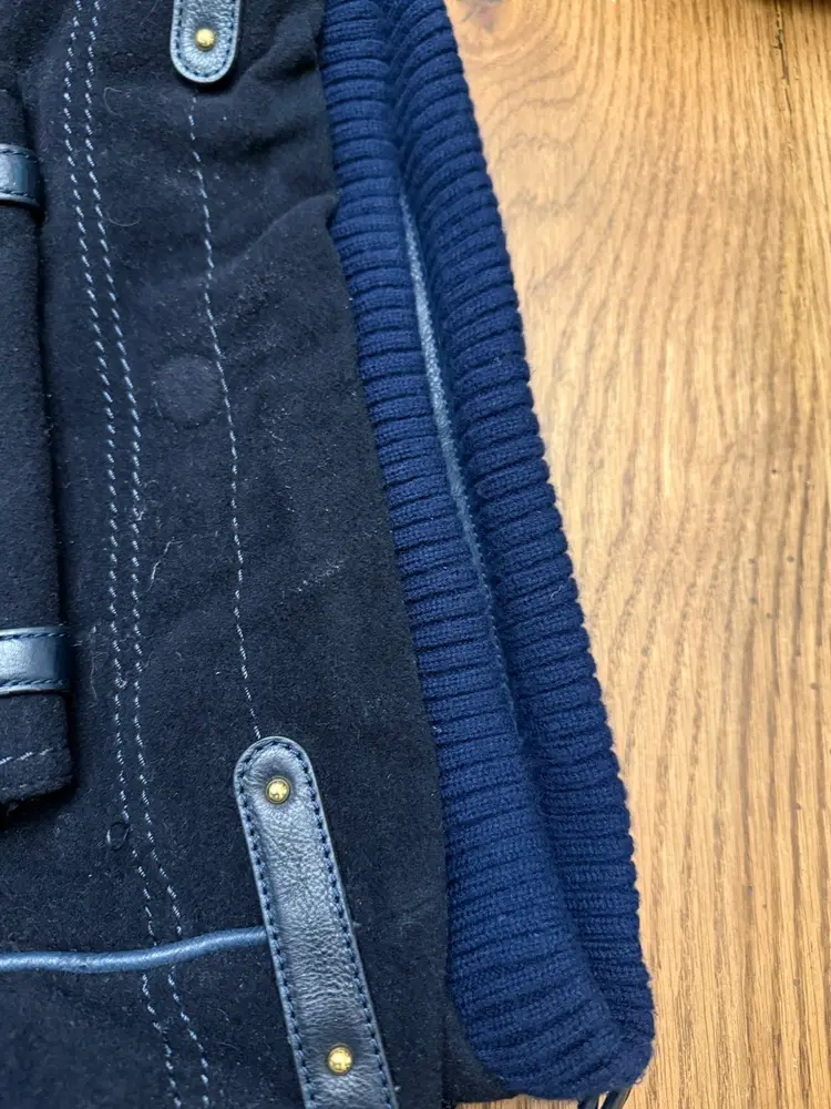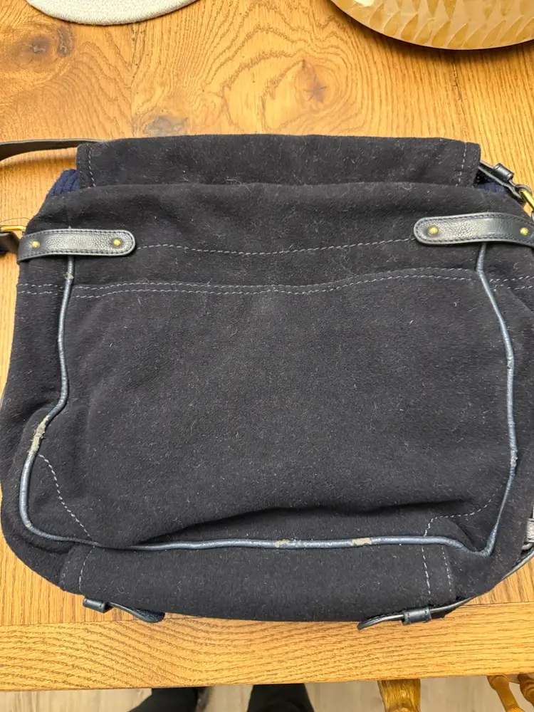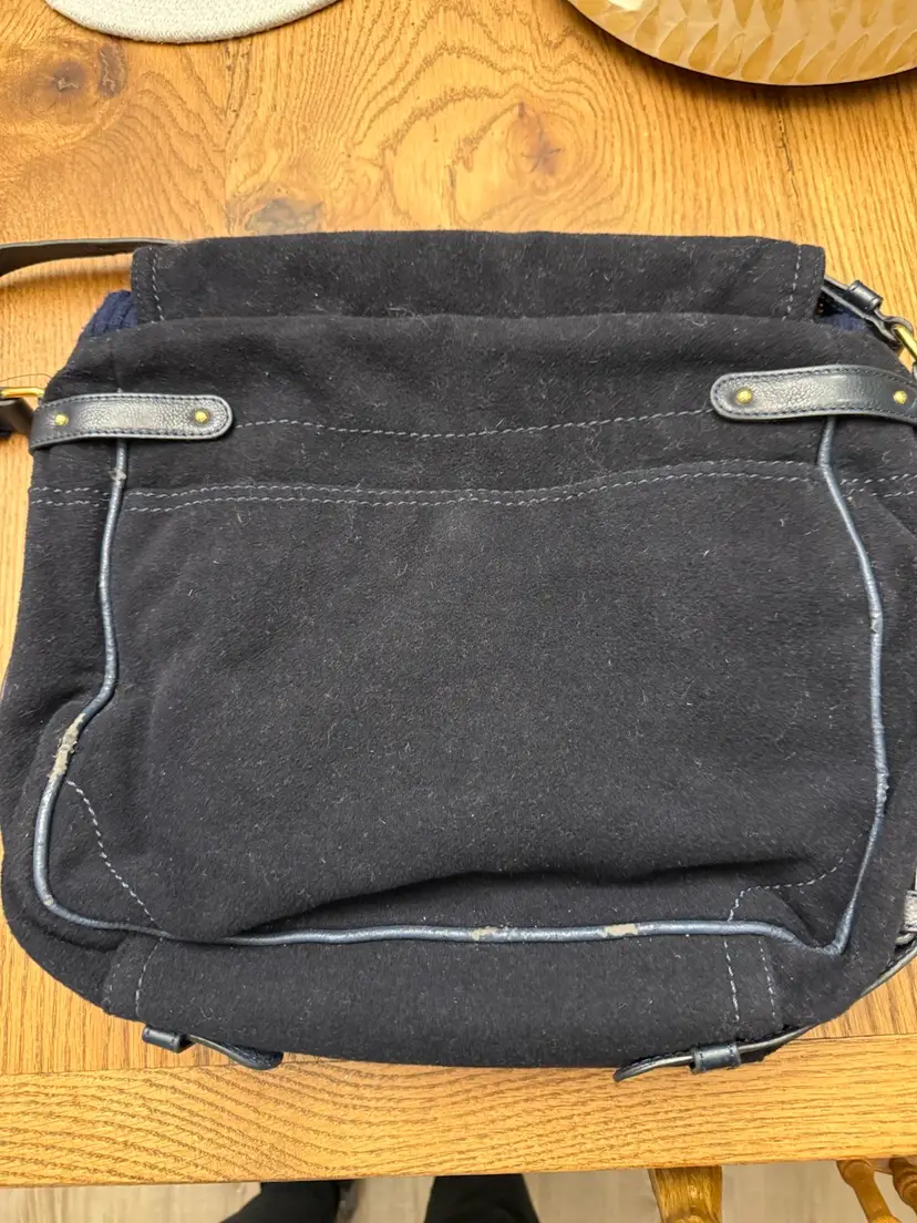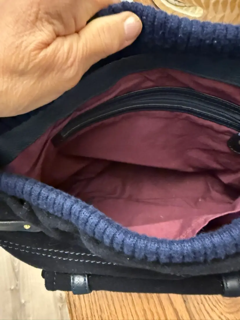 Elegant black shoulder bag with gold accents, perfect for any occasion. Black Sued Juicy Couture I handbag, great condition other than little bit worn on the edging cord. Great looking handbag. There are pictures to show the wear on cord trim. The front has a flap has a zipper and juicy couture on a gold magnet. Interior trim with rib corduroy, inside burgundy color, with one pouch, one side zipper. The other side has an open pouch and a key hook for your key hook. Strap is adjustable. measurements: purse is 11 1/2 inches tall 12 inches wide. The bottom is 12 inches wide by 3 1/2 inches tall. Strap leather on both sides and continues under the pocketbook. A great looking effect on this purse very well-made, suede and leather.