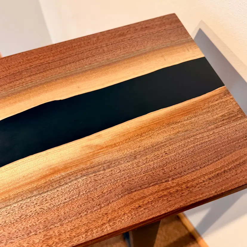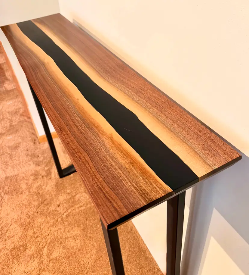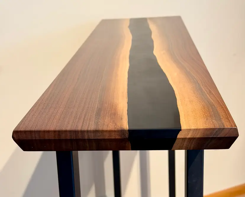 A silhouette “river” drama in a slim console table. Crafted from American Black Walnut, the top is book-matched around a jet-black epoxy resin channel that flows the full 3’ 8” inch length. The contrast amplifies the curl, sapwood glow, and chatoyance in the grain while locking the two halves together for life.