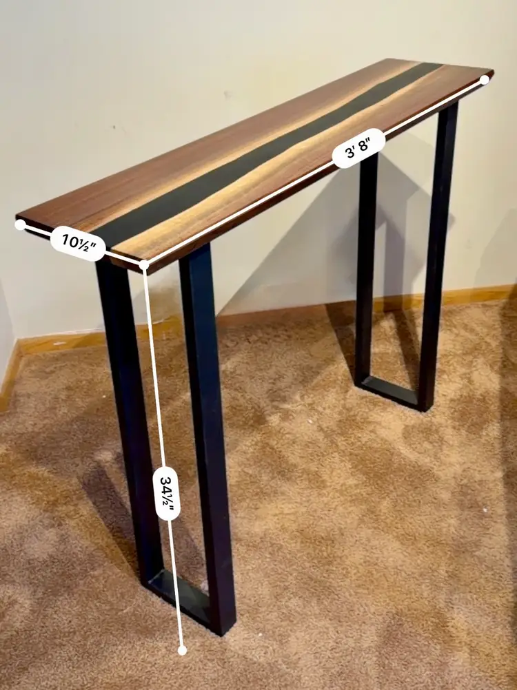 SPECIFICATIONS Dimensions: 40″ L × 11″ W × 34.5″ H (1.25” thick) Weight: ~13 lb Wood Species: Black Walnut Base: Steel Powder-Coated Epoxy Resin Details: UV-stable, pigment-rich black river between slabs