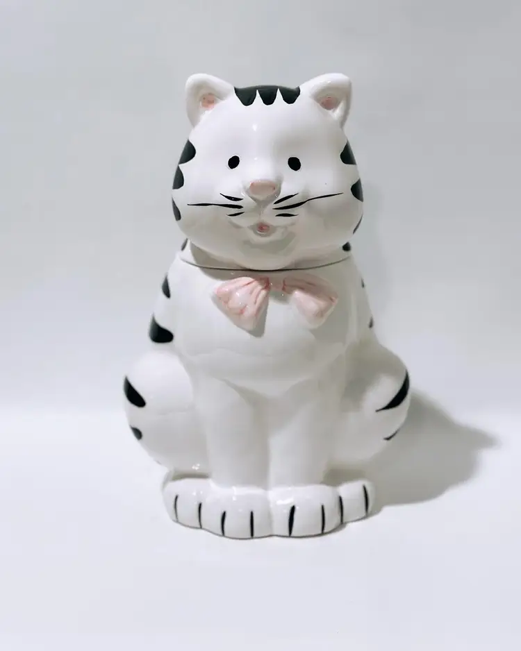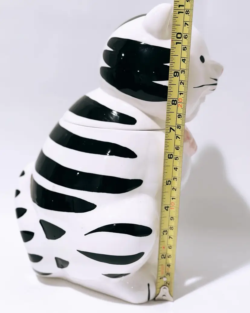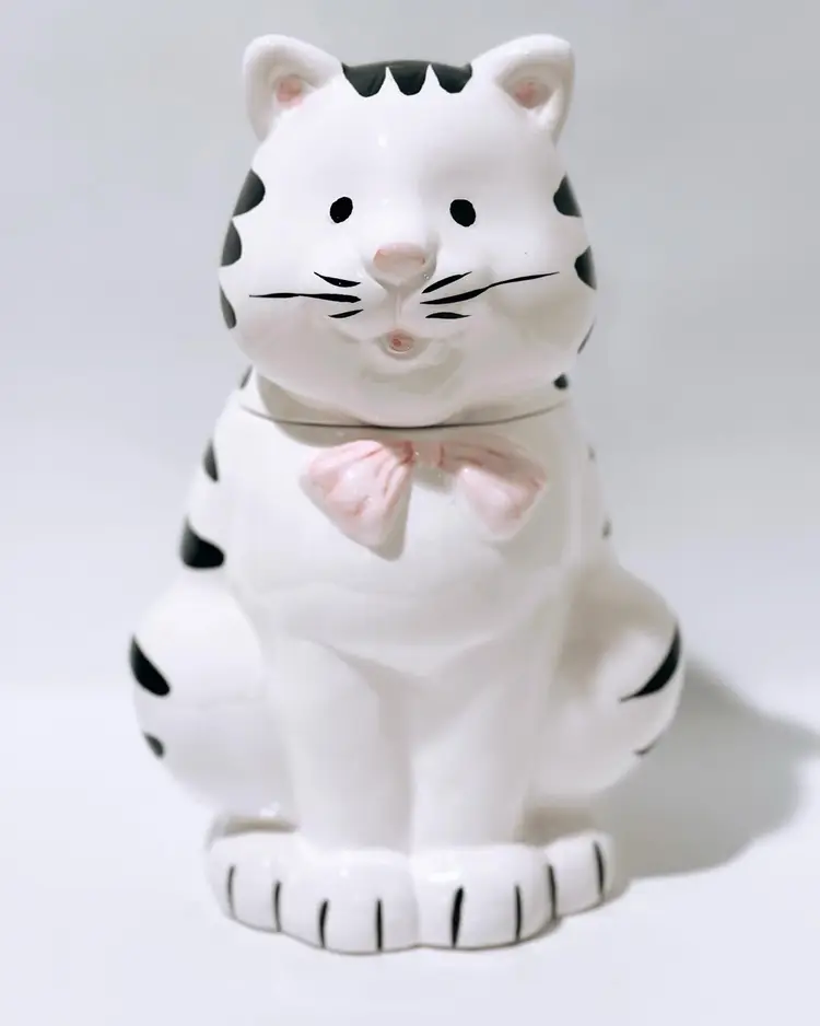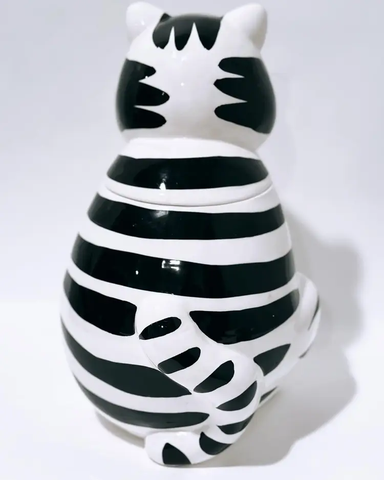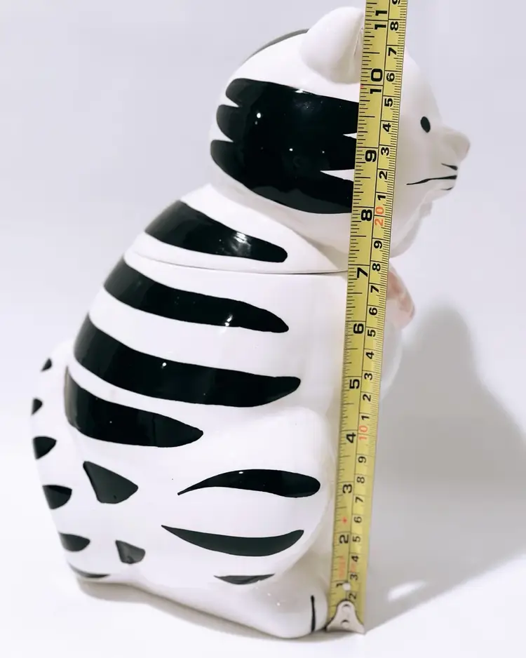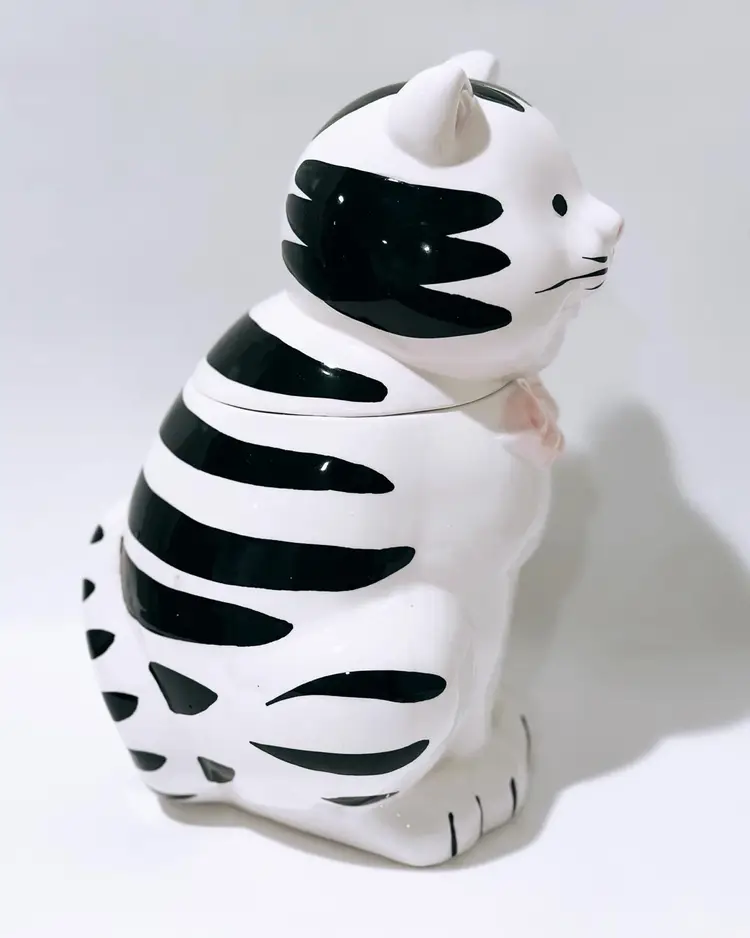 This charming ceramic and porcelain cat cookie jar is the perfect addition to any kitchen. With its black and white striped pattern, it will add a touch of whimsy to your countertop. The cute cat face, complete with a pink bow and nose, will put a smile on your face every time you reach for a treat.