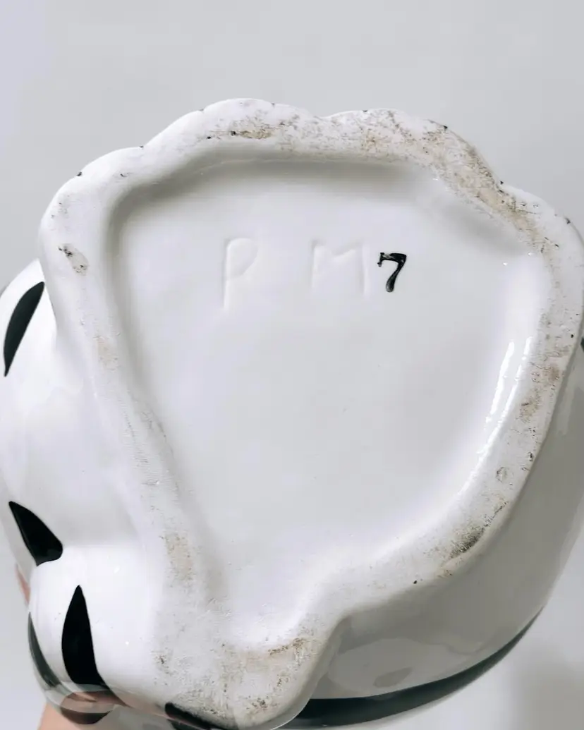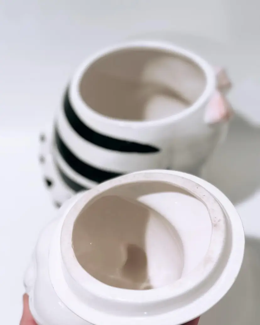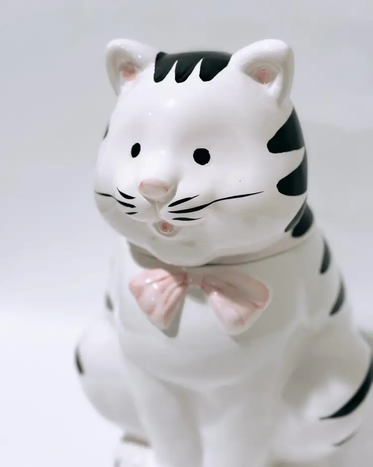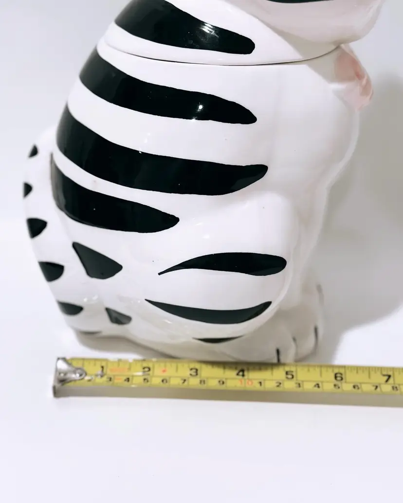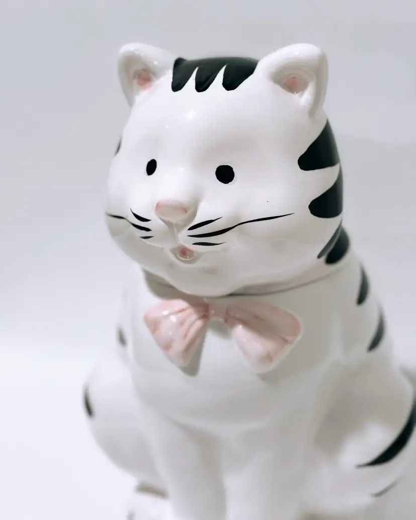 This charming ceramic and porcelain cat cookie jar is the perfect addition to any kitchen. With its black and white striped pattern, it will add a touch of whimsy to your countertop. The cute cat face, complete with a pink bow and nose, will put a smile on your face every time you reach for a treat.