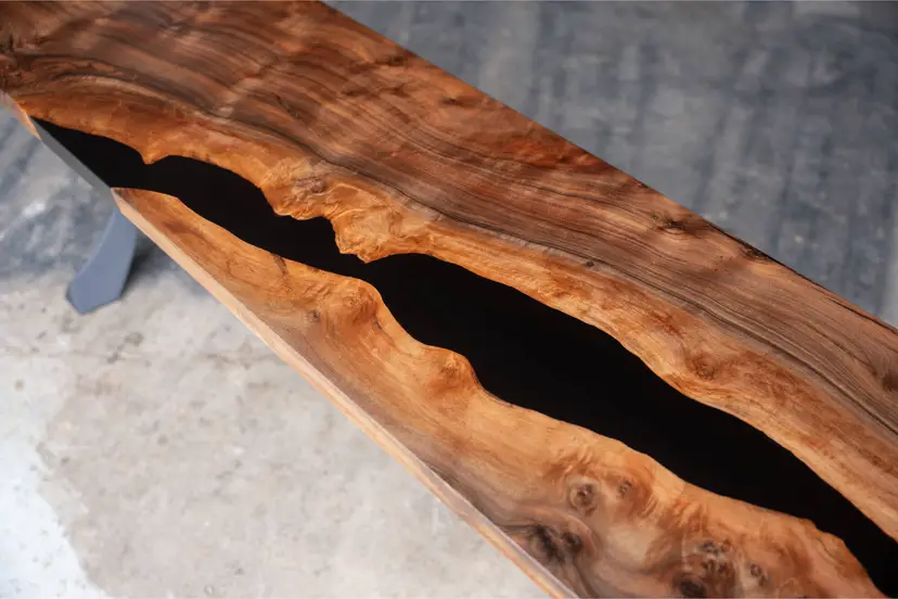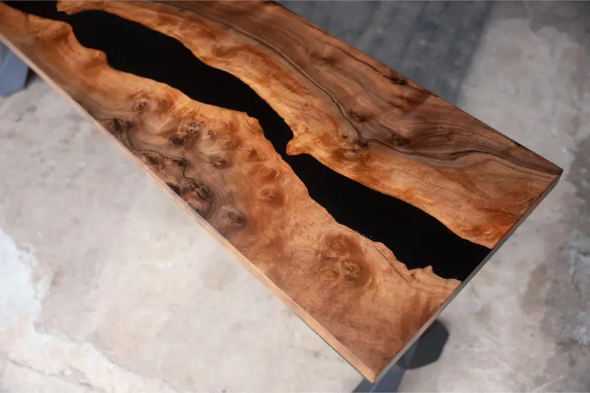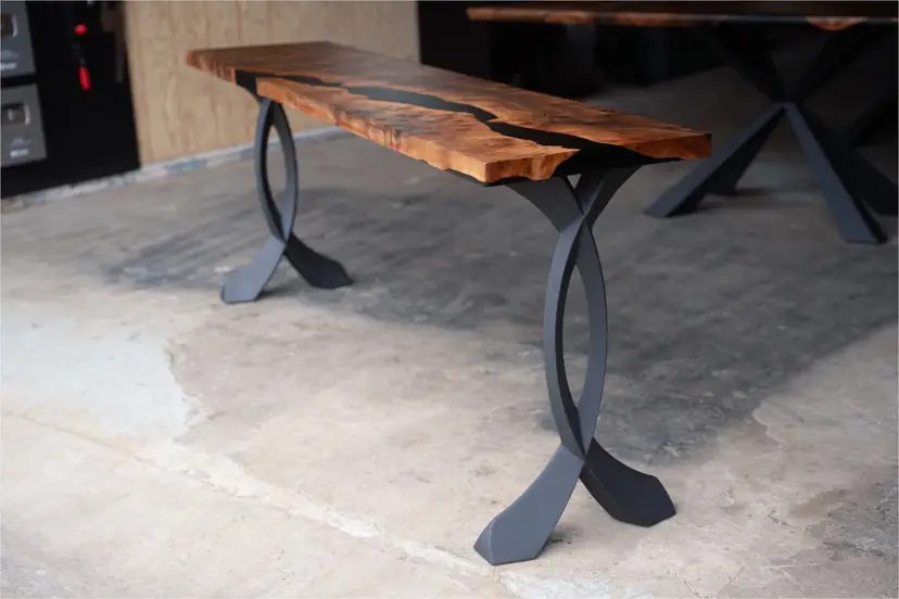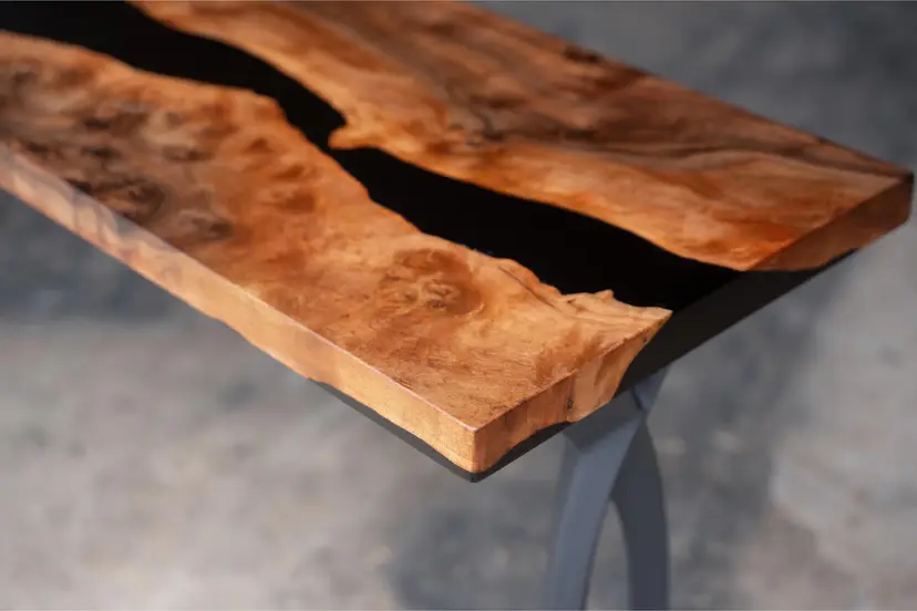This console table pairs locally sourced black walnut with black epoxy, emphasizing the wood’s natural movement through a controlled, contemporary form. Slender steel legs introduce a quiet industrial contrast while keeping the silhouette light and architectural.