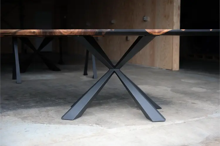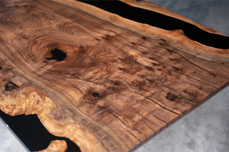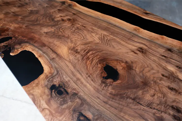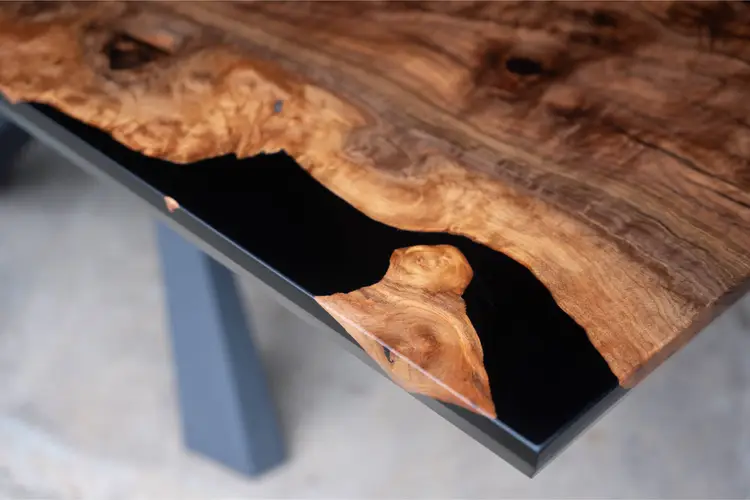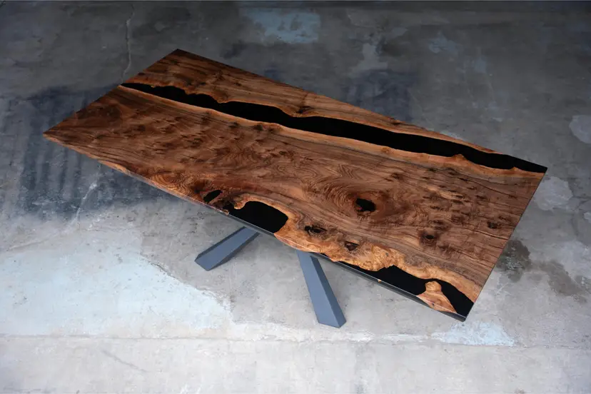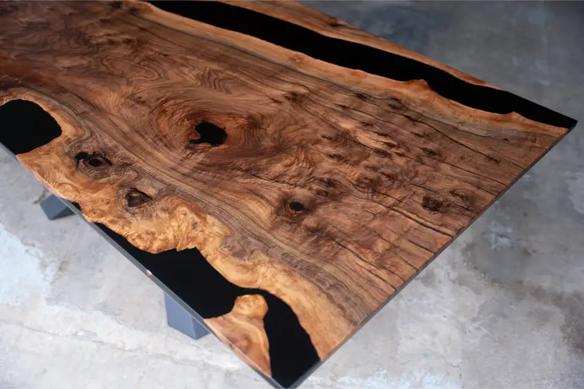 This dining table is made from black walnut with black epoxy used to preserve natural cracks and voids, highlighting the wood’s dramatic grain rather than hiding it. The result feels organic and intentional, with each detail reading as part of the material’s history.
