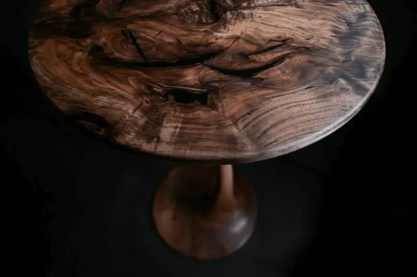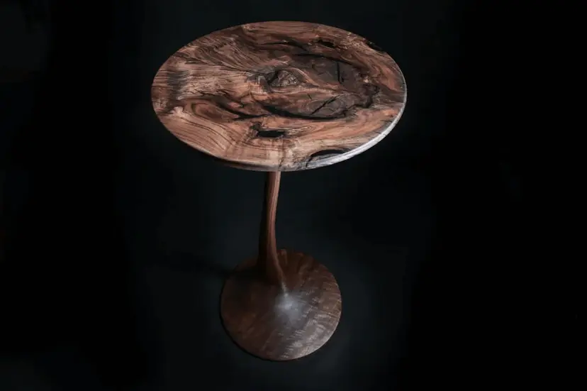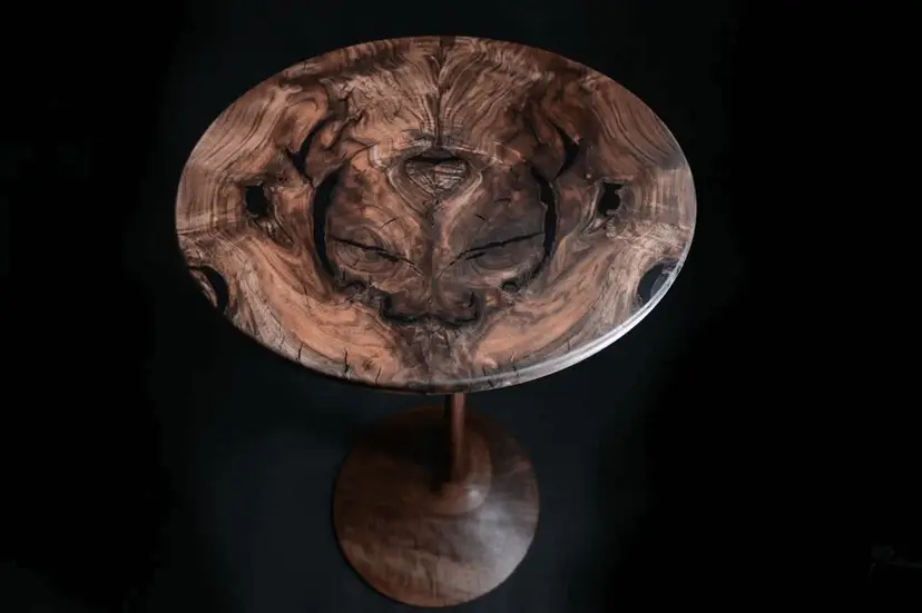One of a kind is a wild understatement when it comes to this particular piece. The top was salvaged from a burn pile, and after roughly 20 hours of painstaking labor, what you see now was created. A mirror image or “bookmatched” top with striking grain, figure, symmetry, and pitch-black epoxy filling and stabilizing every crack and void.