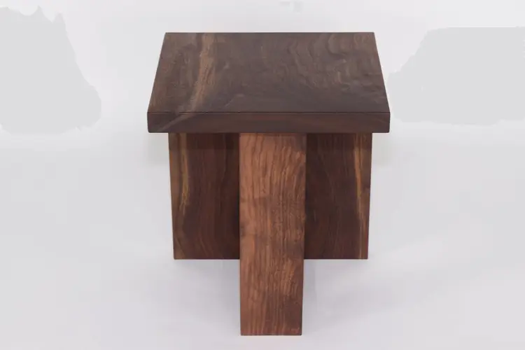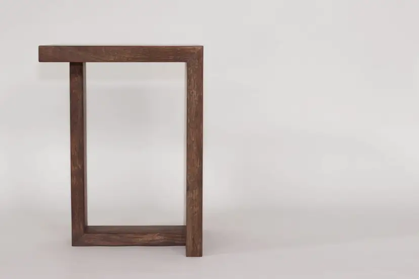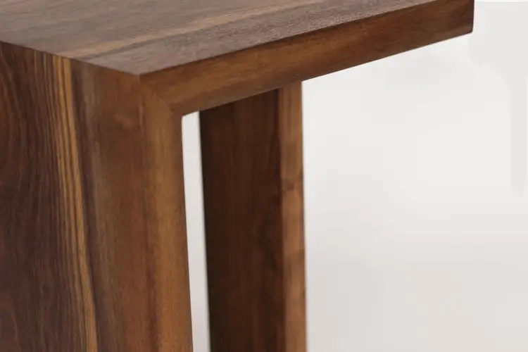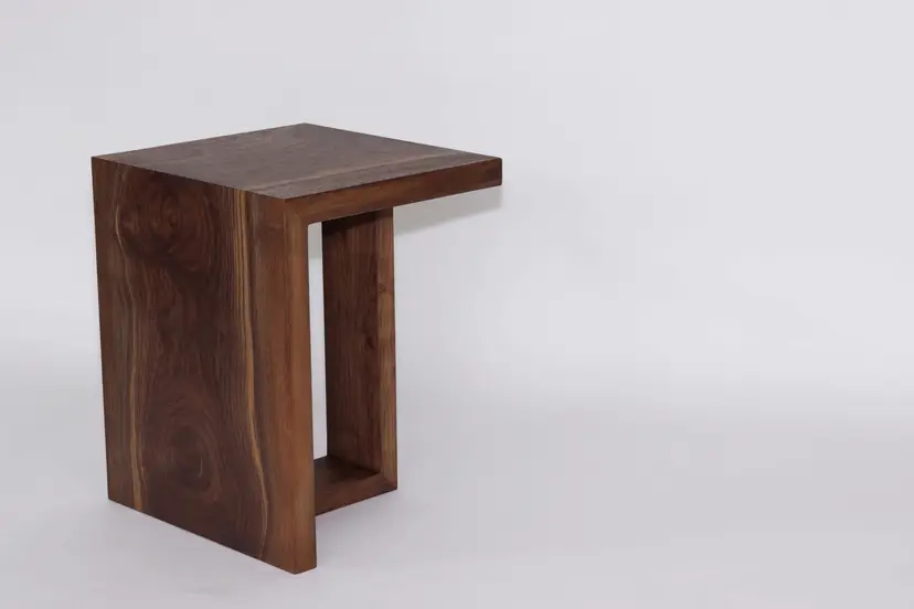 This waterfall end table is formed from a continuous slab of locally salvaged Black Walnut. Cut in such a way, there is a continuation of the grain down the front of the table. What sets this table apart is the single leg that also features a waterfall joint. Depending on where you are standing, the table appears to ‘float,’ despite being incredibly stable.