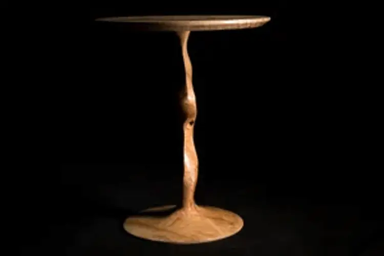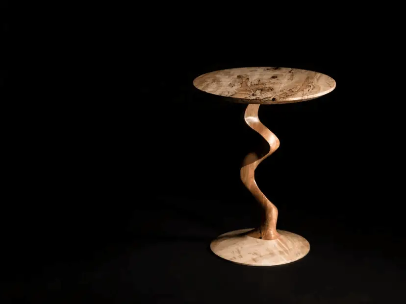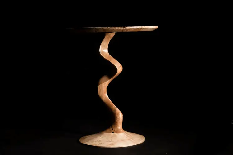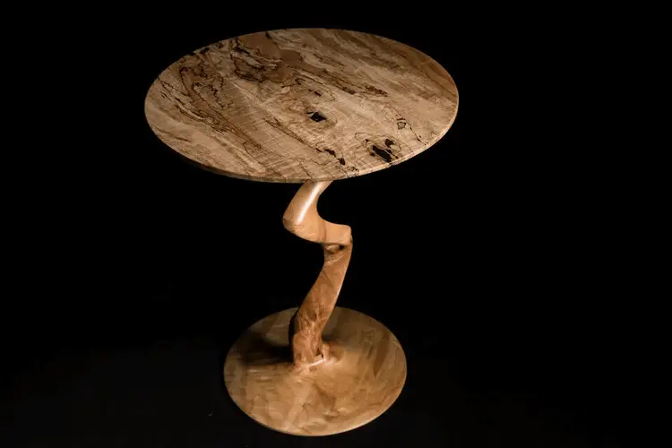 This sculpted end table is part of a series blending art with functionality. The base is hand sculpted from locally salvaged maple, then fitted to a striking spalted maple top. While it may look delicate, it is extremely sturdy and has no wobble at all. Please note that spalted maple similar to this is extremely rare and will likely not be possible for a custom order. Please don’t hesitate to email to discuss further though.