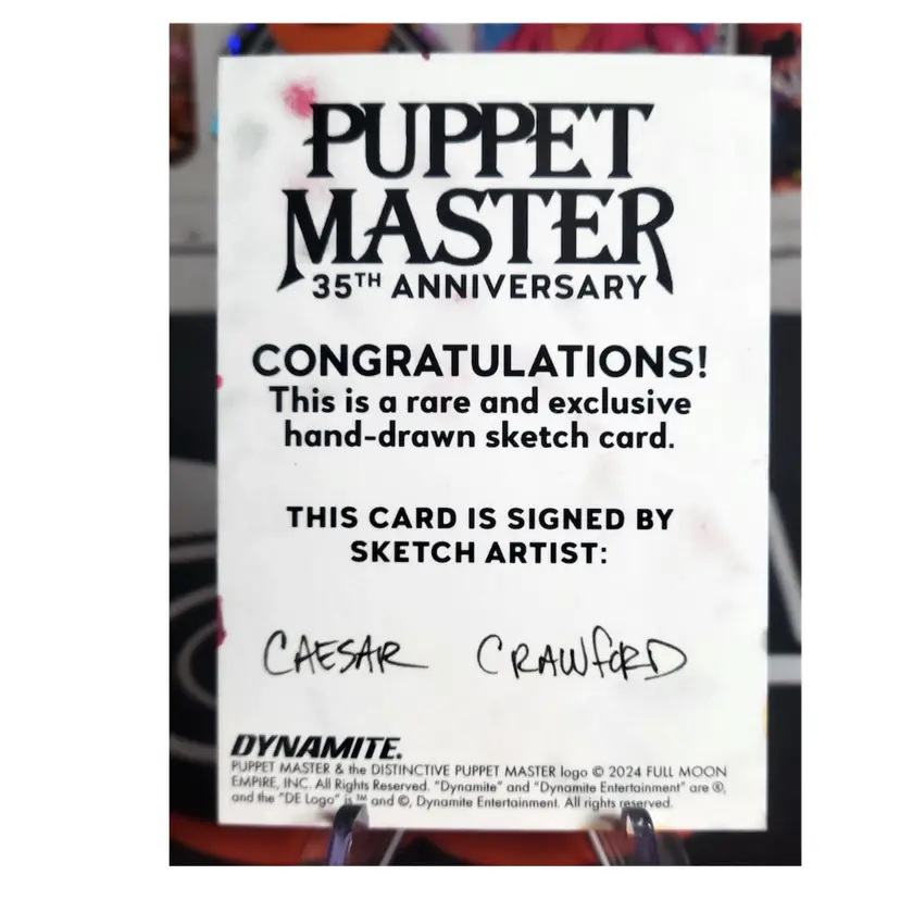 Own a 1-of-1 original hand-drawn sketch card from the Puppet Master 35th Anniversary set! This card features Blade, beautifully illustrated by Caesar Crawford and officially licensed by Dynamite Entertainment. A true centerpiece for any Puppet Master, horror, or sketch card collection.