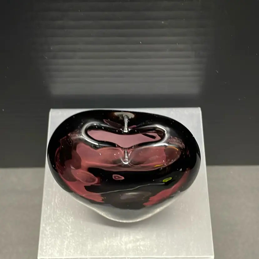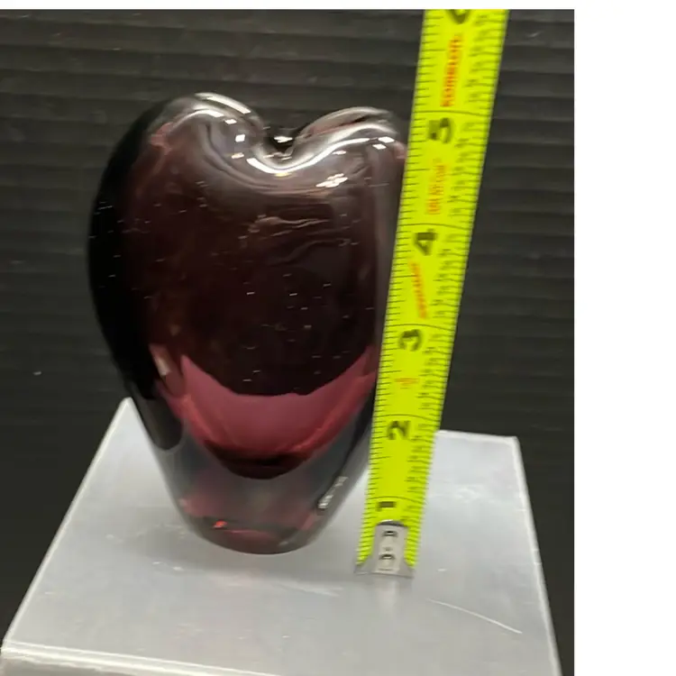 This is a vintage Blenko Amethyst Purple Heart vase. It is a handblown art glass piece. The vase is made in the United States. It is part of the Blenko product line. The vase features a heart pattern and a beautiful purple color. There are a few light scratches on the bottom.