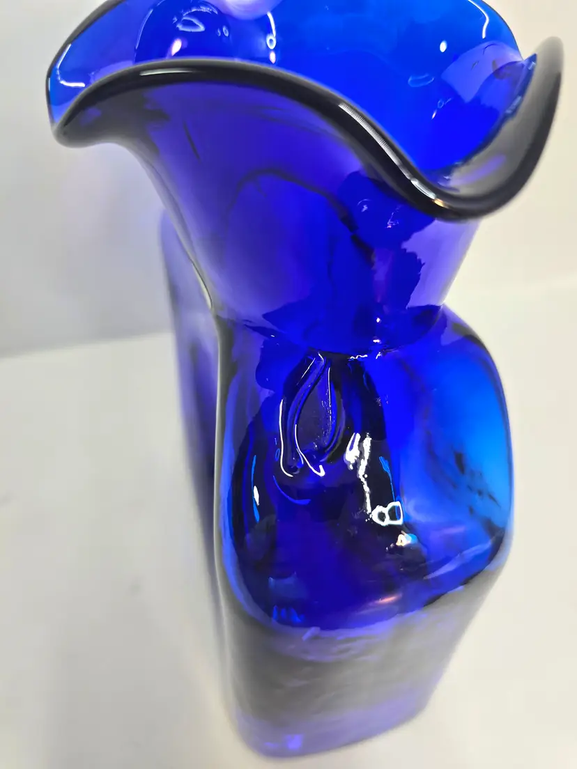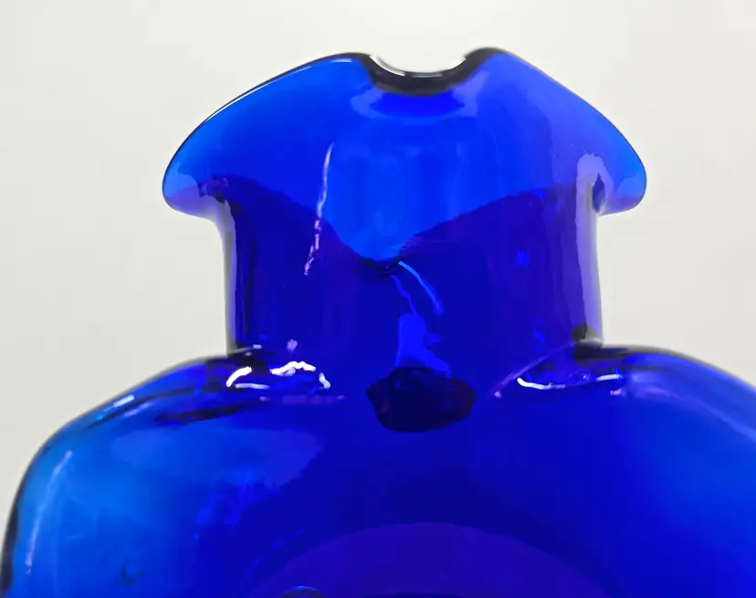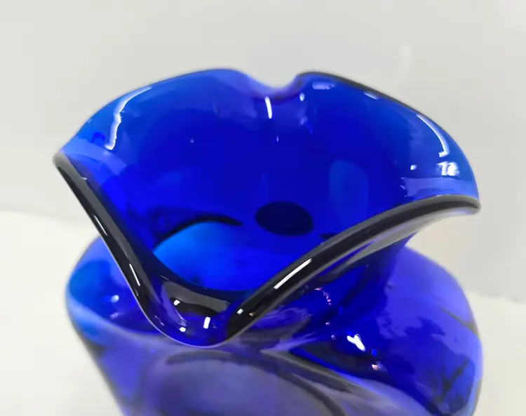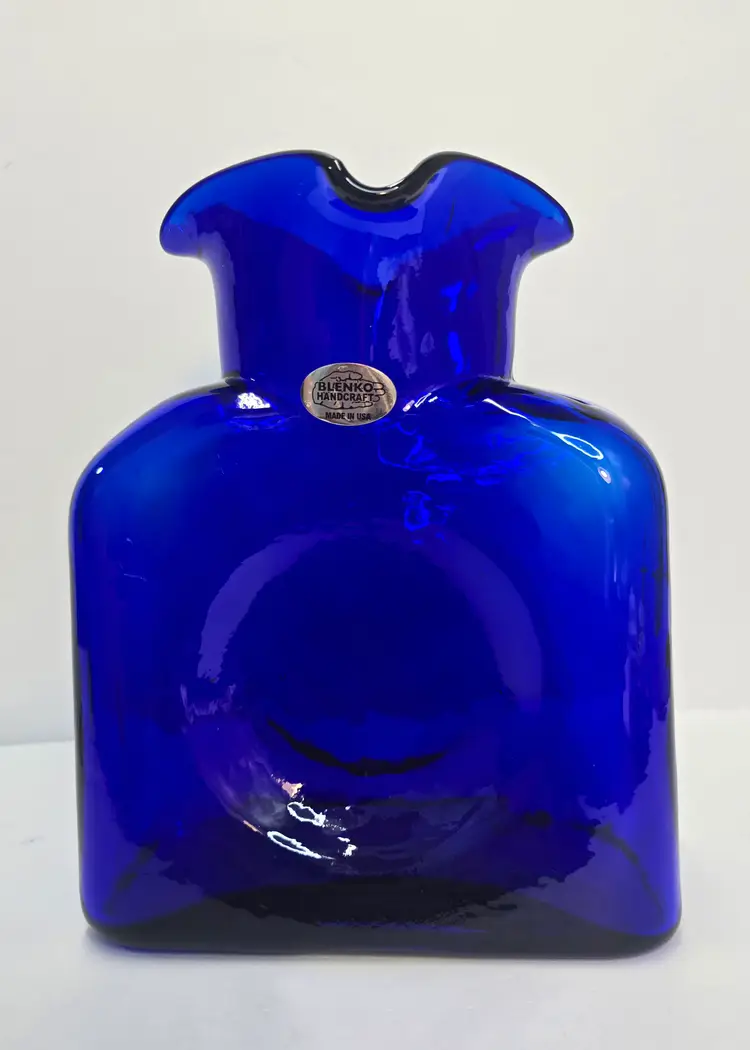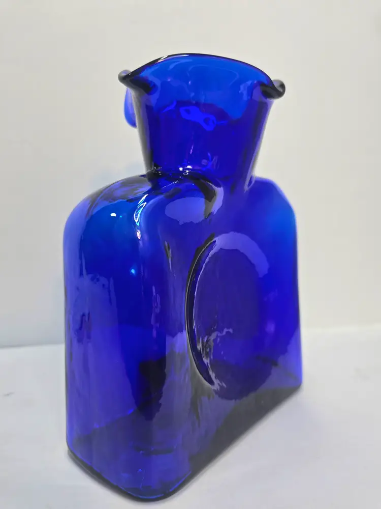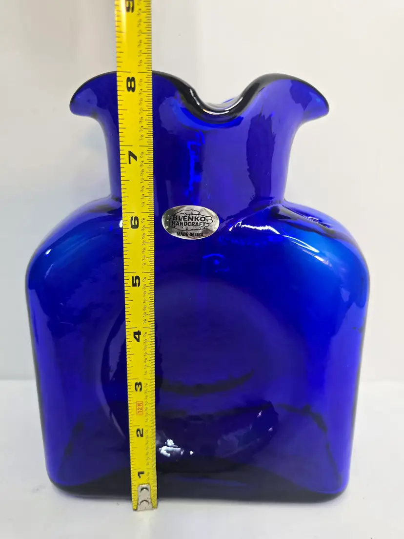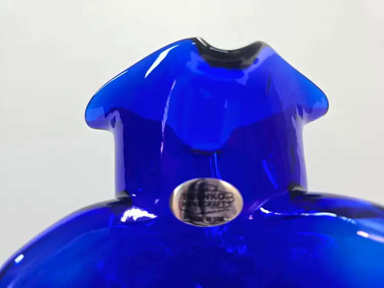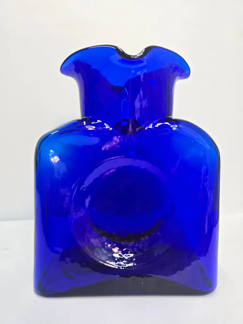 This Blenko 4 Spout Blown Glass Cobalt Blue Water Bottle Vase is a unique and highly collectible handmade piece and was created by the Blenko Glass Company in Milton, West Virginia. This water bottle vase features four pouring spouts, a thumb support area and a glossy finish, and is made of hand-blown cobalt blue glass. The vase also comes with an etched date on the bottom, label on neck and Gift Shop Card. This experimental? piece is easy to fill and provides a stylish and functional addition to any decor.