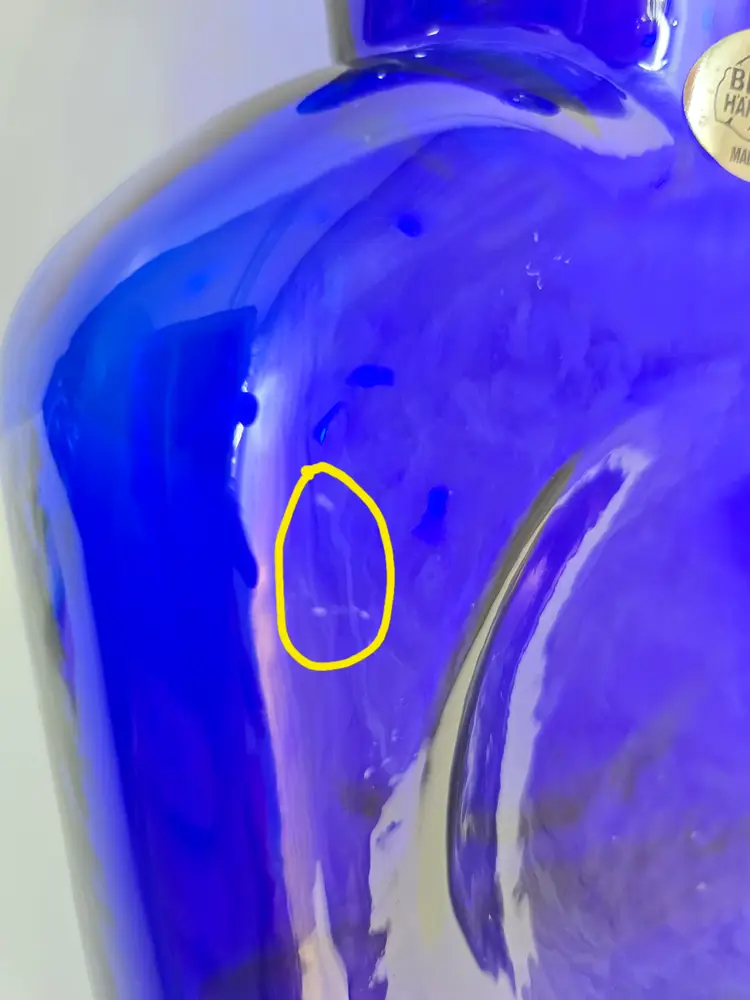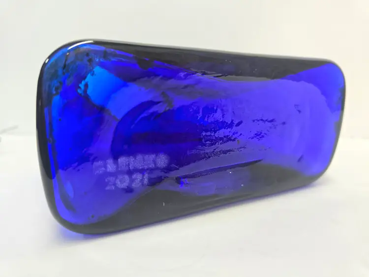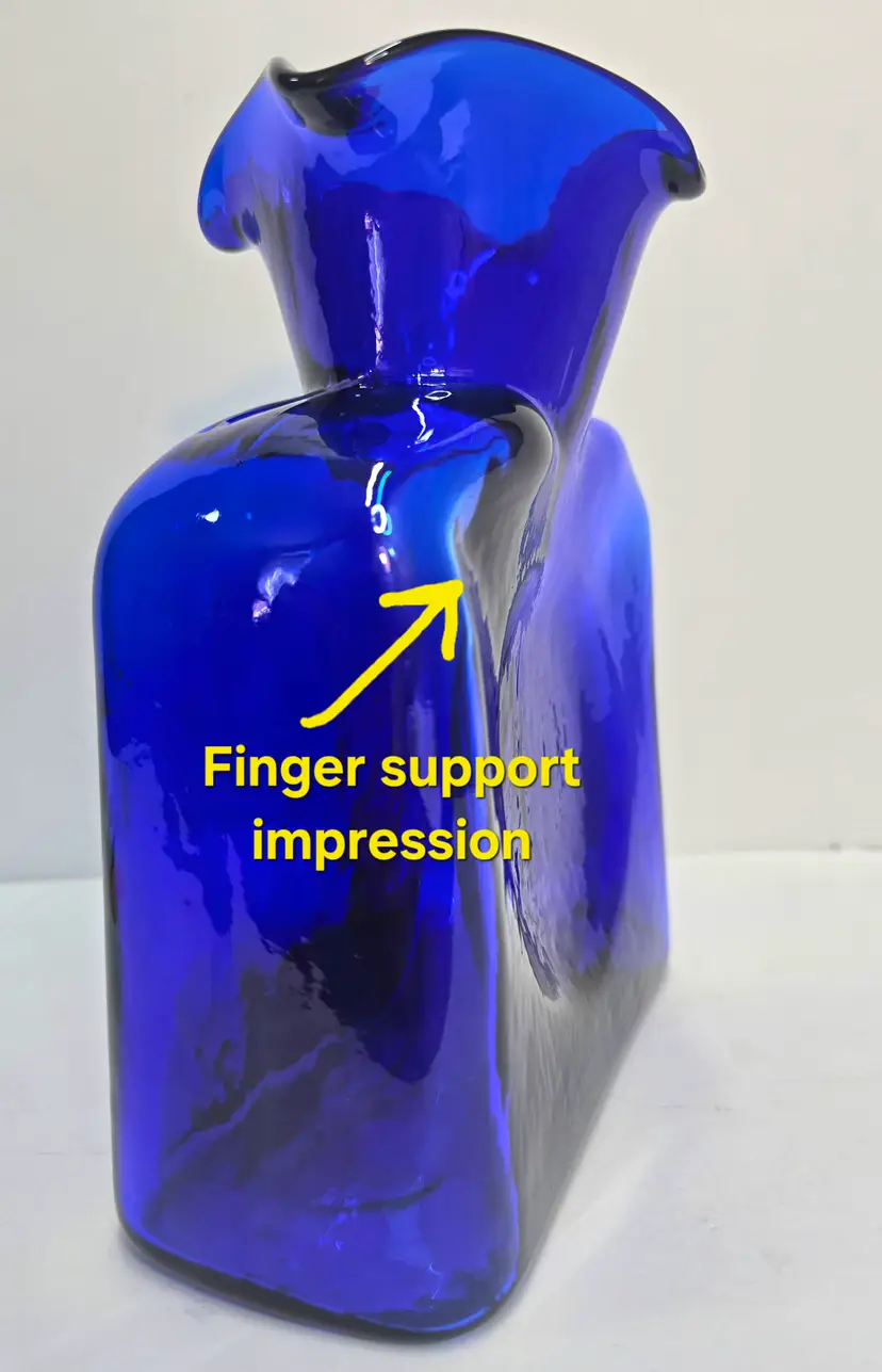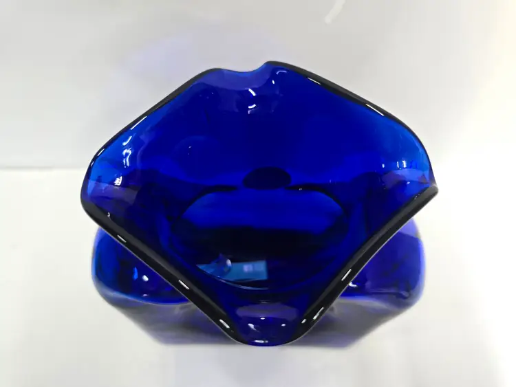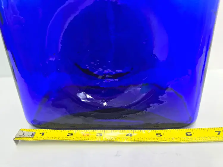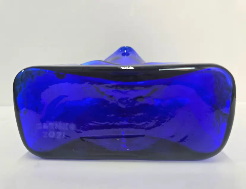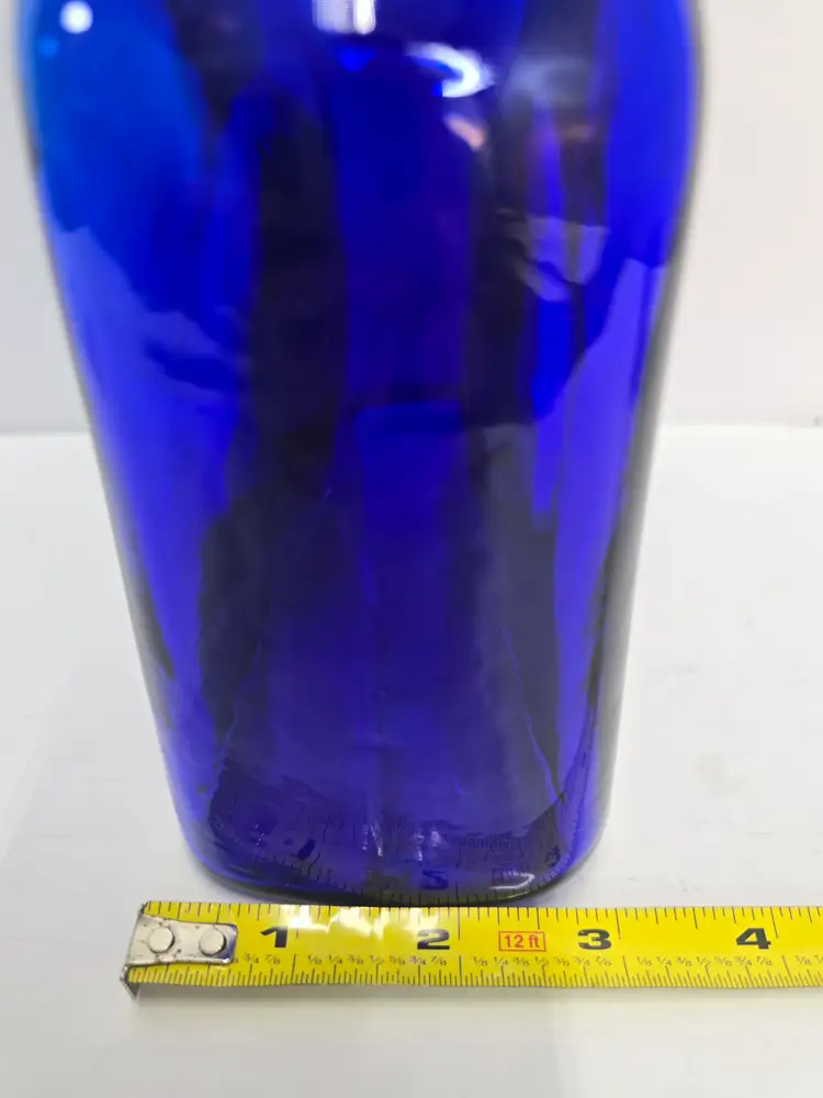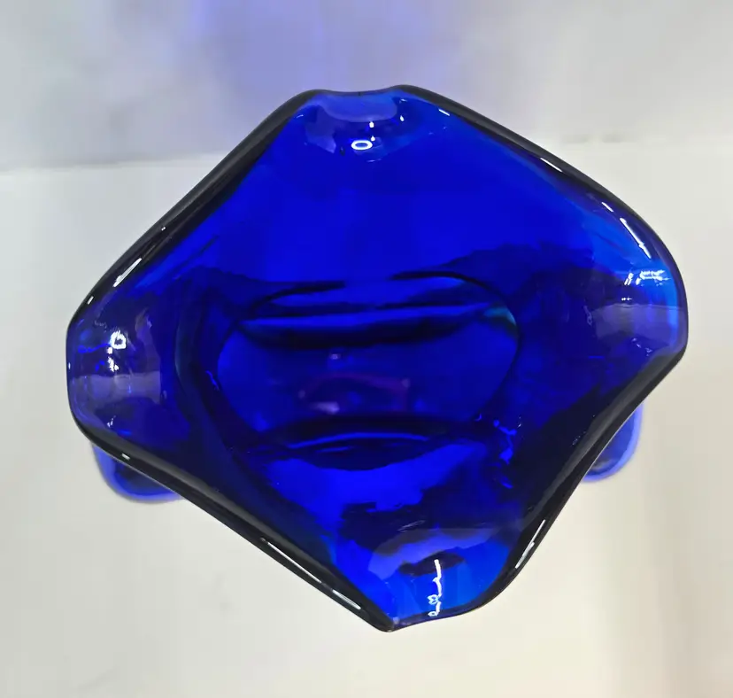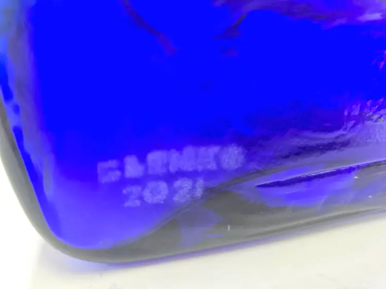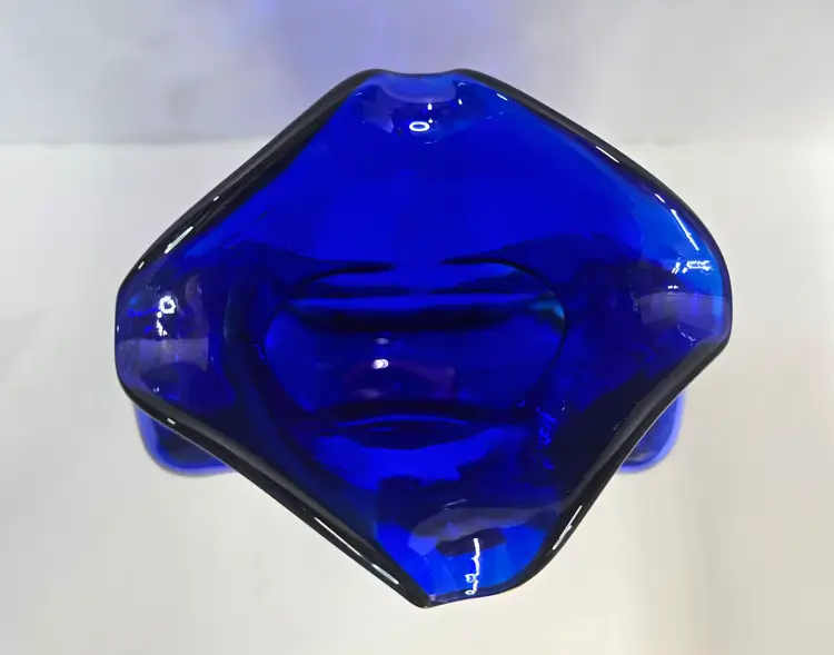 This Blenko 4 Spout Blown Glass Cobalt Blue Water Bottle Vase is a unique and highly collectible handmade piece and was created by the Blenko Glass Company in Milton, West Virginia. This water bottle vase features four pouring spouts, a thumb support area and a glossy finish, and is made of hand-blown cobalt blue glass. The vase also comes with an etched date on the bottom, label on neck and Gift Shop Card. This experimental? piece is easy to fill and provides a stylish and functional addition to any decor.