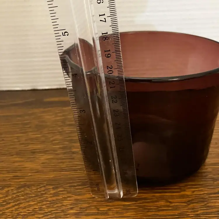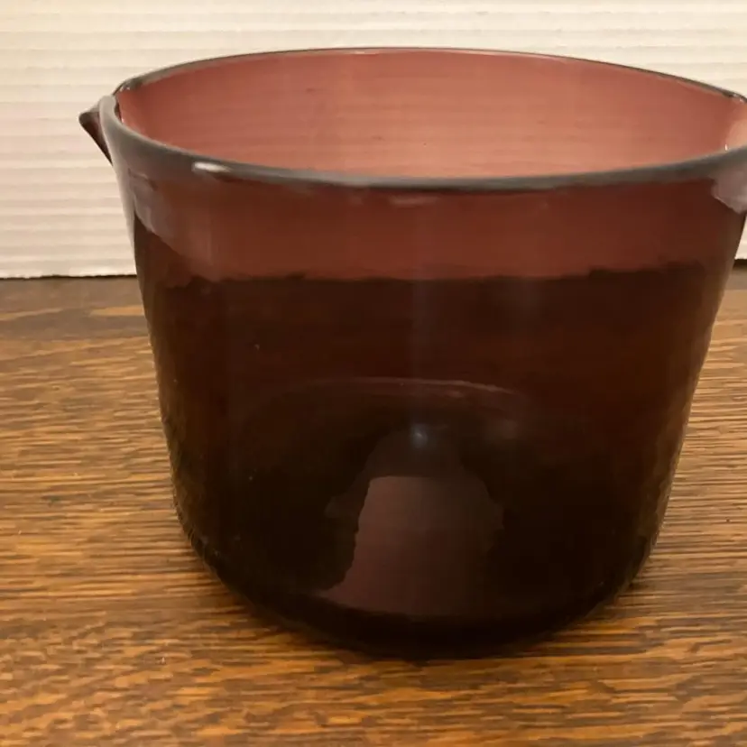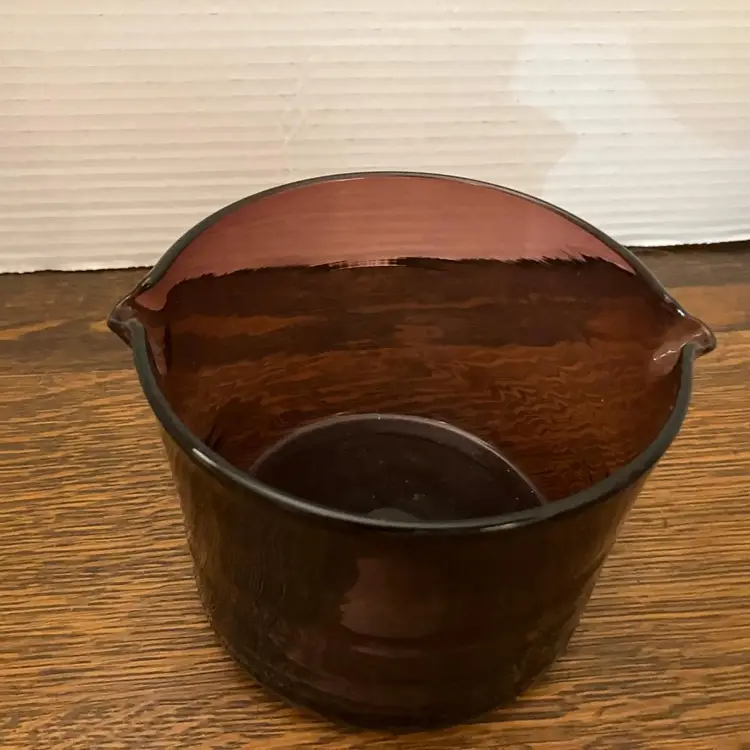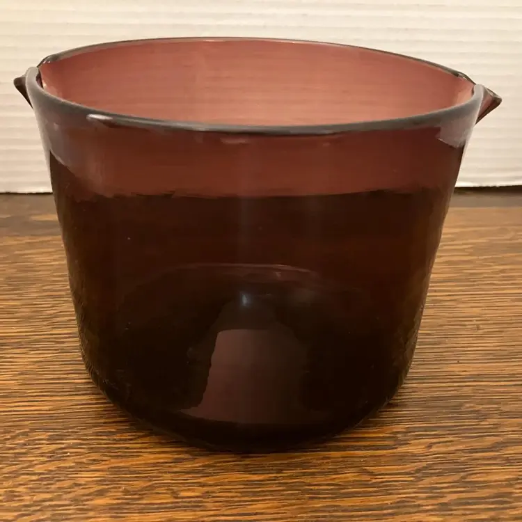 Blenko art glass amethyst wine rinse. This piece was part of the Williamsburg Collection in the middle part of the 50s and the early part of the 60 s. The Williamsburg collection was developed by Blenko from fragments found in the ruins of the colonial city and was authorized by the Williamsburg Association, to reproduce certain pieces. This piece was originally used as a wine glass rinse. When Changing courses at dinner, the wine was changed as well. The rim of the wine glass was dipped into the vessel to clean it before the new wine was poured. This piece measures approximately 5 inches in height and 5 inches in diameter. and in very good condition, without chips or cracks. This piece can be seen in the 1957 Blenko Catalog on page 26 item CW-7