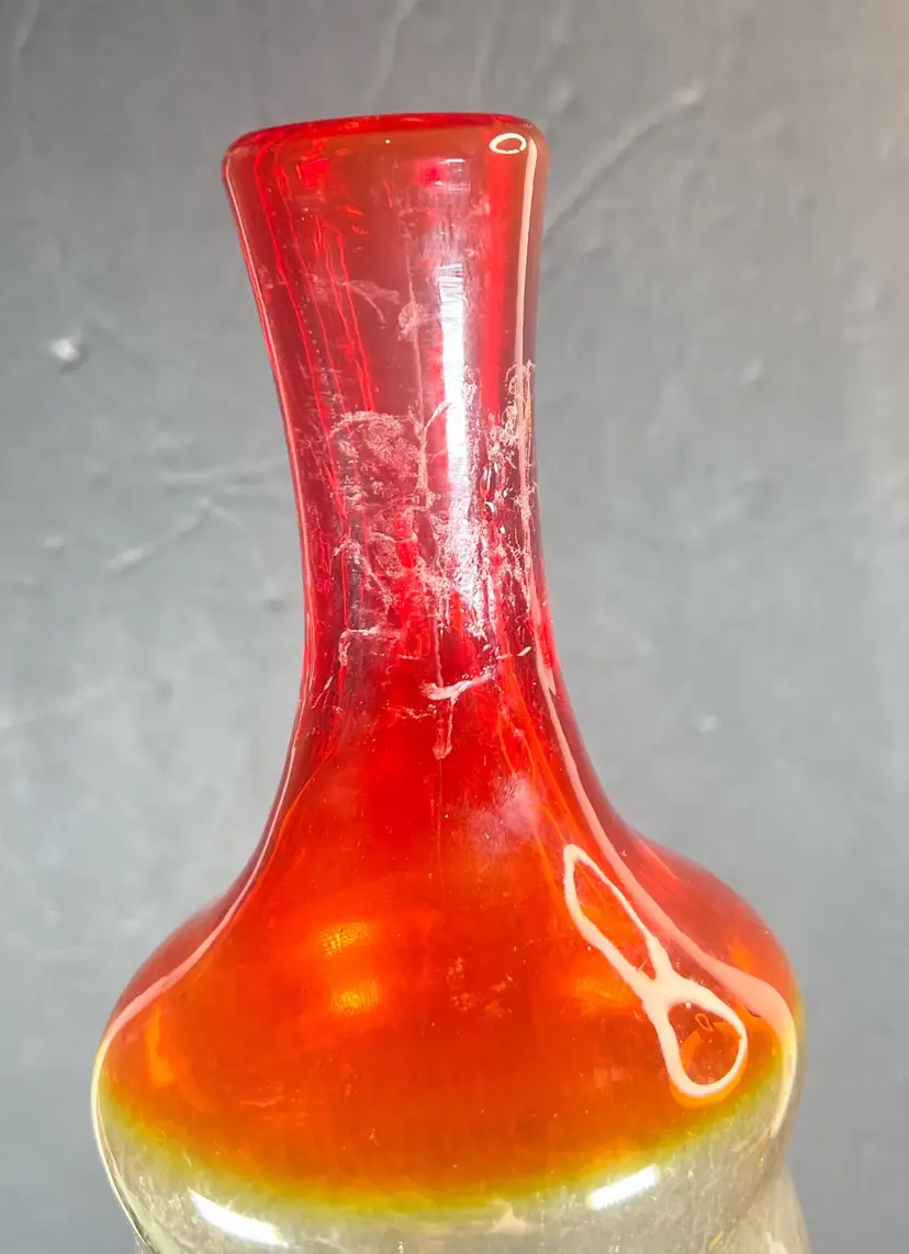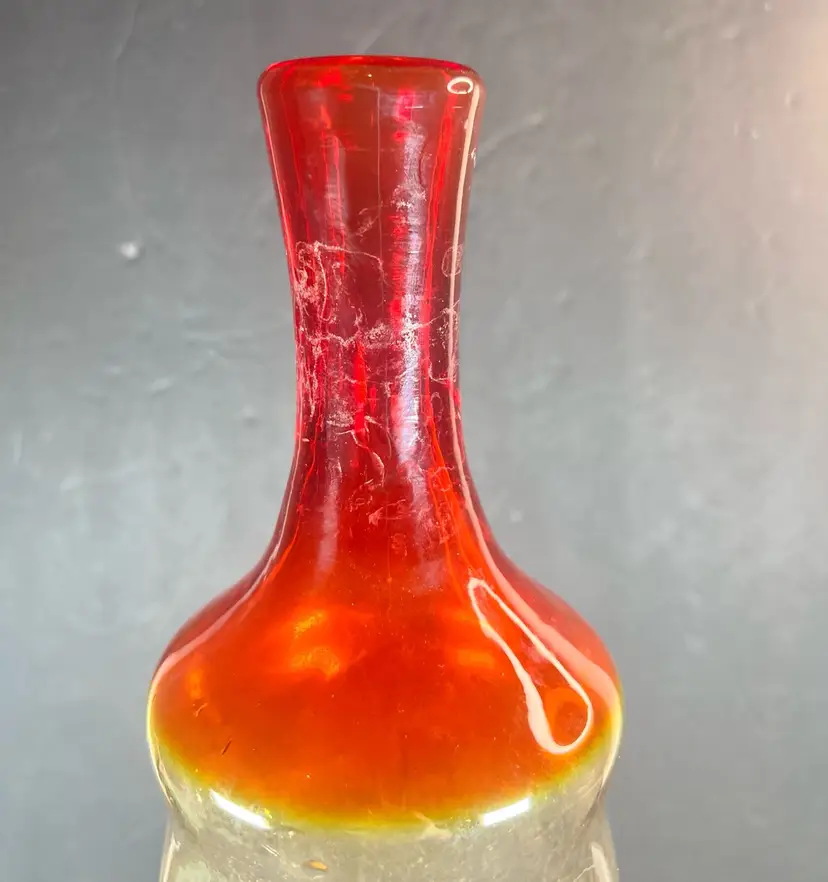 Add some vintage charm to your barware collection with this Blenko Beehive Decanter in Tangerine color. Crafted in the mid-century modern style, this hand-blown glass decanter is part of the Century product line from the original manufacturer. The decanter stands tall at 16" H with an item length of 6” W and an unknown capacity.