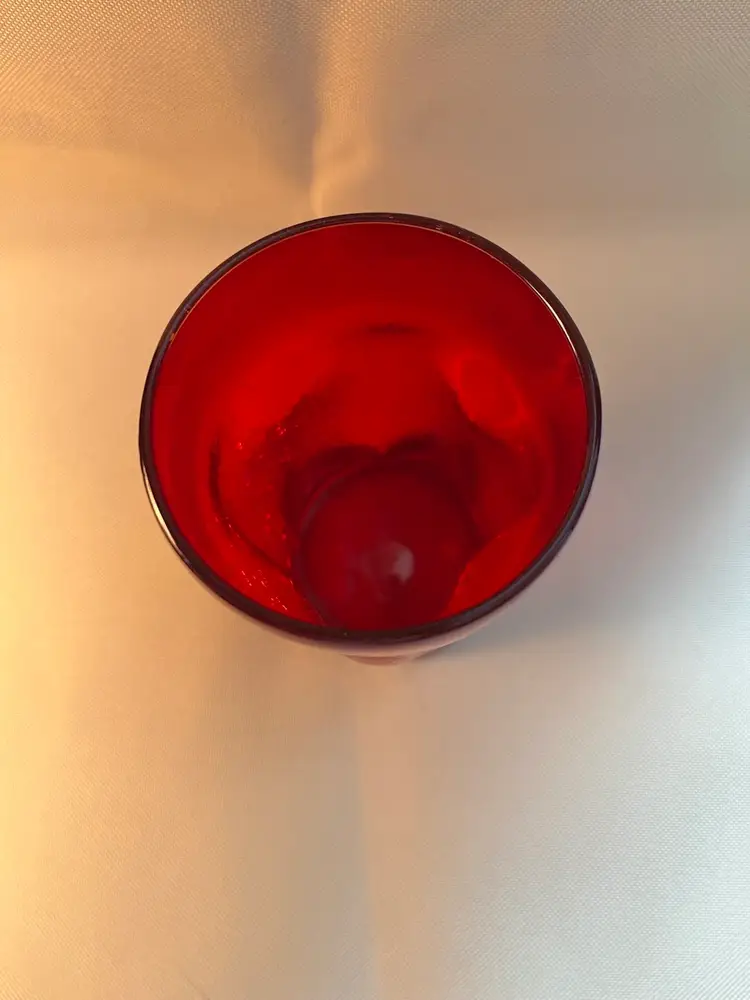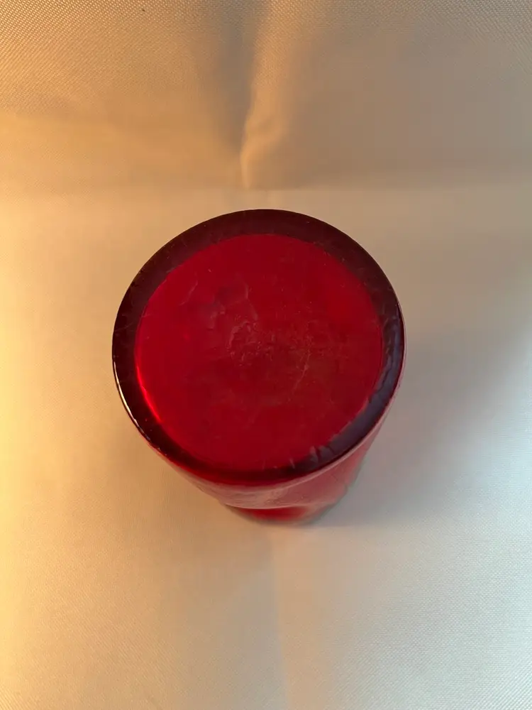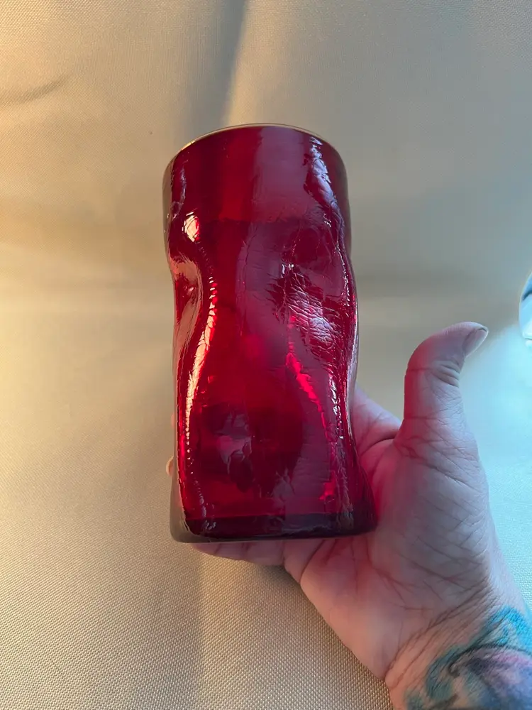 Red Blenko crackle pinched 5 1/2” tall tumbler glass